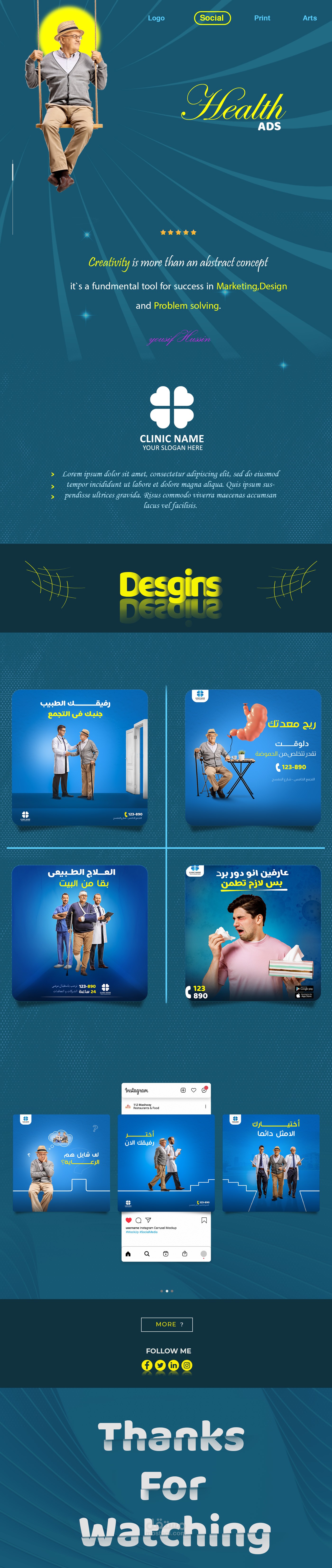 مجموعة من تصميمات السوشيال ميديا لعيادة طبية متخصصة لرعاية كبار السن