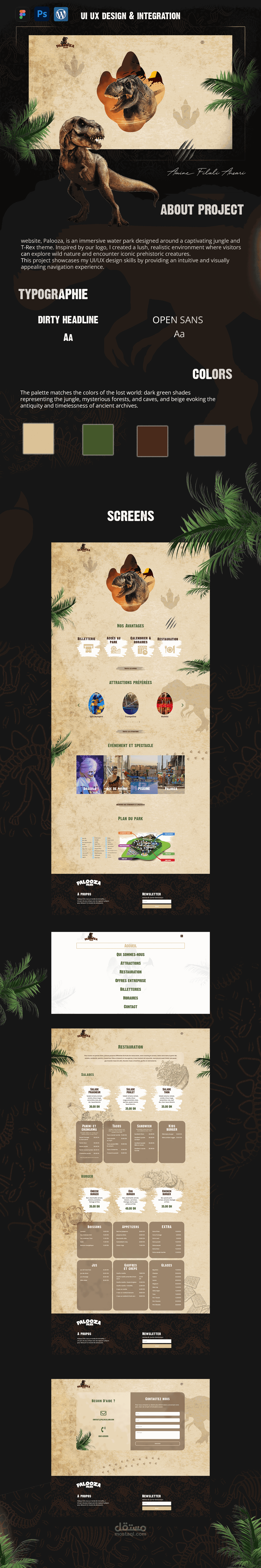 موقع Palooza هو منتزه مائي غامر مصمم حول موضوع غابة آسرة وتيرانوصور. مستوحى من شعارنا، قمت بإنشاء بيئة غنية وواقعية حيث يمكن للزوار استكشاف الطبيعة البرية ومواجهة مخلوقات ما قبل التاريخ الشهيرة. يعرض هذا المشروع مهاراتي في تصميم واجهة المستخدم وتجربة المستخدم من خلال تقديم تجربة تنقل بديهية وجذابة بصريًا.