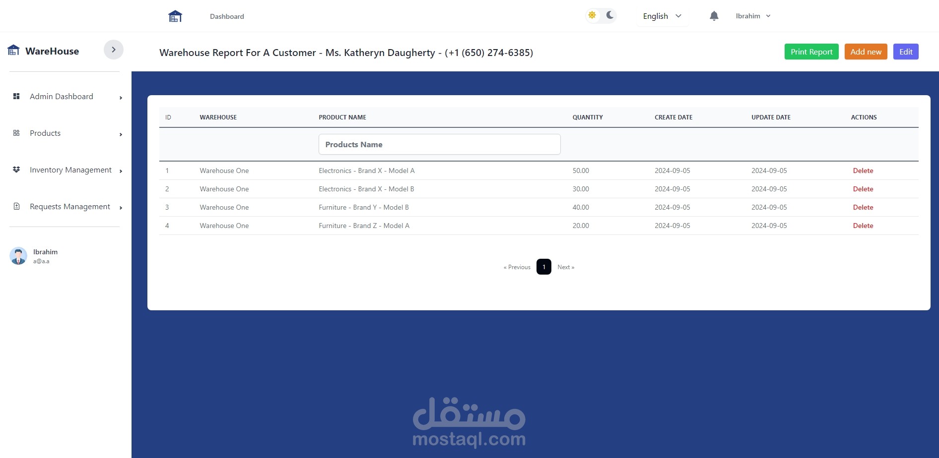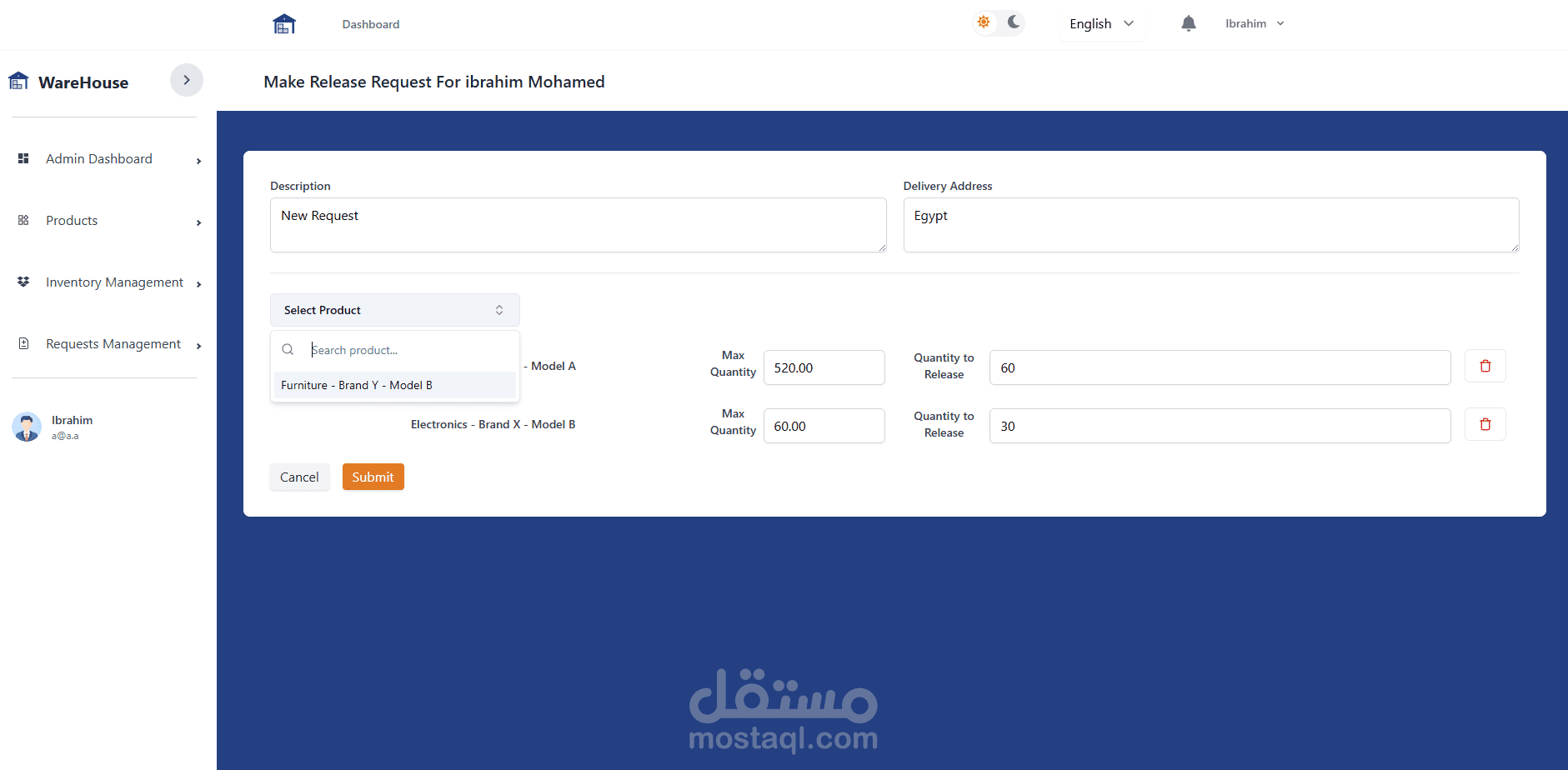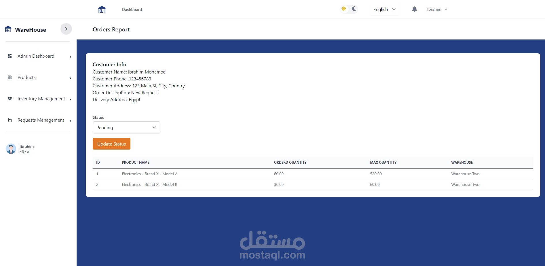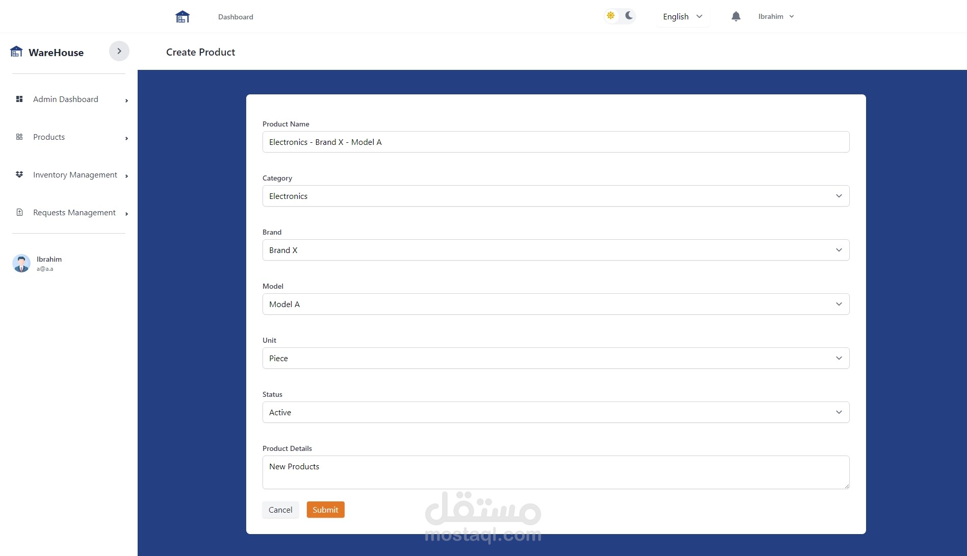 لقد قمت بتطوير نظام شامل لإدارة المخازن باستخدام Laravel وReact، يتضمن النظام العديد من المميزات المتقدمة التي تسهم في إدارة عمليات المخازن بكفاءة وسلاسة، بالإضافة إلى دعم كامل لنظام صلاحيات المستخدمين وإمكانية التبديل بين الوضع الداكن والفاتح، مع دعم اللغتين العربية والإنجليزية.