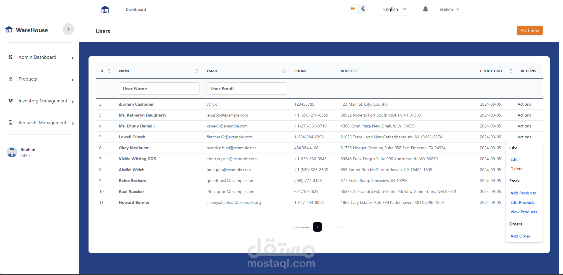 دراسة احتياجات إدارة المخازن وتحديد المتطلبات الأساسية التي تشمل تتبع المخزون، التعامل مع العملاء، إضافة المنتجات، واضافة المنتجات والإرجاع.