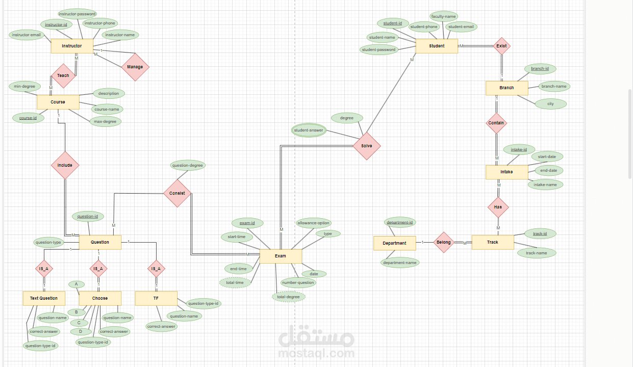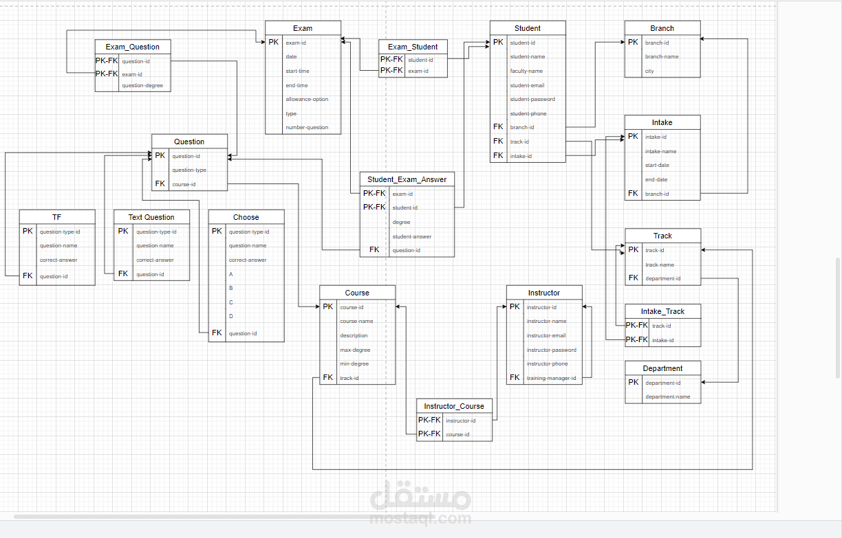 إنشاء نظام قاعدة بيانات متكامل لإدارة معلومات الامتحانات، بما في ذلك الأسئلة، الطلاب، النتائج، والمزيد، باستخدام SQL Server.