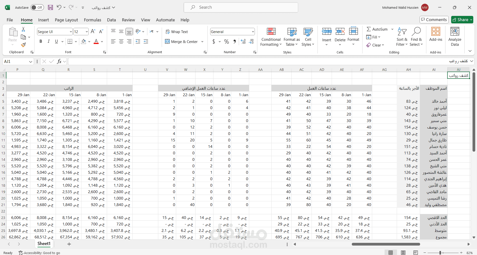 اسم الموظف، الأجر بالساعة، عدد ساعات العمل، عدد ساعات العمل الإضافي، الراتب، مكافأة العمل الإضافي، الراتب الكلي للأسبوع، الراتب الكلي.