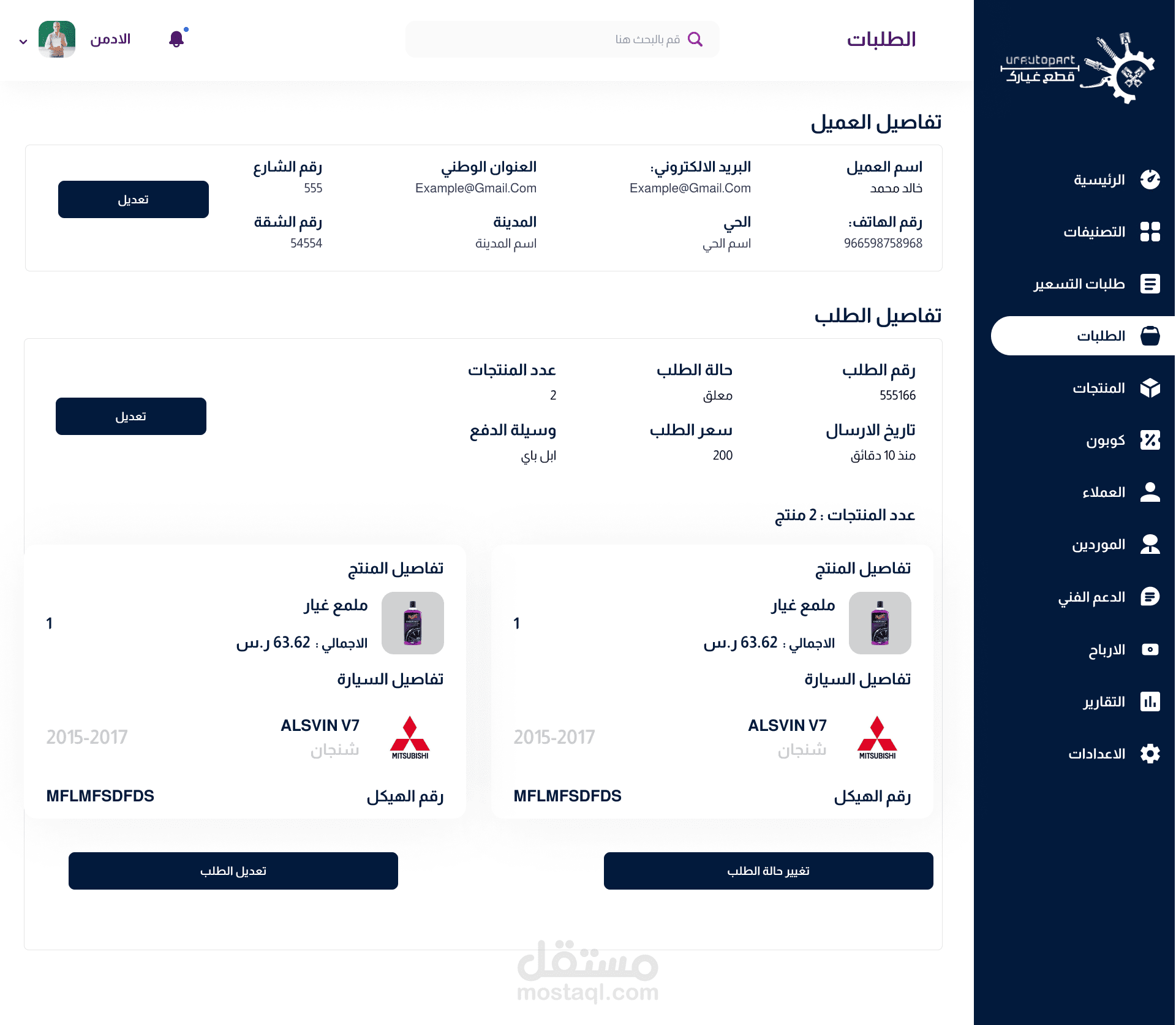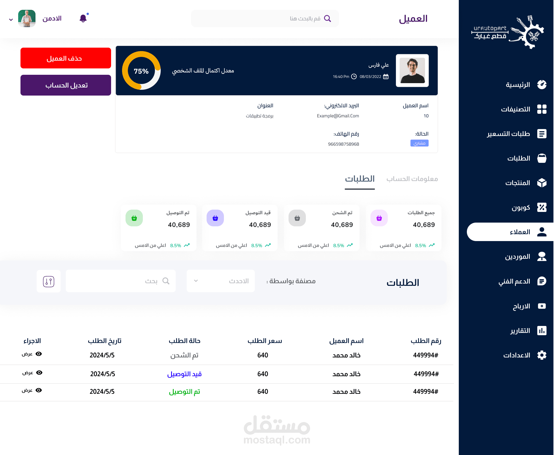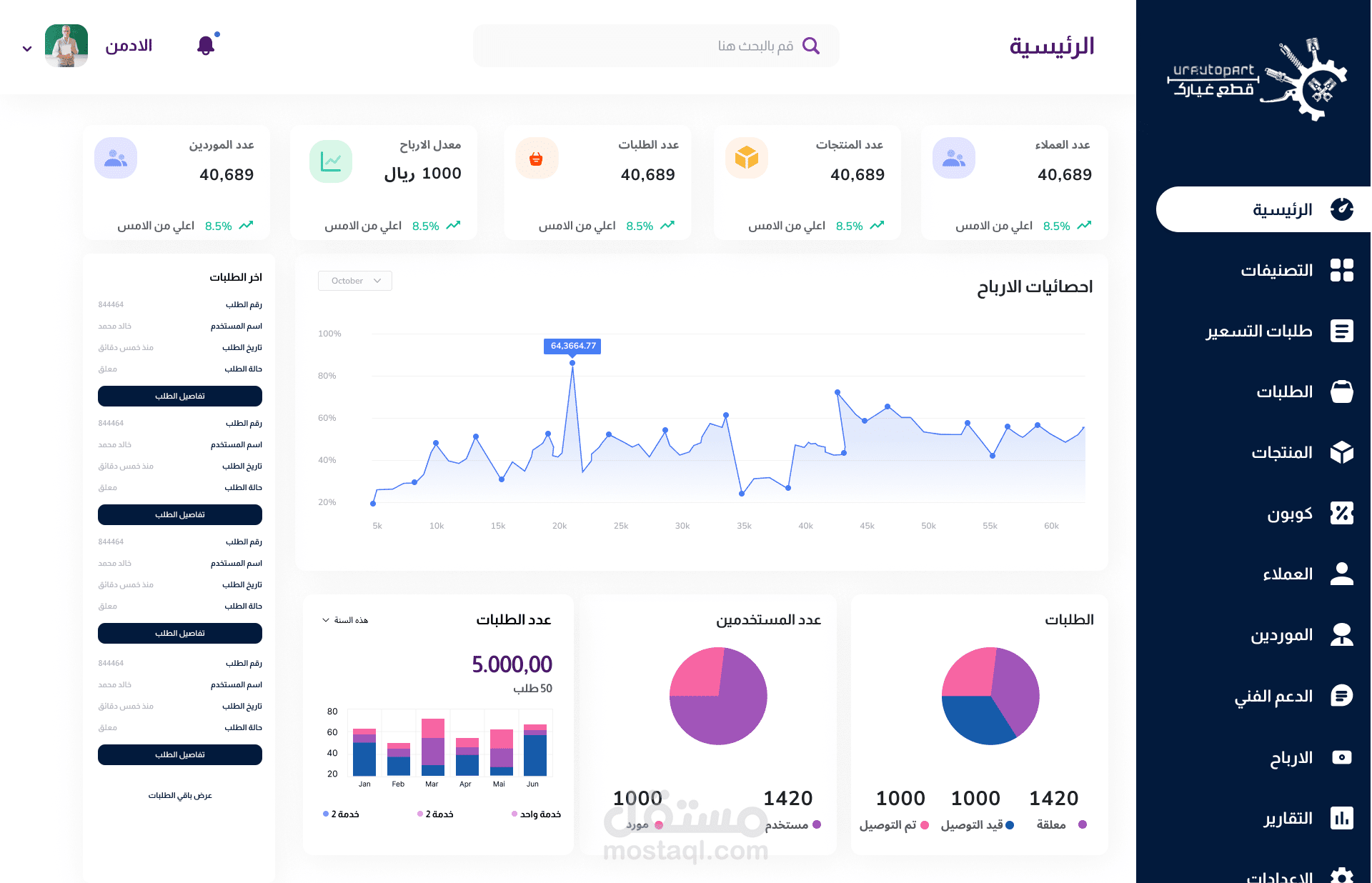 كمصمم محترف في واجهات المستخدم وتجربة المستخدم (UI/UX)، قمت بتطوير داشبورد مخصص لإدارة تطبيق قطع الغيار، يوفر للمستخدمين أدوات قوية لإدارة المخزون، ومراقبة الطلبات، وتحليل البيانات بكل سهولة وفعالية. يهدف الداشبورد إلى تحسين عمليات الإدارة وتعزيز الكفاءة التشغيلية.
