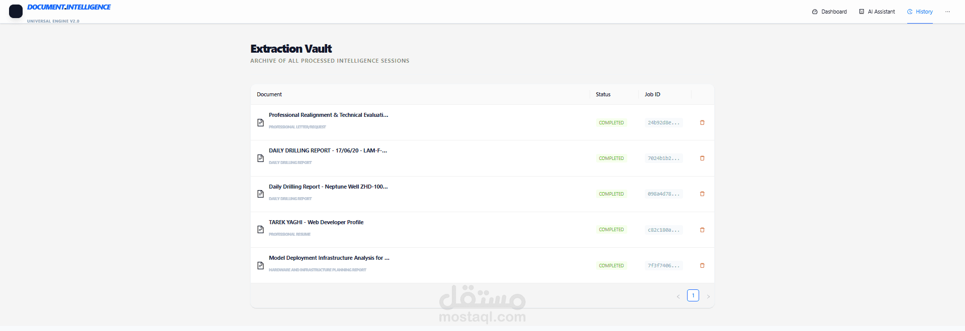 Extraction Vault (Archive): Complete history of all processed documents with status (Completed), Job ID, and one-click access.