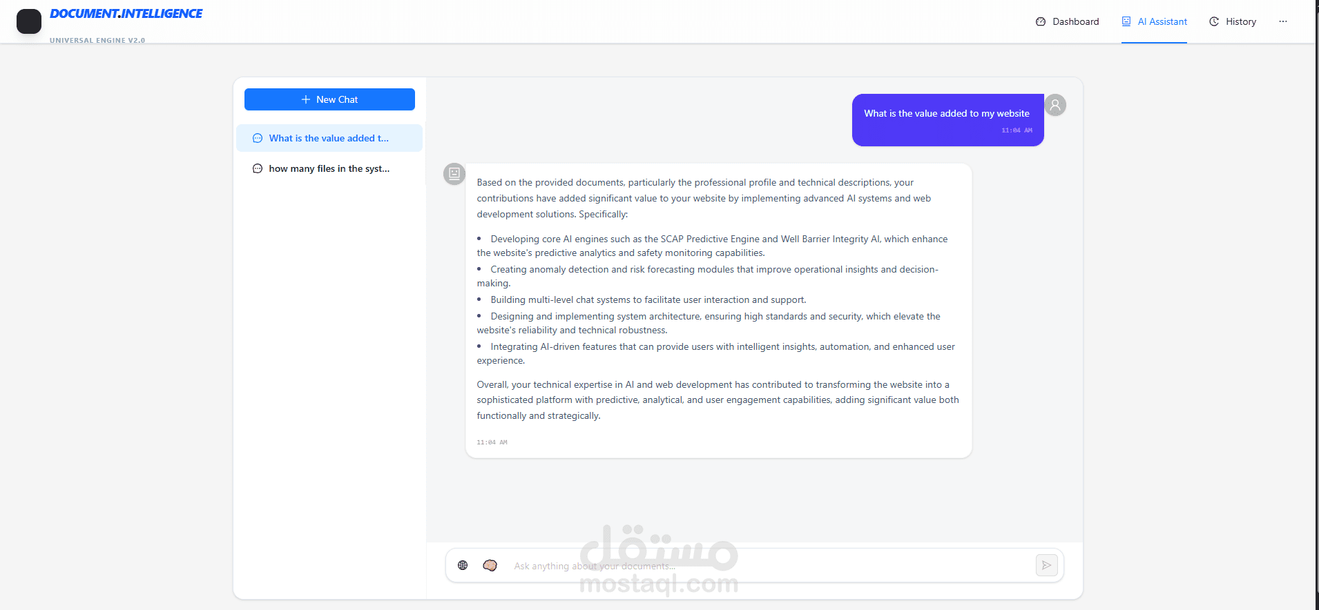 AI Chat Assistant (RAG): Intelligent conversational interface that answers questions about uploaded documents, explains value added, and provides professional insights (e.g., “What is the value added to my website?” or “How many files do we have in the system?”).