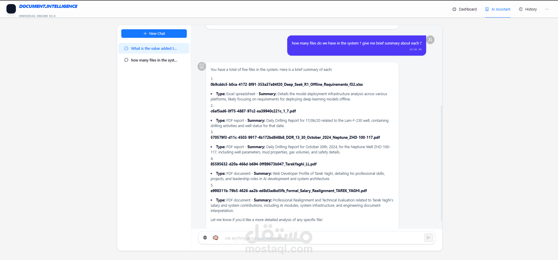 Multi-Document Intelligence: Automatically detects and summarizes all files in the system (Excel reports, Daily Drilling Reports, CVs, salary realignments, etc.) with clear metadata and key points.