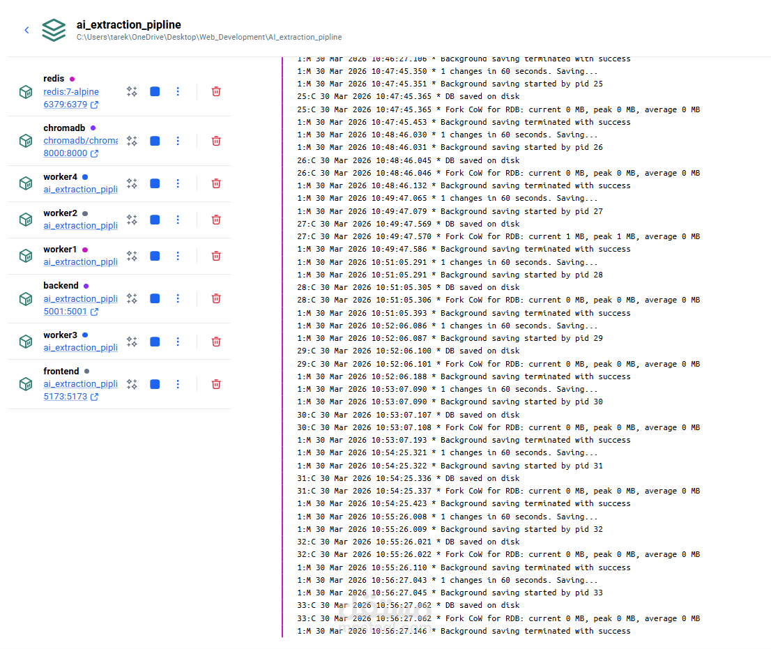 Full Backend Monitoring: Live terminal view showing Redis, ChromaDB, 4 AI extraction workers, backend, and frontend services running in parallel with background saving and database operations.