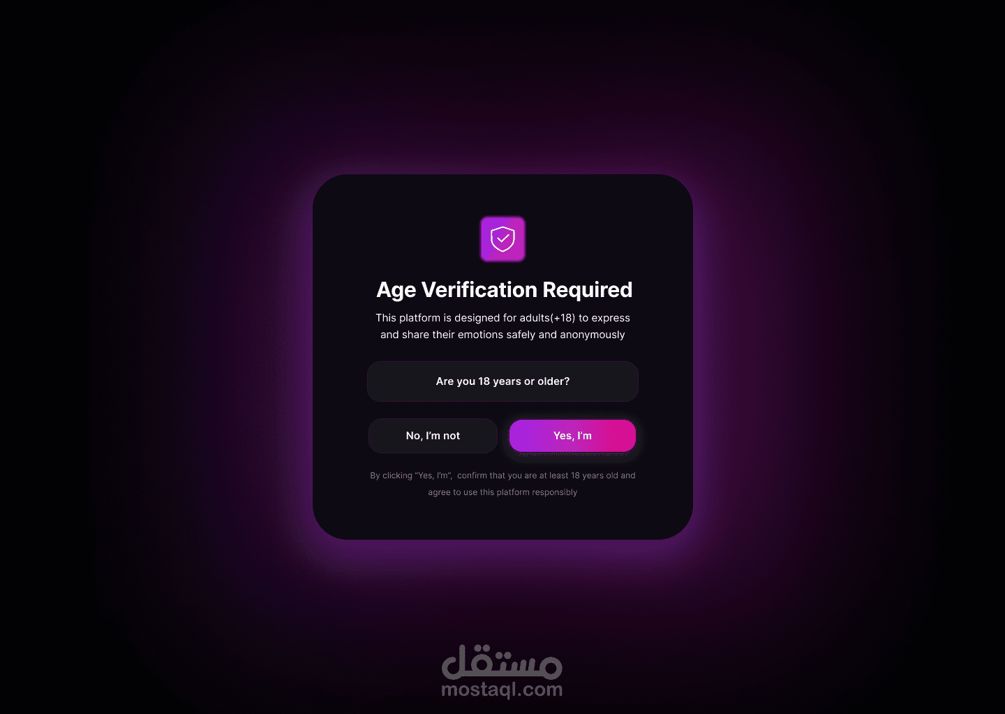 قمت بتصميم واجهة مستخدم لصفحة التحقق من العمر (+18) مخصصة للمنصات التي تتطلب التأكد من أهلية المستخدم قبل الدخول، مع الحفاظ على مظهر عصري وإحساس بالخصوصية والأمان.