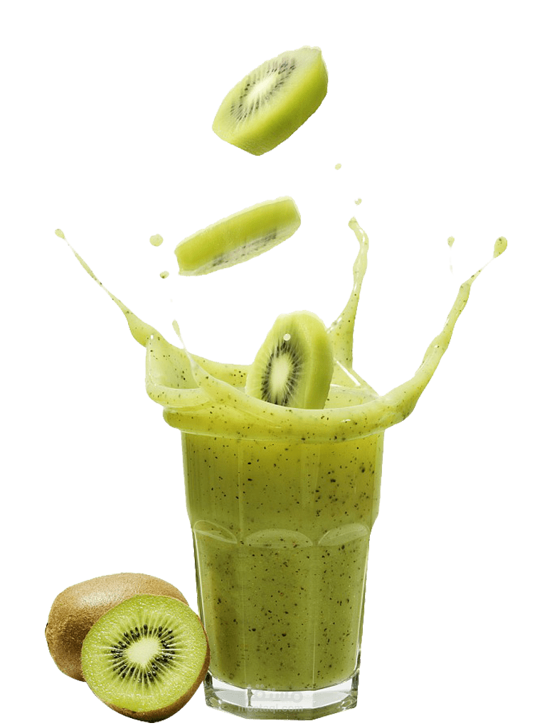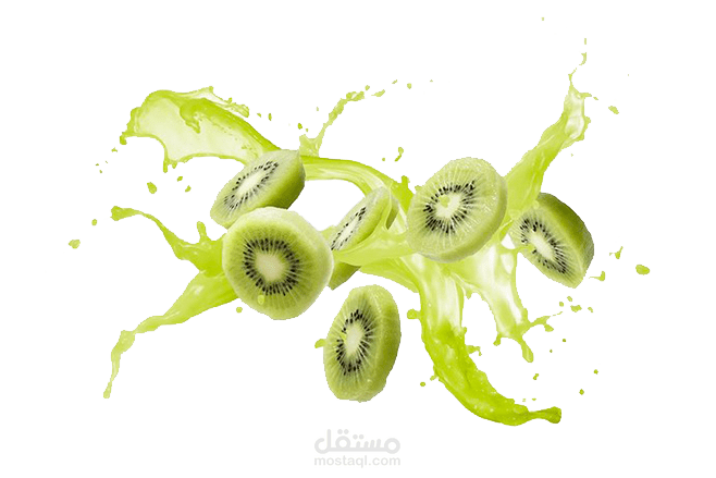 العناصر المتناثرة في التصميم، مثل شرائح الكيوي والأوراق الخضراء المتطايرة، تضيف حيوية وديناميكية للمشهد، وتشير إلى نكهة الفاكهة المنعشة التي قد يحتوي عليها المشروب. يبدو أن الهدف من التصميم هو إبراز هذا المشروب على أنه منعش ومليء بالحياة، مع التركيز على الطابع الطبيعي والعضوي.