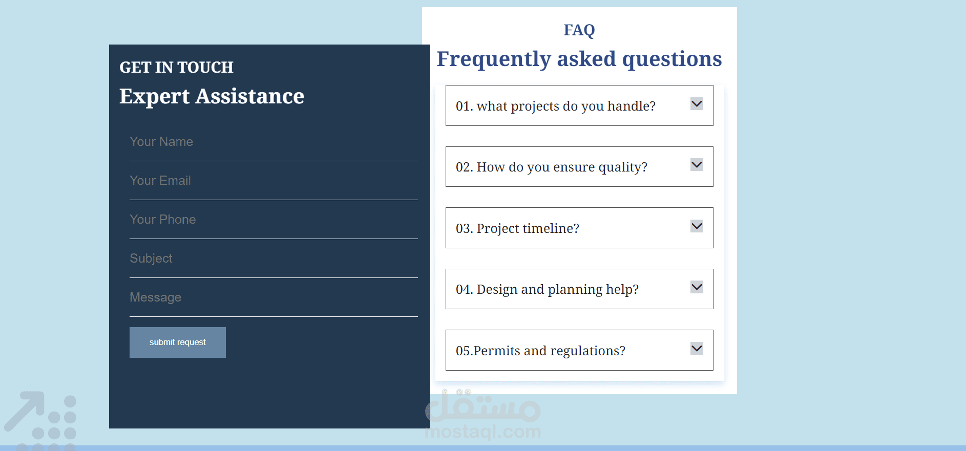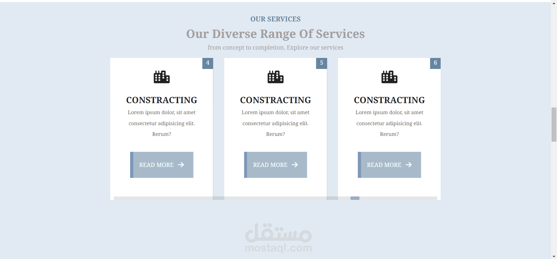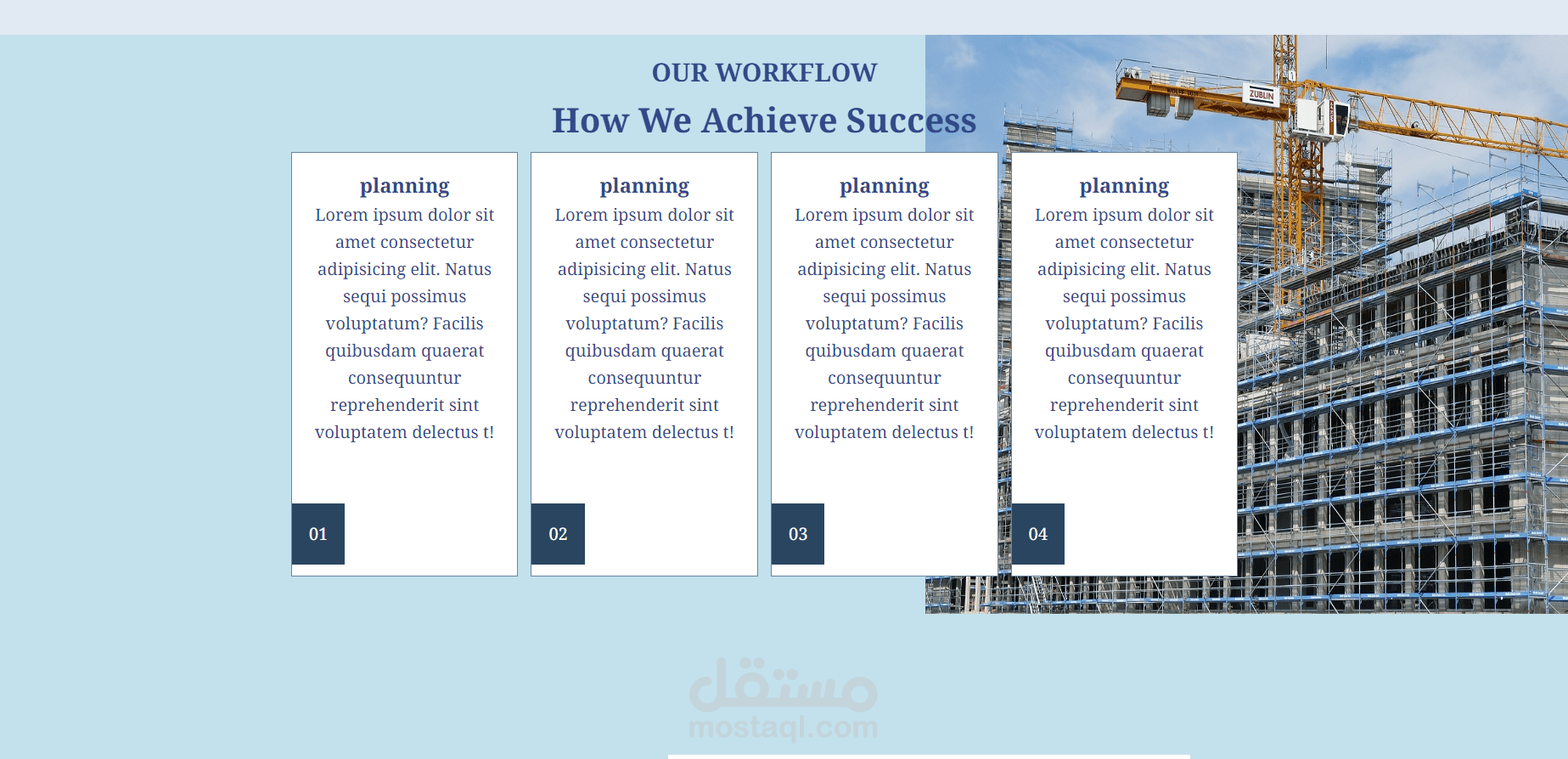 website for construction company first i create container section which contain navbar and the the swipper the l moved to counter section hence i create about part the create section three which display our advantages then create section display our services then i moved to our work flow part which consist of more than one part like form and summery then the newsletter section hence the footer.