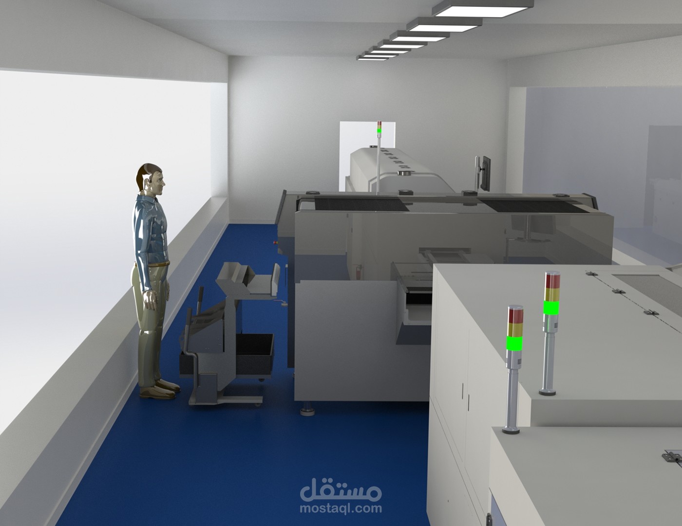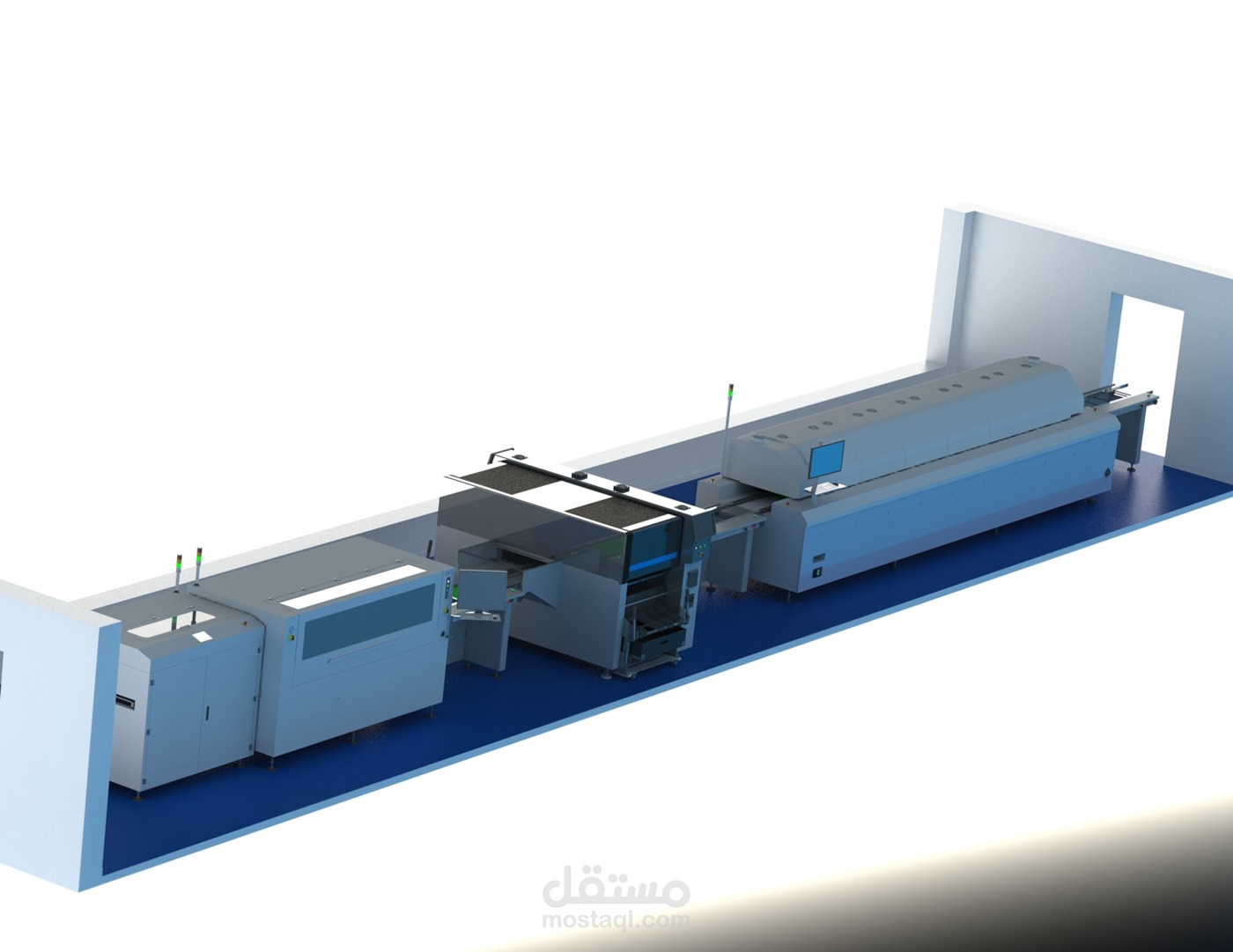 Description: Created a comprehensive 3D CAD model of a PCB production line based on the datasheets of assembly line machines. This project was undertaken for a client who planned to set up the production line in a small room. The detailed 3D renders revealed that the initial space allocation was insufficient for operator movement around the pick-and-place machine. As a result, the client decided to increase the room size to accommodate the production line efficiently. This project highlighted the importance of spatial planning and 3D visualization in optimizing industrial layouts.