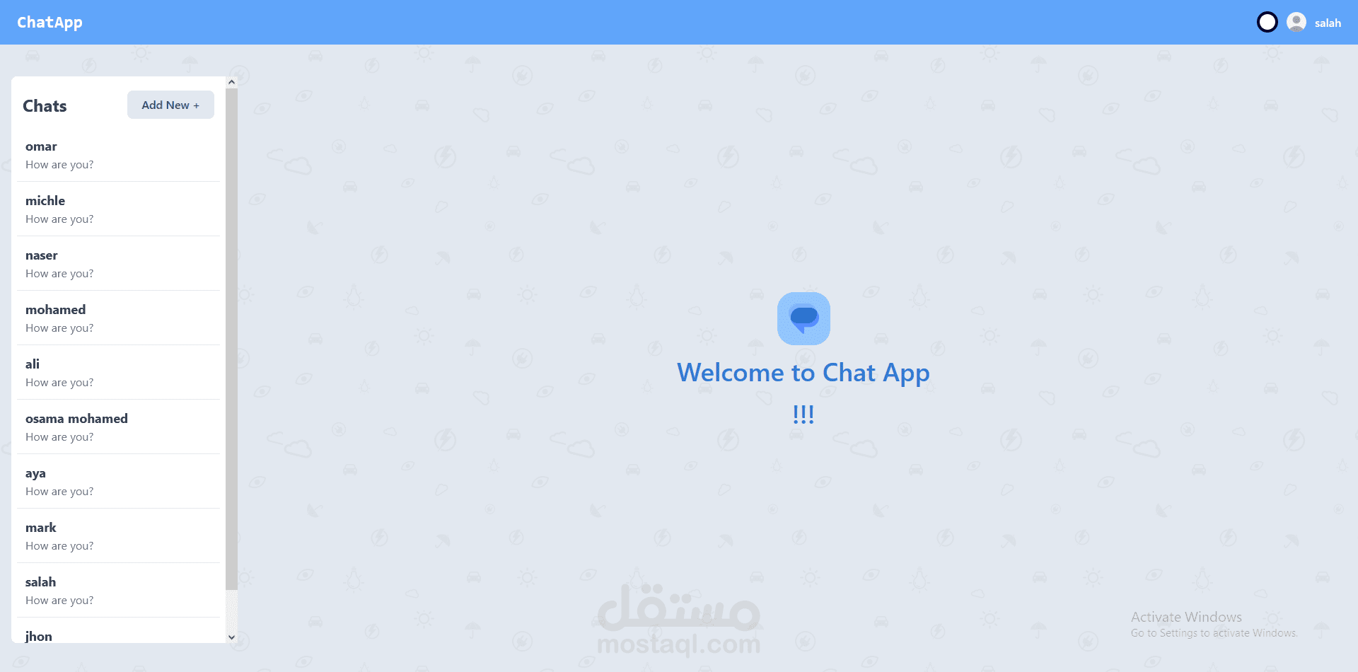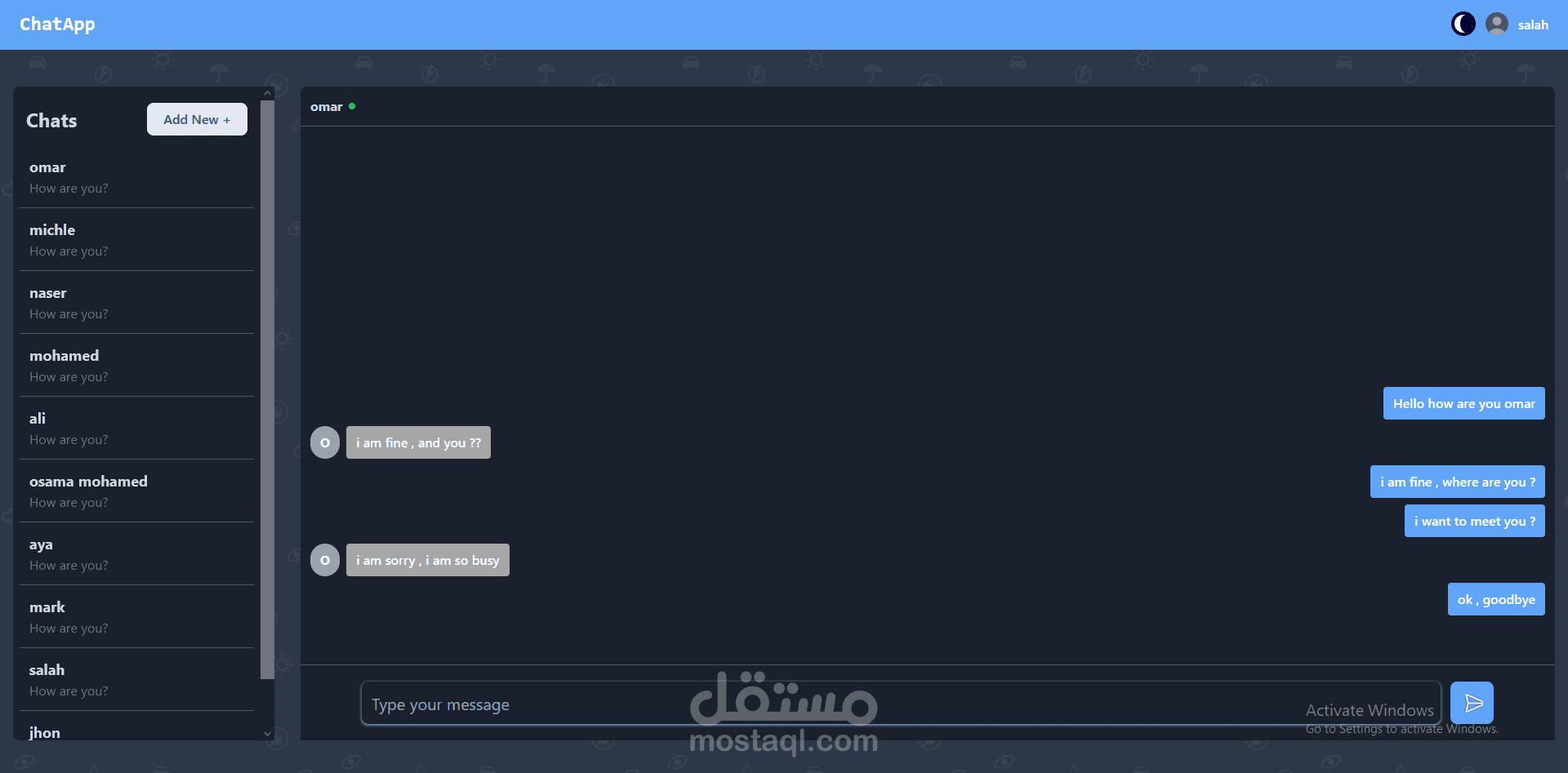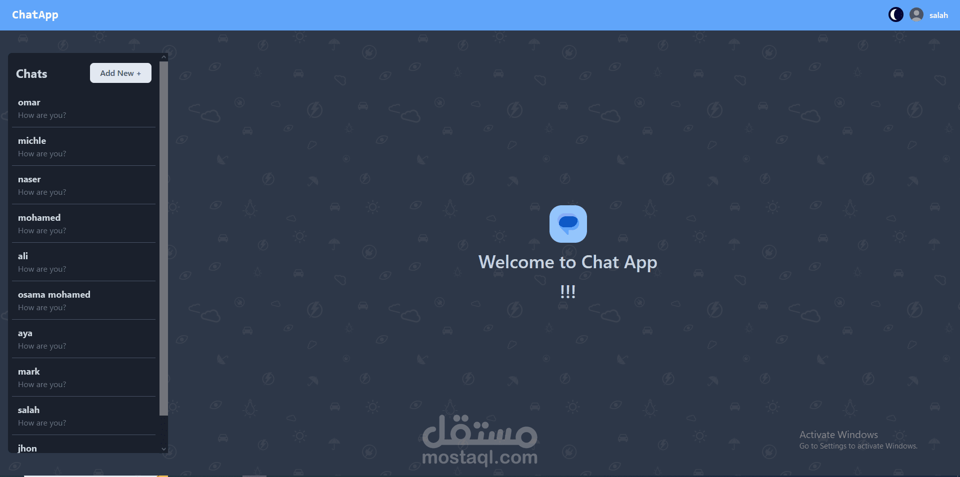 تطبيق محادثة كامل يعتمد على React للواجهة الأمامية وFlask للواجهة الخلفية وTailwind CSS للتصميم. تم تنفيذ آليات مصادقة وتفويض قوية لضمان تفاعلات آمنة للمستخدمين. يتميز التطبيق بمحول ديناميكي للسمات يتم إدارته بكفاءة من خلال React Context API، مما يوفر تجربة مستخدم سلسة وقابلة للتخصيص.