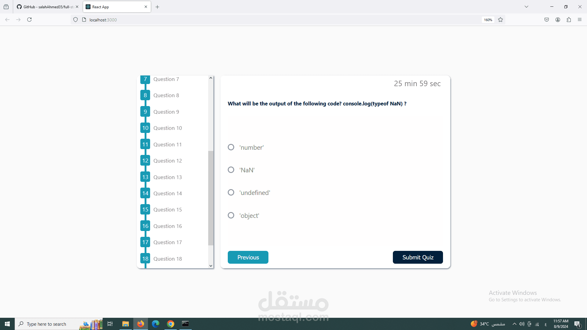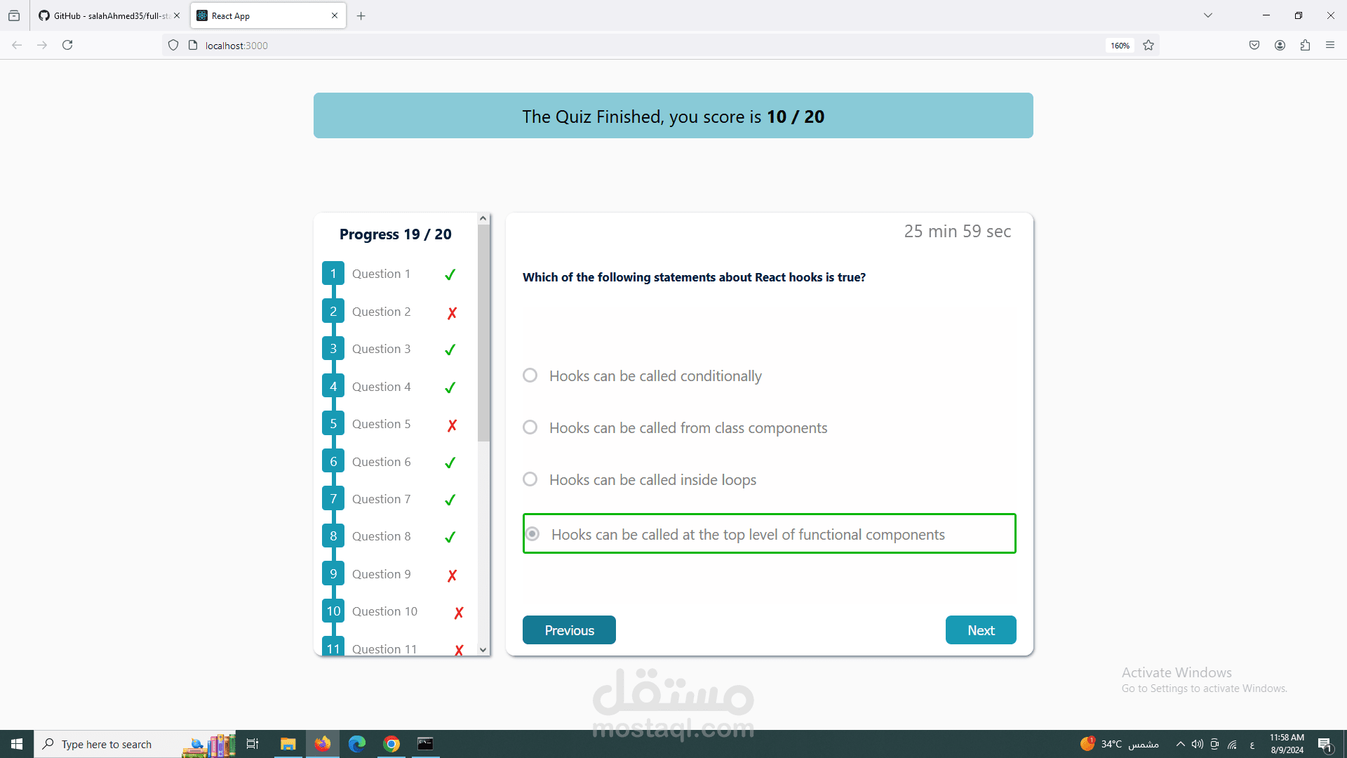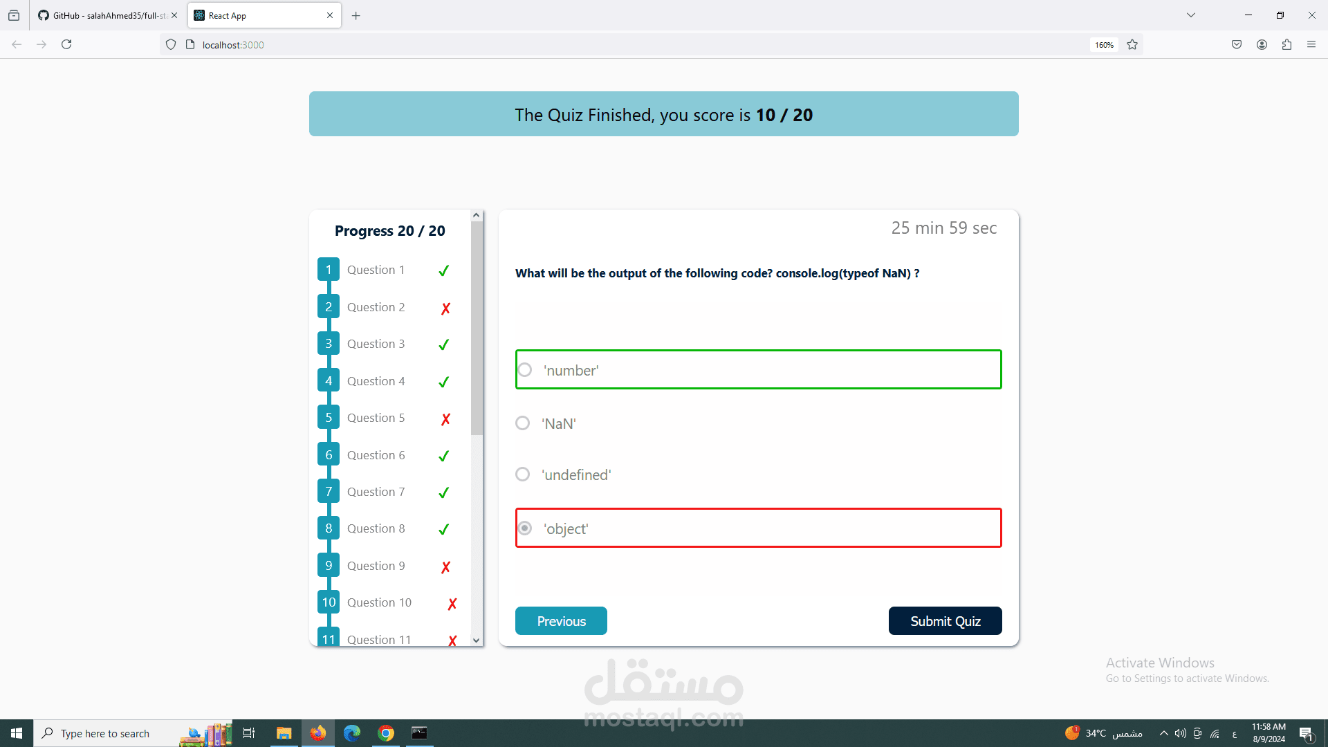 تطبيق اختبار تم إنشاؤه باستخدام React، HTML، CSS، و JavaScript. يحتوي التطبيق على شريط تقدم يوضح لك السؤال الذي تتواجد فيه حاليًا. عند الانتهاء من الاختبار، يعرض لك التطبيق النتائج والدرجة التي حصلت عليها واي من الحلول صحيح ام خاطئ