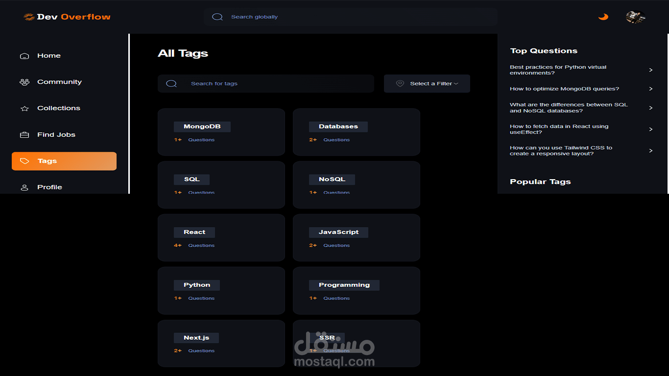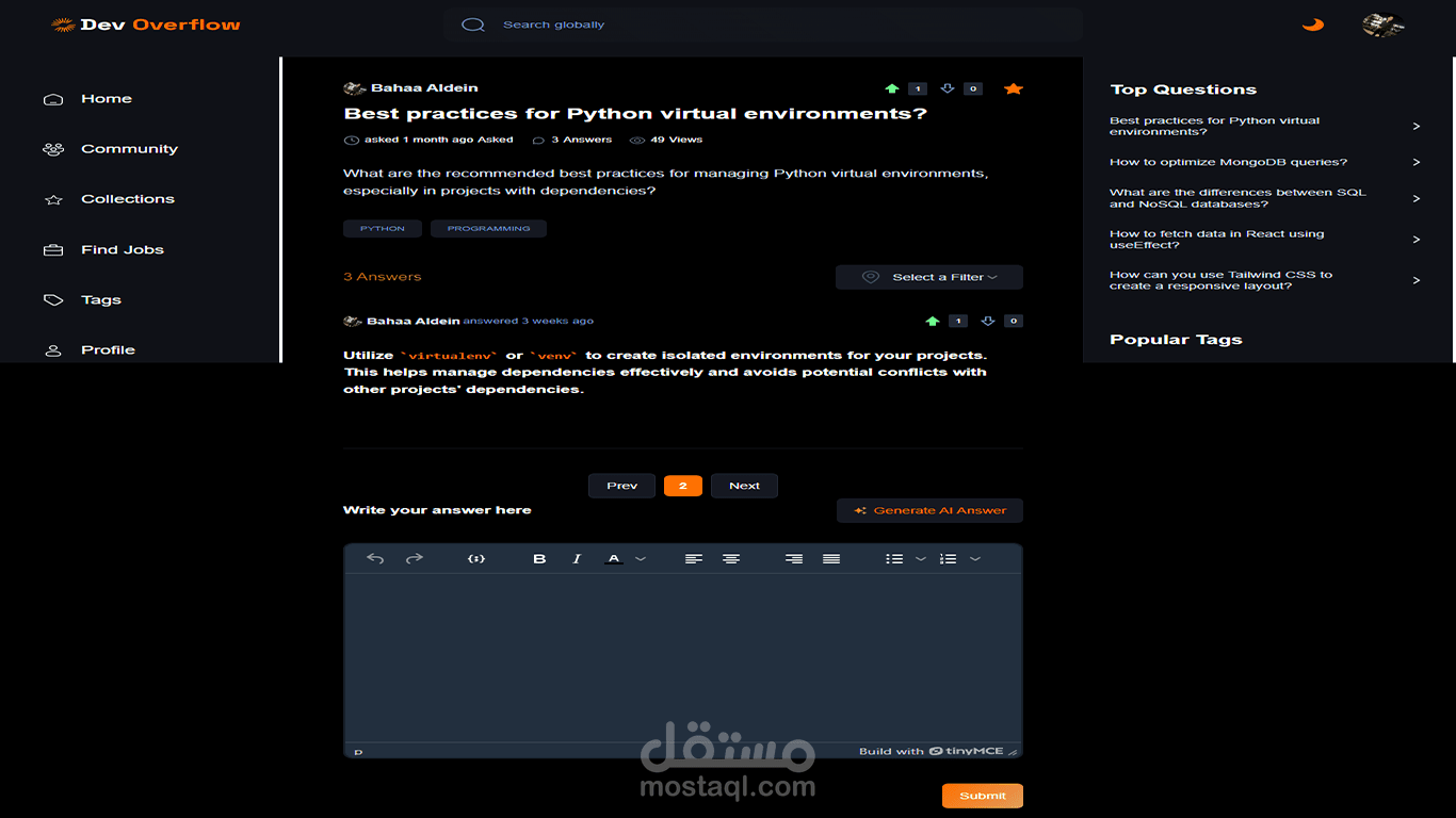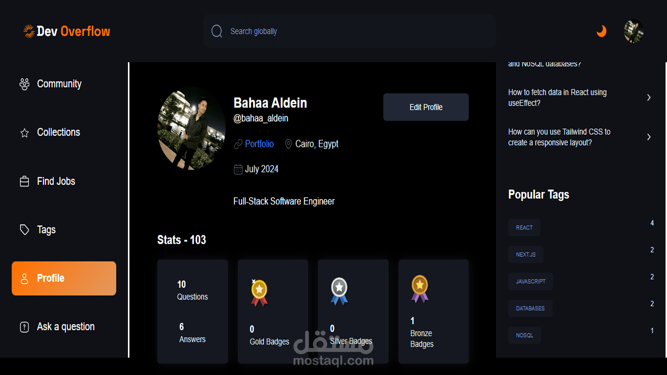 طورت تطبيق مشابه لـ Stack Overflow باستخدام Next.js وNode.js وMongoDB مع ميزات متقدمة للأسئلة والأجوبة.