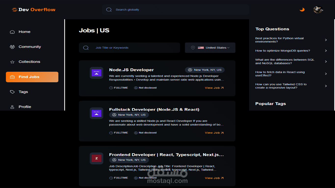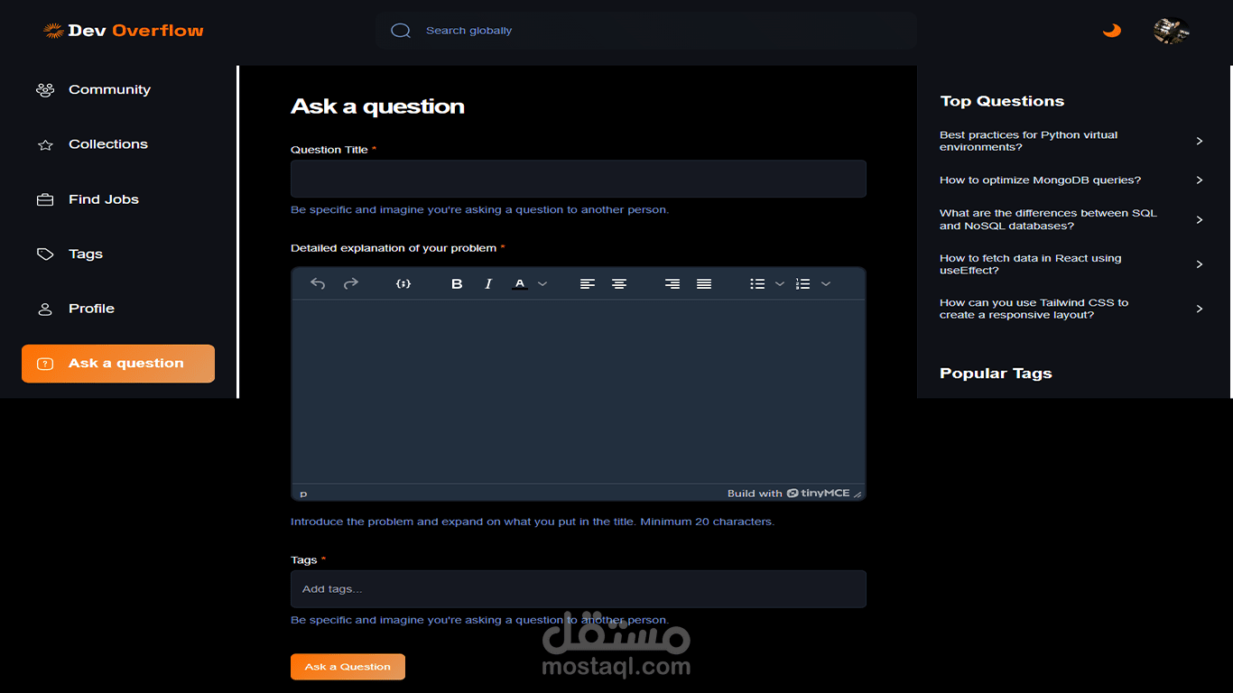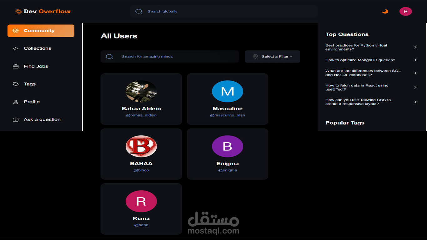 طورت تطبيق مشابه لـ Stack Overflow باستخدام Next.js وNode.js وMongoDB مع ميزات متقدمة للأسئلة والأجوبة.