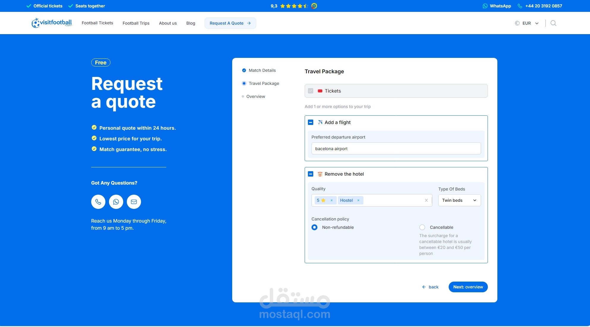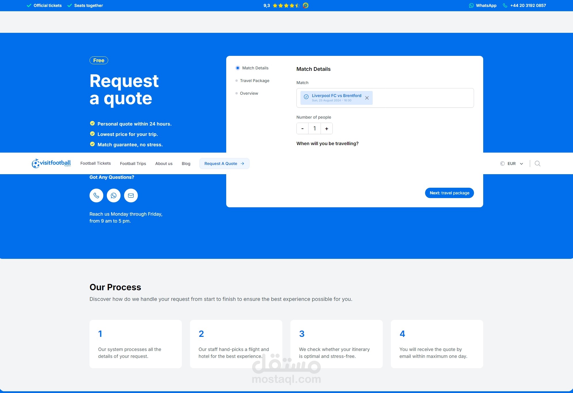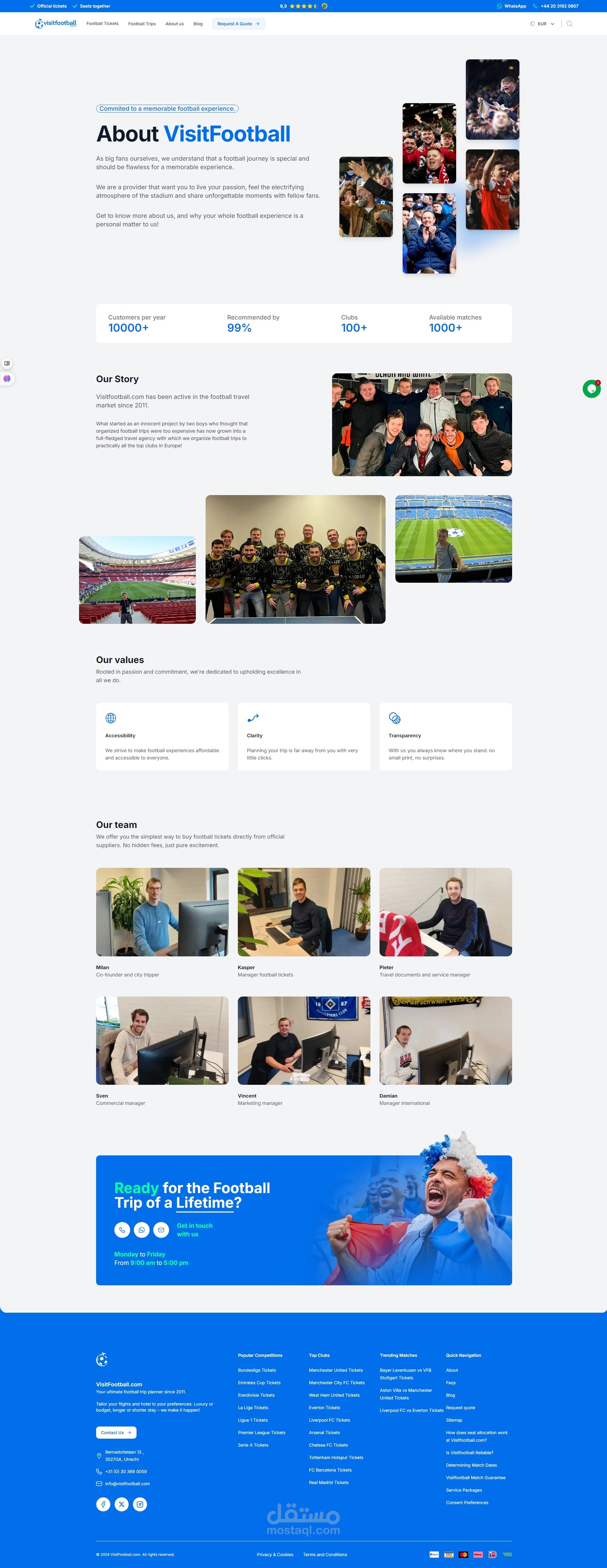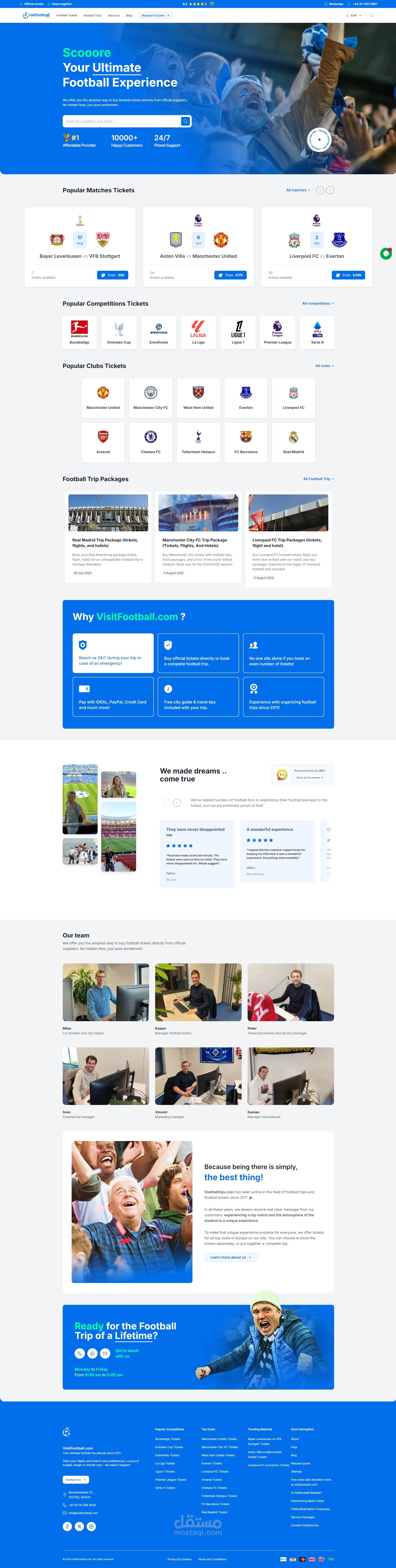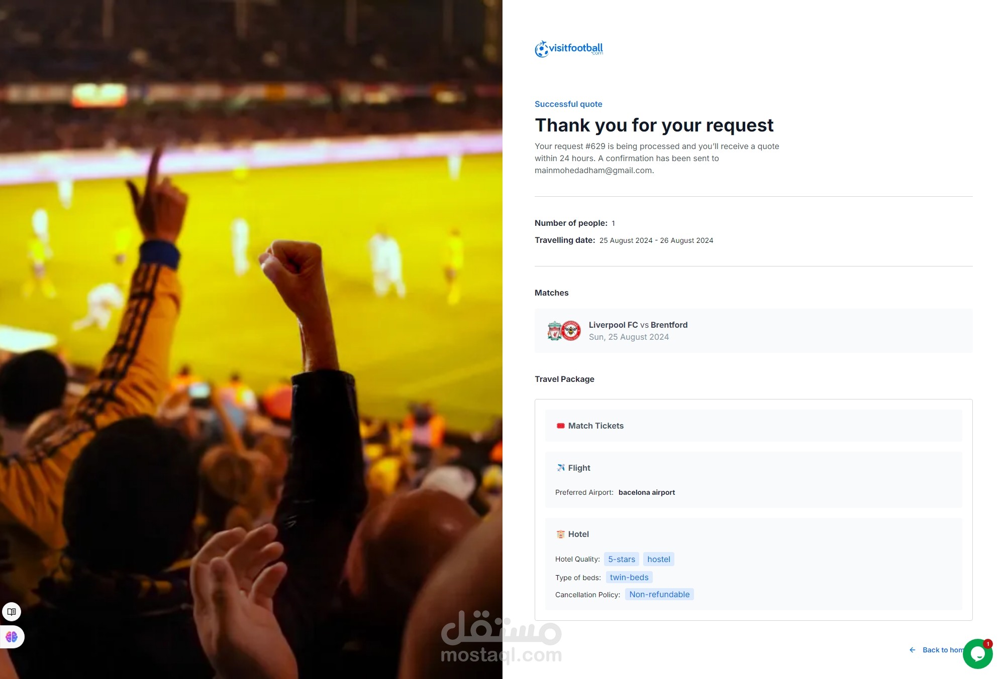 منصه visitfootball تسمح للمستخدم بأن يتصفح مباريات كرة القدم و ان يحجز مشاهده مباراه معينه او عدة مباريات و يحجز تذكرة الطيران الي الملعب مباشرة من نفس المنصه من خلال نظام حجز متعدد المهام ويحدد عدد أيام الاقامه و السعر والفندق والمطار المفضل وتخصيصات اخري..