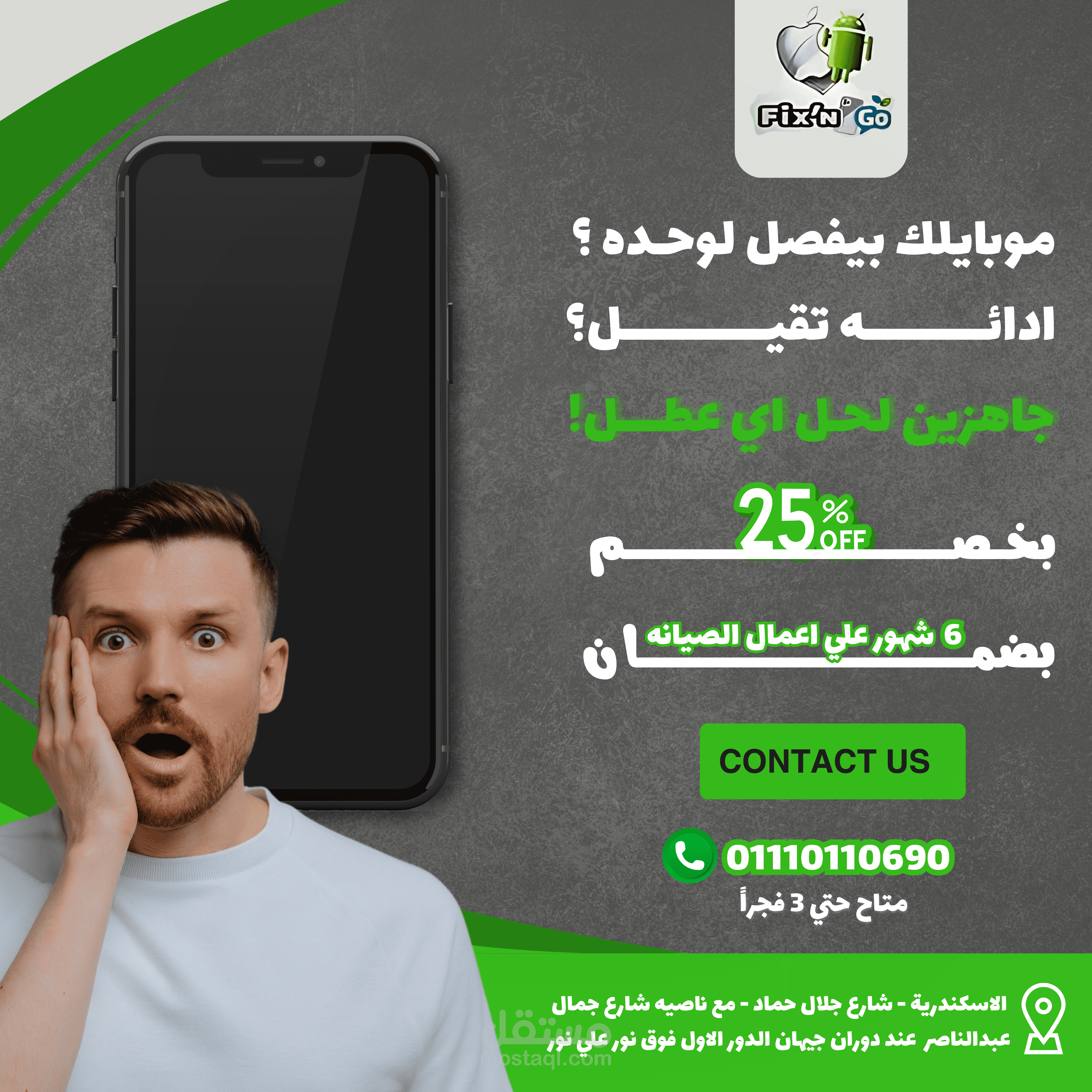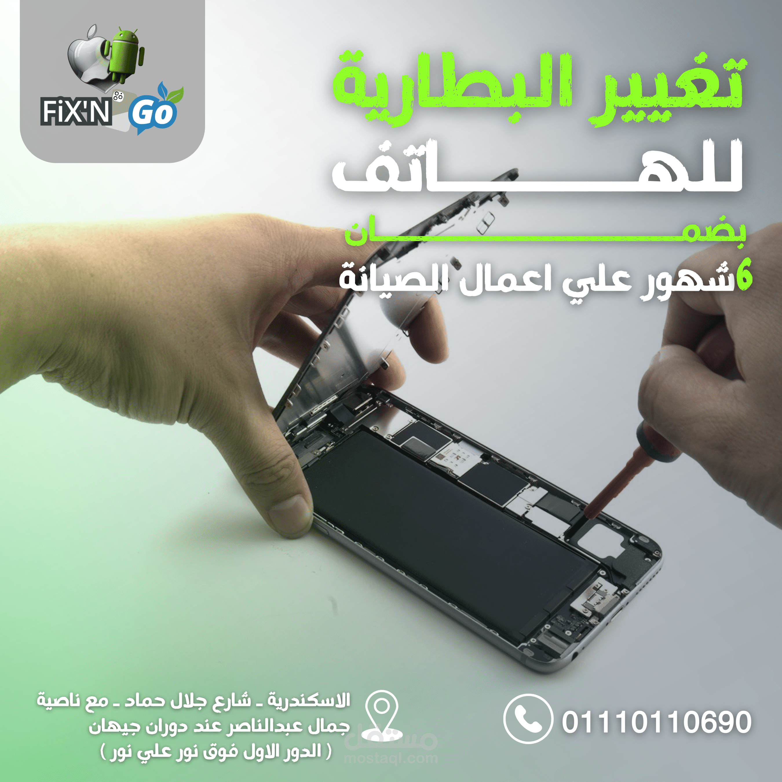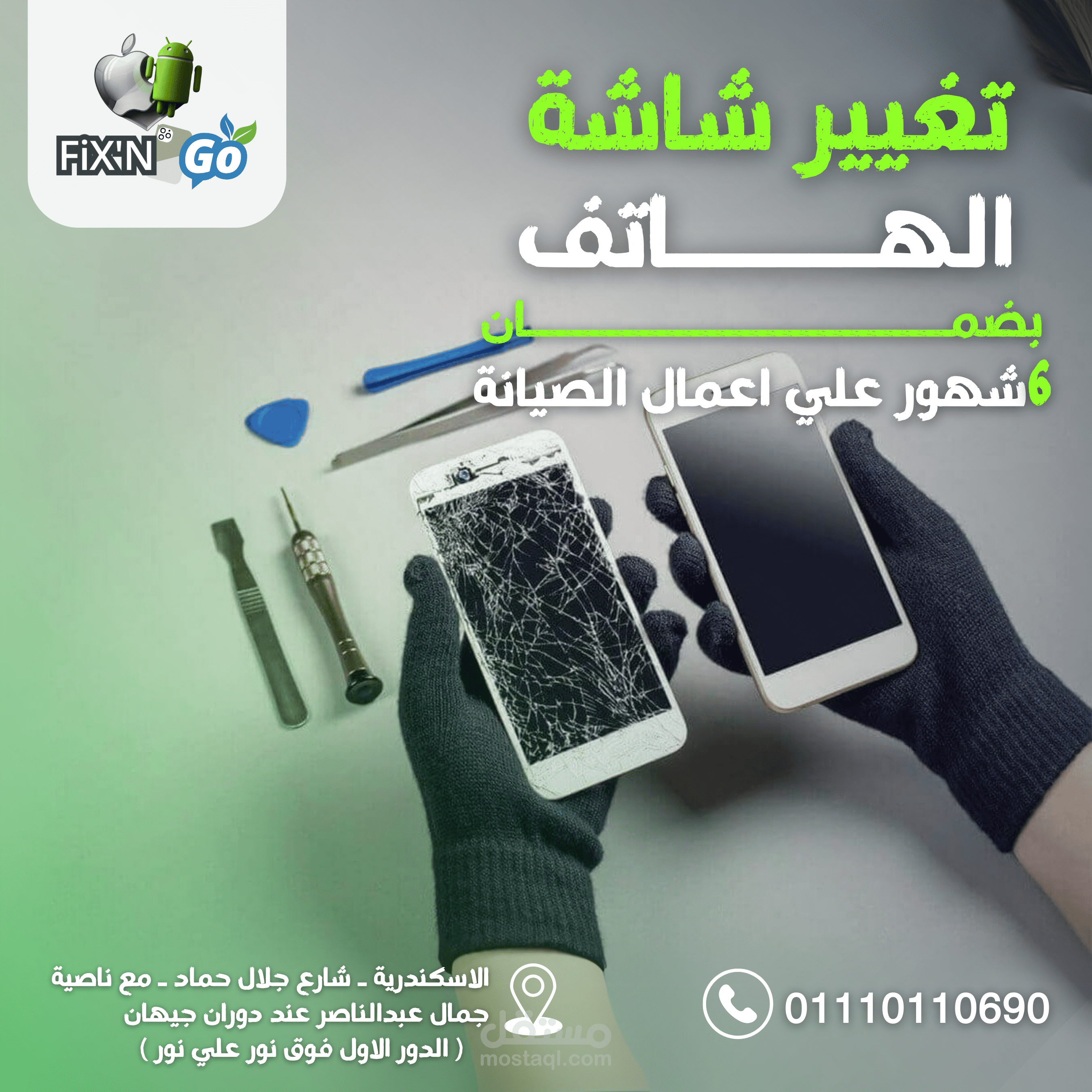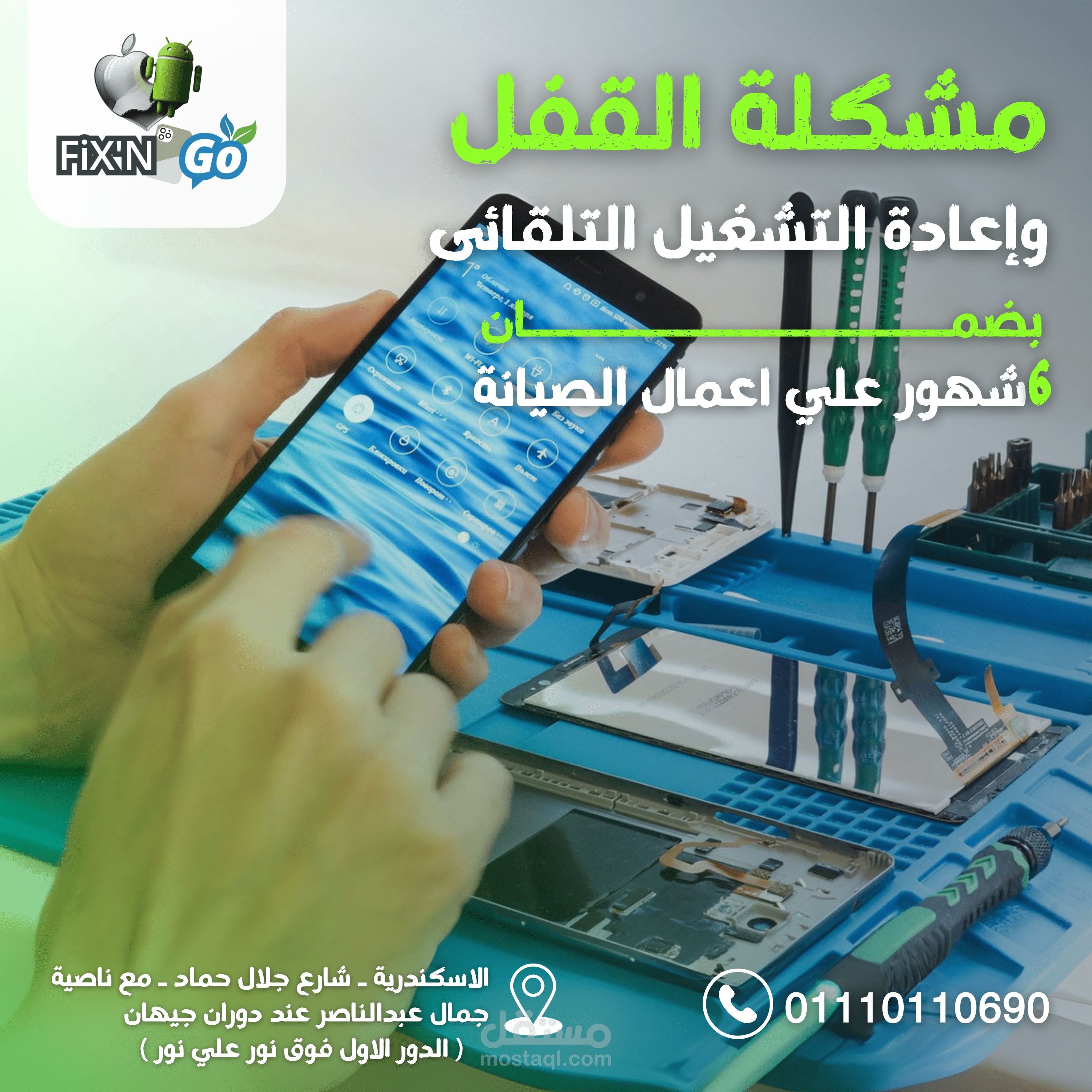 مجموعه متنوعه من تصميمات السوشيال ميديا لمركز صيانة FixN'Go