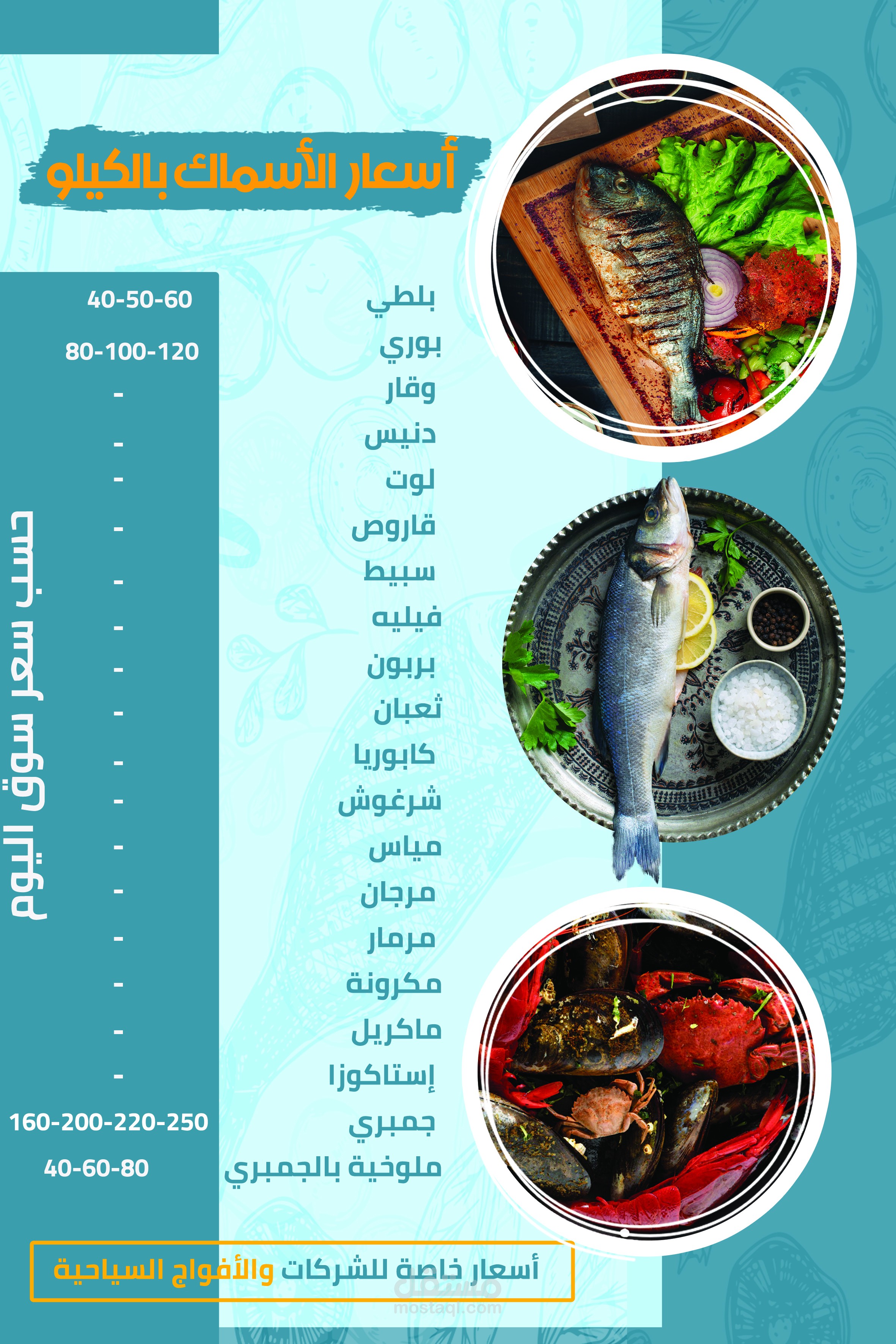 التنفيذ: بدأت بتصميم هيكل المنيو باستخدام الأدوات الأساسية في فوتوشوب، مع تنظيم النصوص والصور بشكل بسيط وواضح. تم إضافة صور للأسماك والمأكولات البحرية الخاصة بالمطعم، مع تأثيرات ضوئية خفيفة لإبراز الأطباق. تم اختيار خط بسيط وأنيق يتناسب مع الطابع البحري للمطعم.