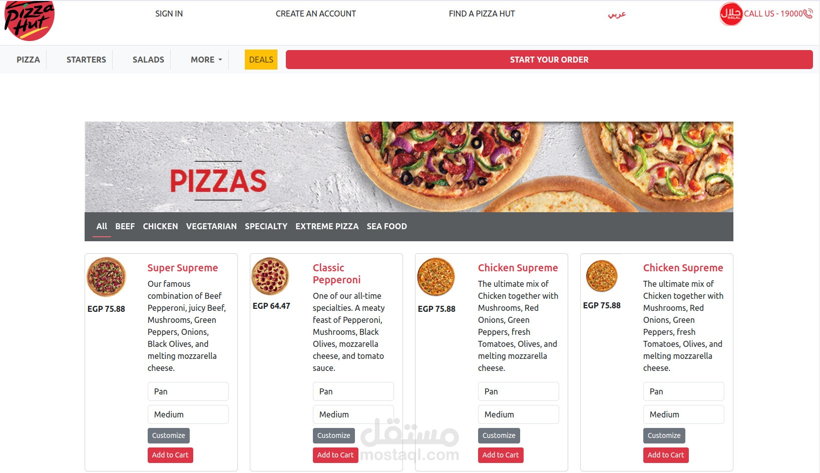 The Pizza Hut homepage can be recreated using a combination of HTML, CSS, and Bootstrap. The overall layout is likely structured using Bootstrap's grid system to create responsive columns for the navigation bar, hero image, and pizza menu sections. HTML elements like divs, headings, and paragraphs would define the content structure. CSS would be applied for styling, including colors, fonts, and spacing, to match the Pizza Hut branding. The pizza menu items could be organized using Bootstrap cards for a consistent look. While Font Awesome might not be explicitly used in this example, similar icon libraries could be incorporated for potential social media or contact icons.