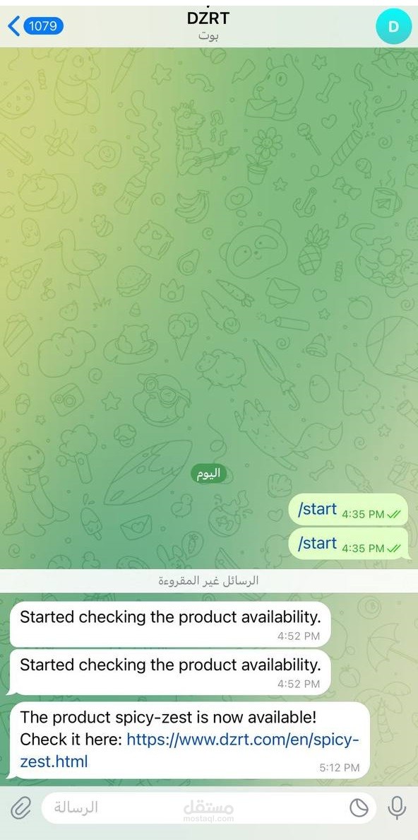 بوت تليجرام لموقع دزرت مصمم ليتابع كل المنتجات الموجودة على الموقع وعند توافر اي منها يرسل تنبيه انها متوفرة ويرسل اسم المنتج واللينك الخاص به لتذهب وتشتريه