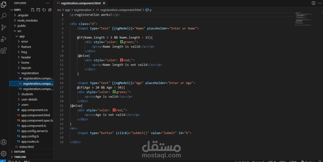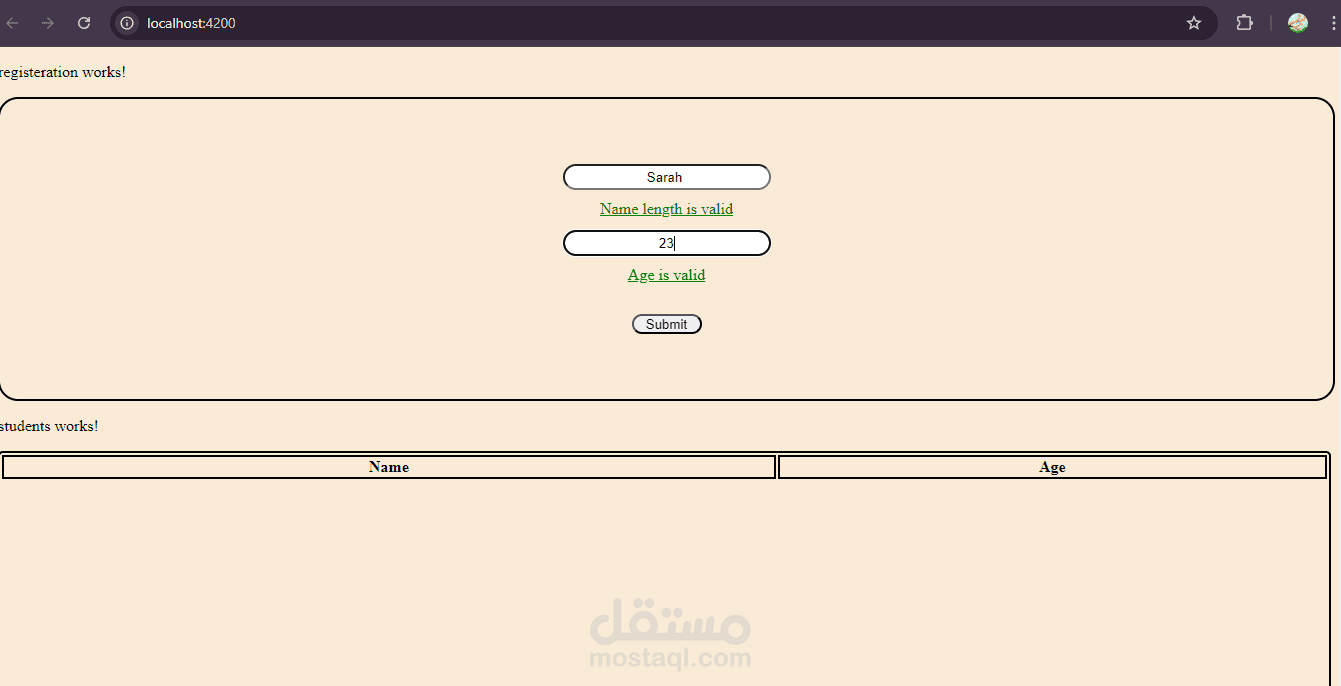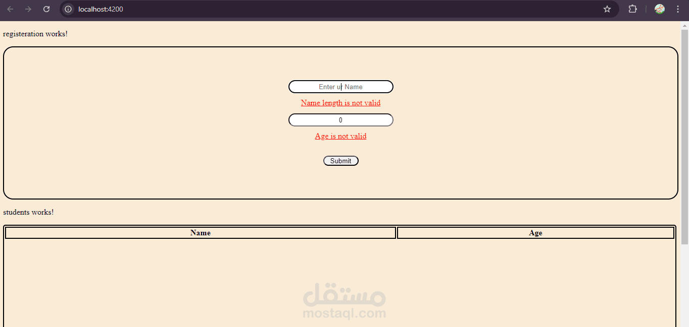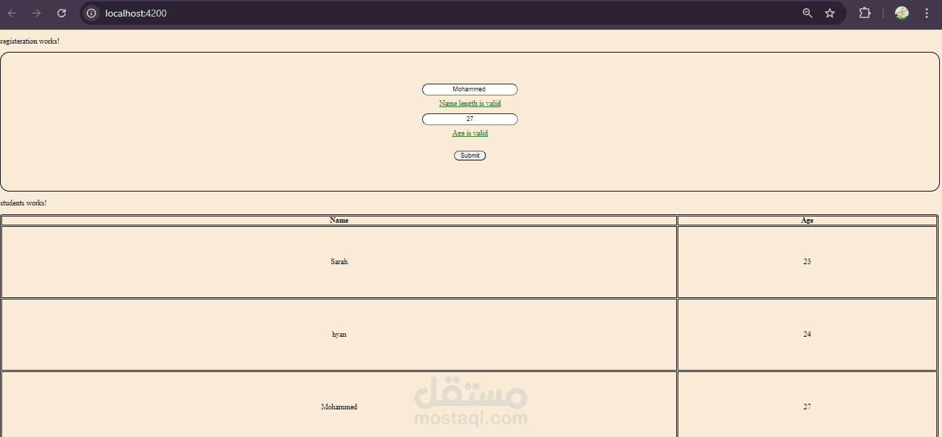 students field.If the charater of the user name is less than 3 or the age<20 or age>30 the user will not be able to registrate