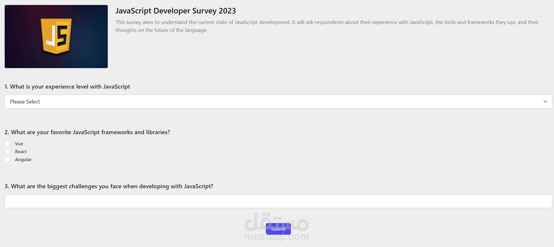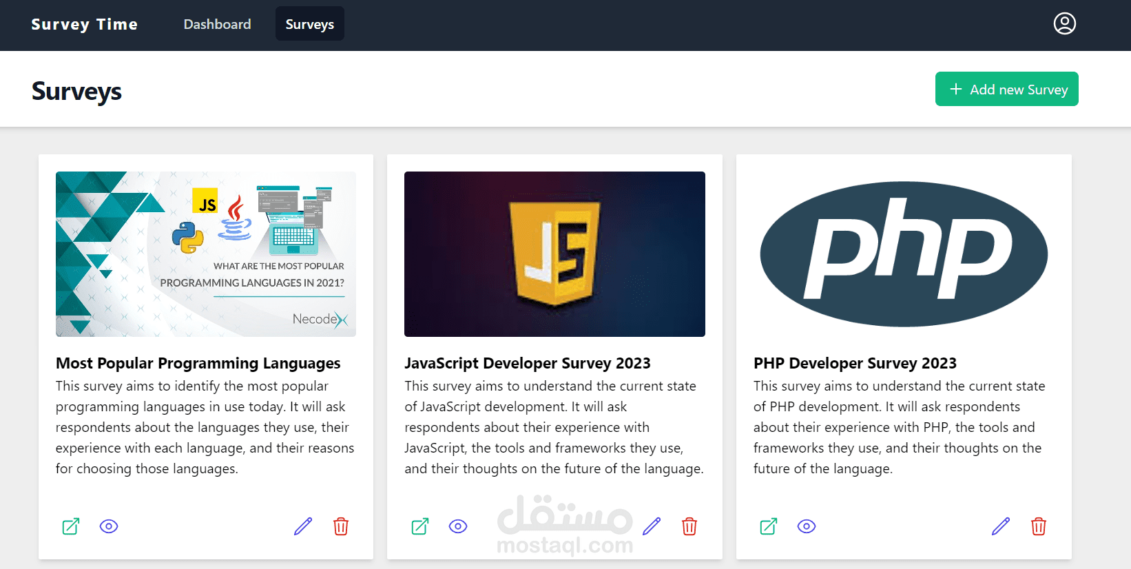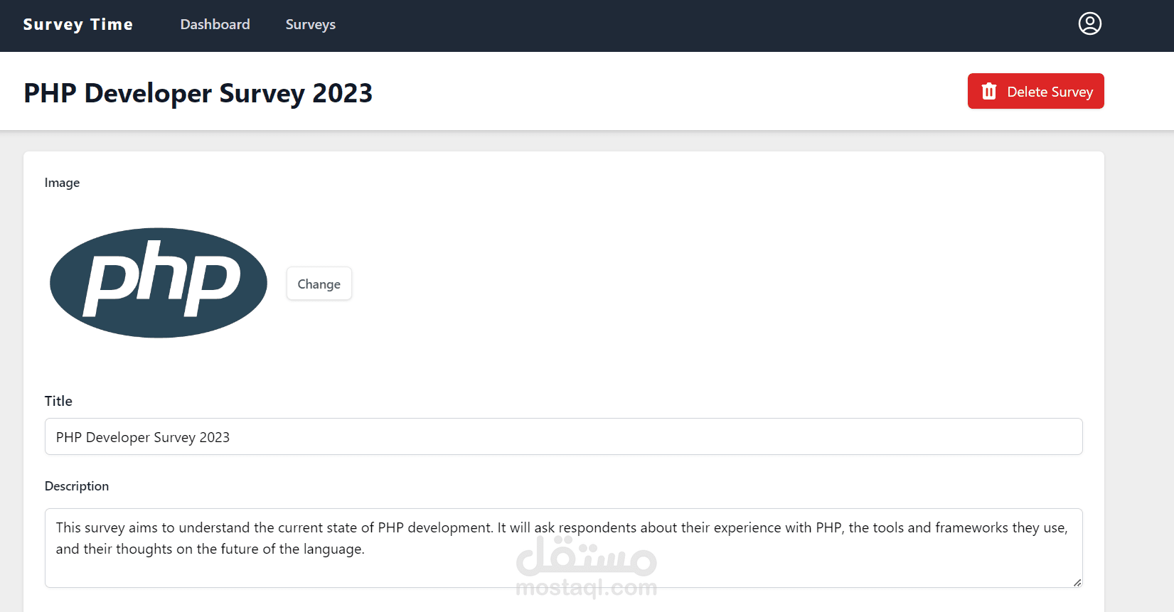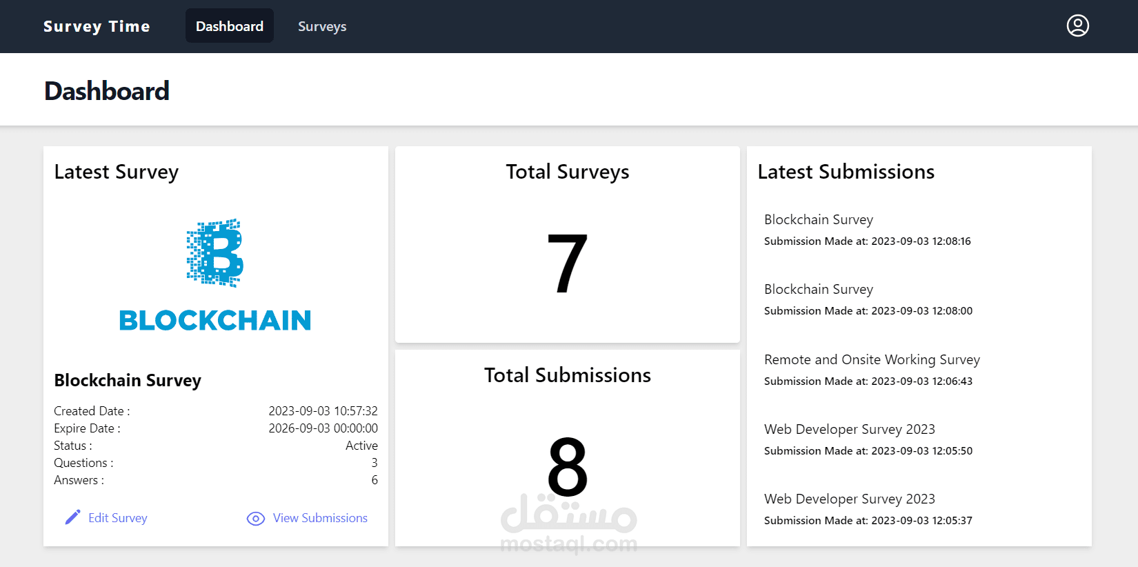 تطبيق ويب لإنشاء الاستبيانات ومشاركتها مع الآخرين لجمع ردودهم، تم بناؤه باستخدام Vue وVuex وTailwind CSS للواجهة الأمامية، وLaravel للواجهة الخلفية.