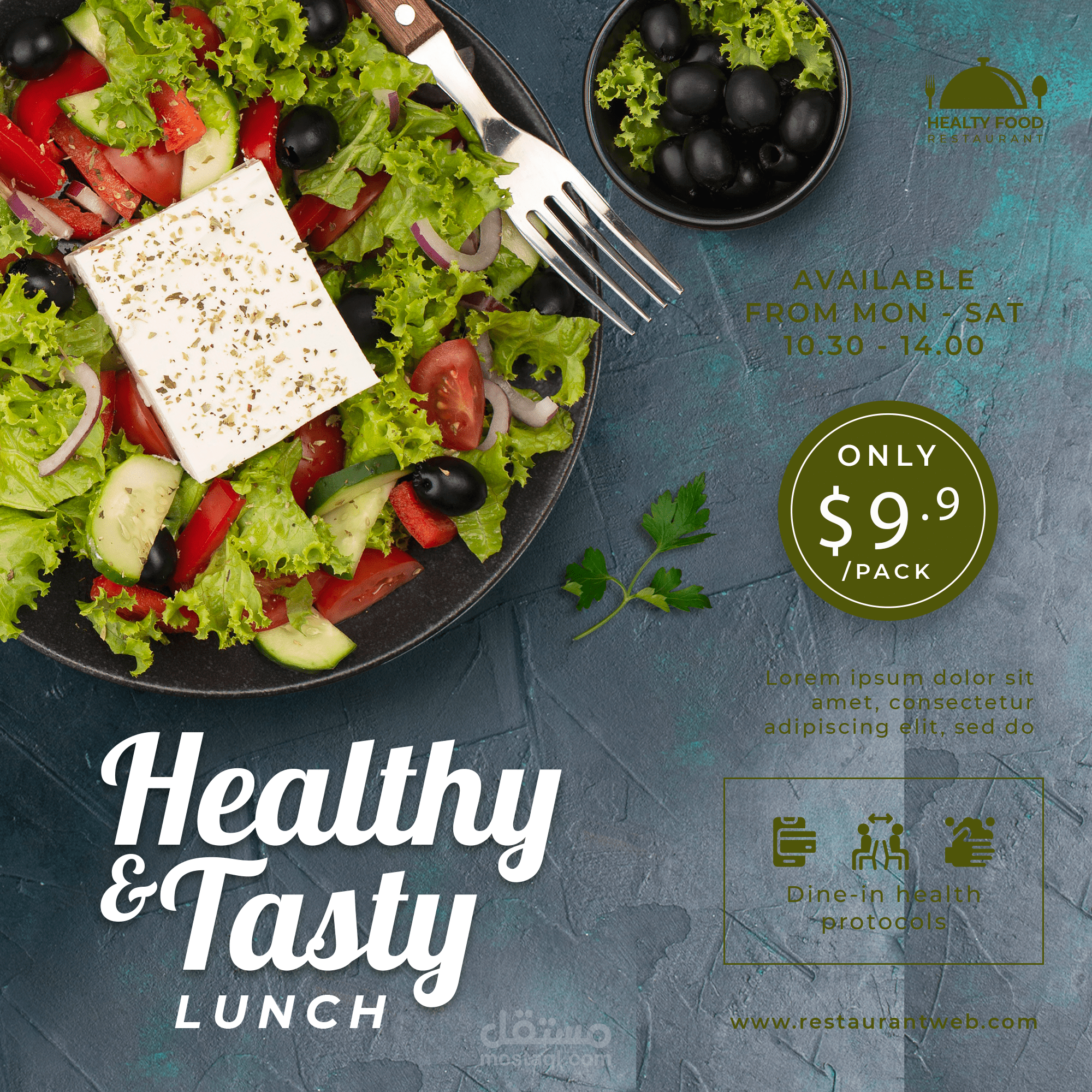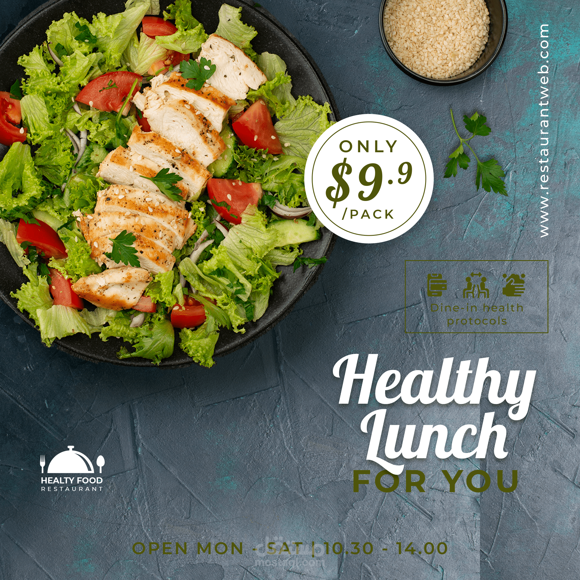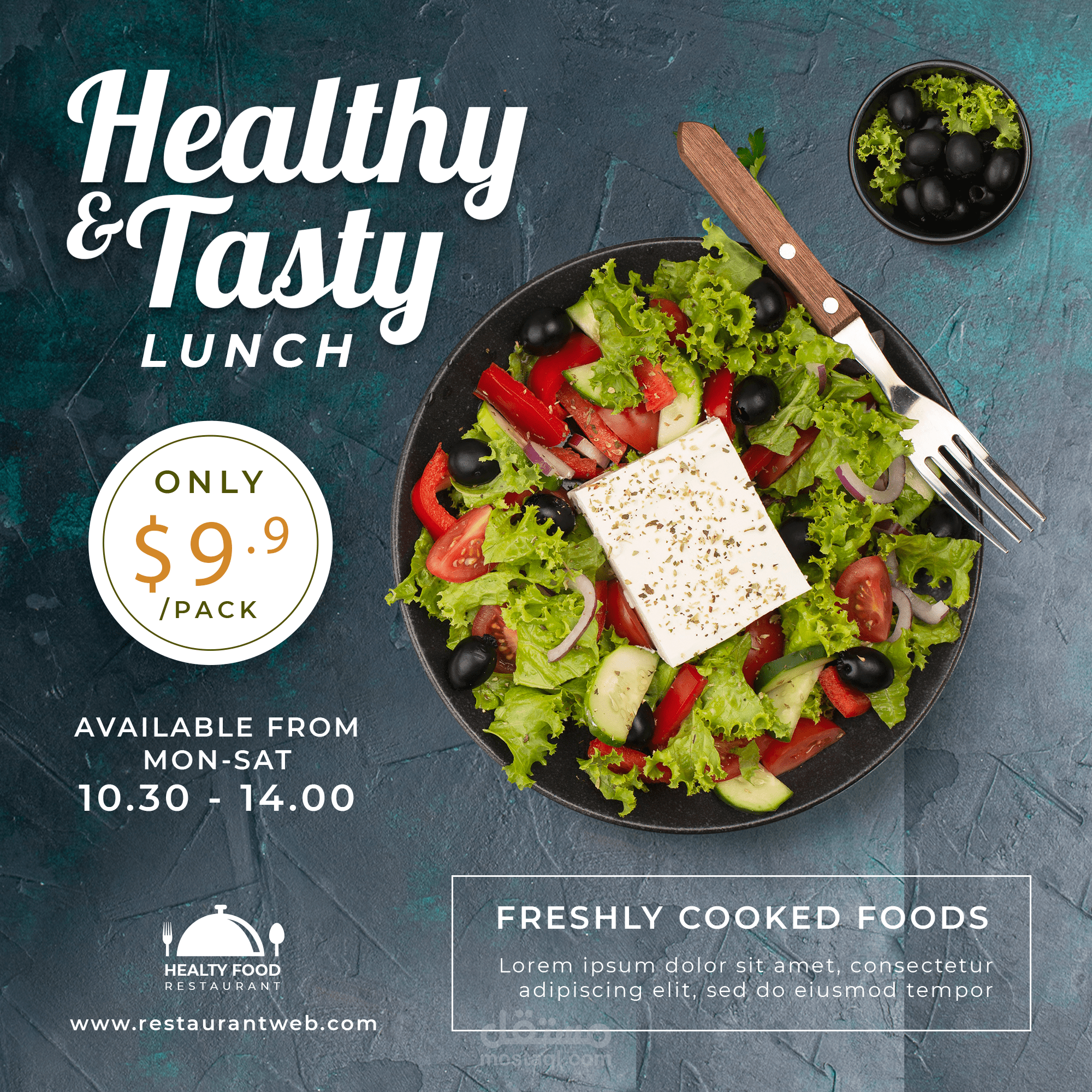 تتكرر الأطباق الصحية التي تحتوي على سلطات مع إضافات مثل الدجاج المشوي أو الجبن الأبيض، مما يعزز من مفهوم الأكل الصحي. النصوص بسيطة ومباشرة مثل "Healthy & Tasty Lunch" و"Freshly Cooked" و"Healthy Lunch for You"، مما يركز على الجانب الصحي والشهي في نفس الوقت.