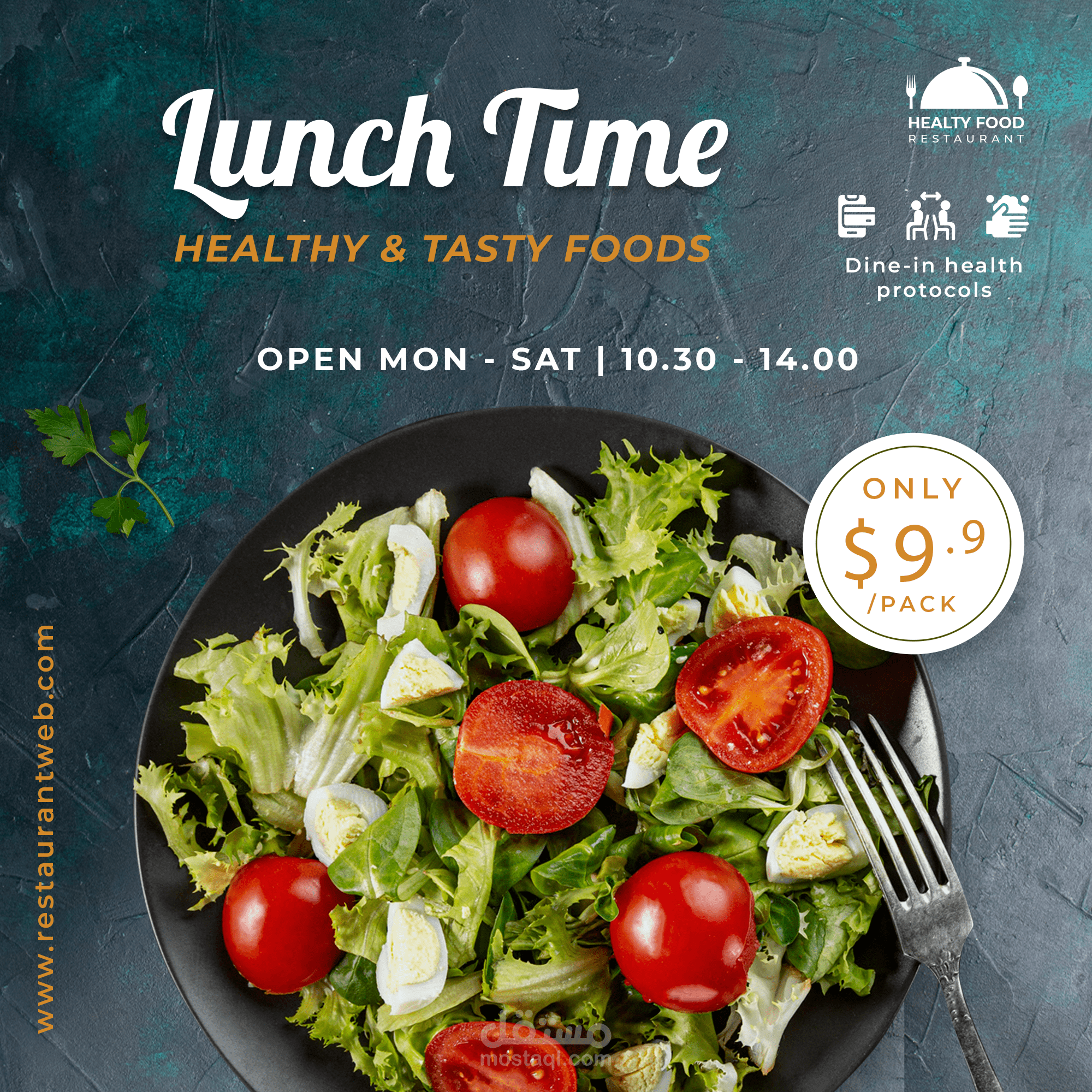 الألوان المستخدمة تتماشى مع الطبيعة الخضراء للوجبات، مع تسليط الضوء على السعر "$9.9/pack" في دوائر صفراء لجذب الانتباه. البوستات موحدة من حيث النمط ولكنها مختلفة في توزيع العناصر والتفاصيل، مع وجود أيقونات صغيرة تعبر عن الخيارات المتاحة مثل الأكل في المطعم أو اتباع البروتوكولات الصحية.