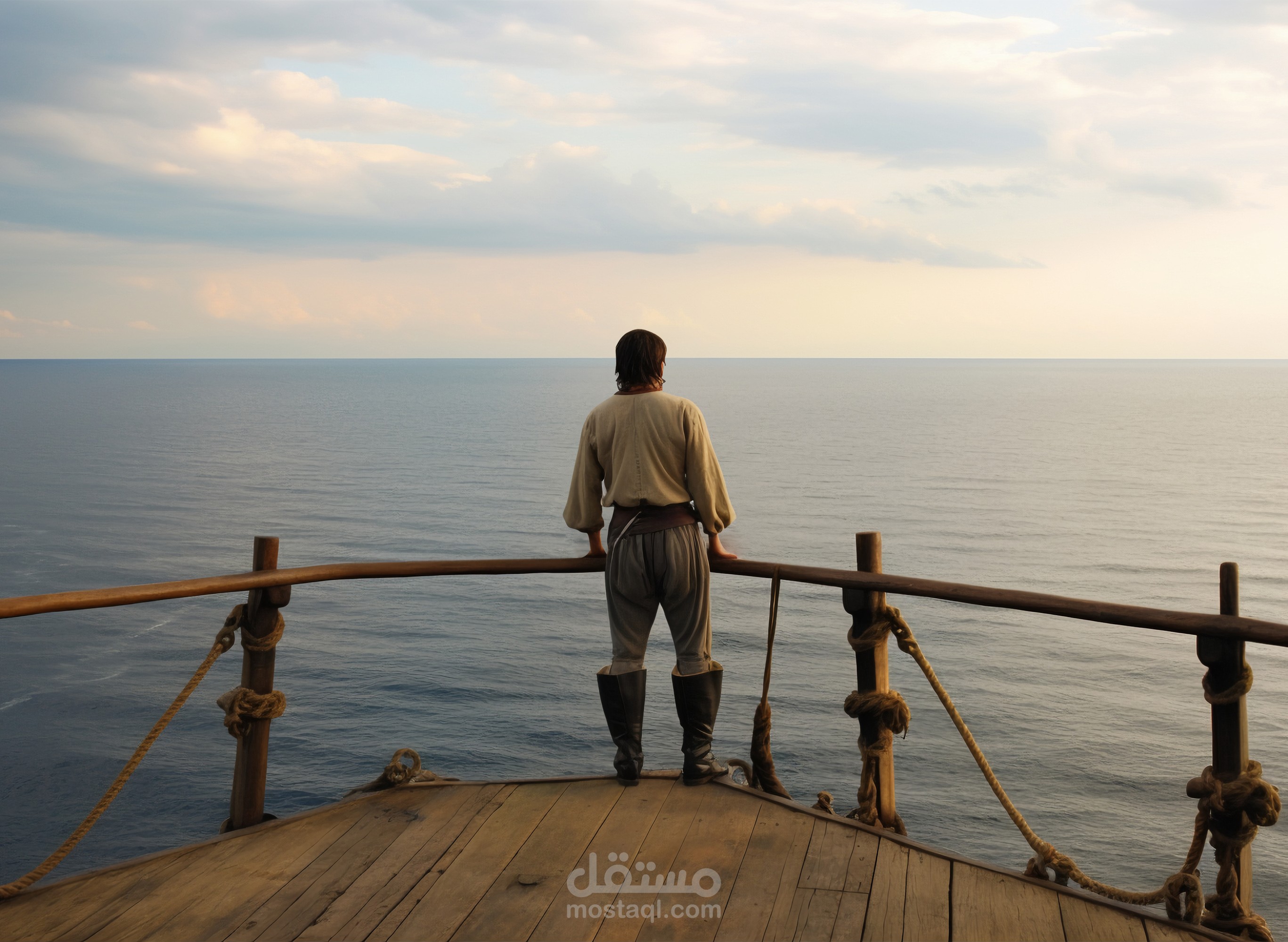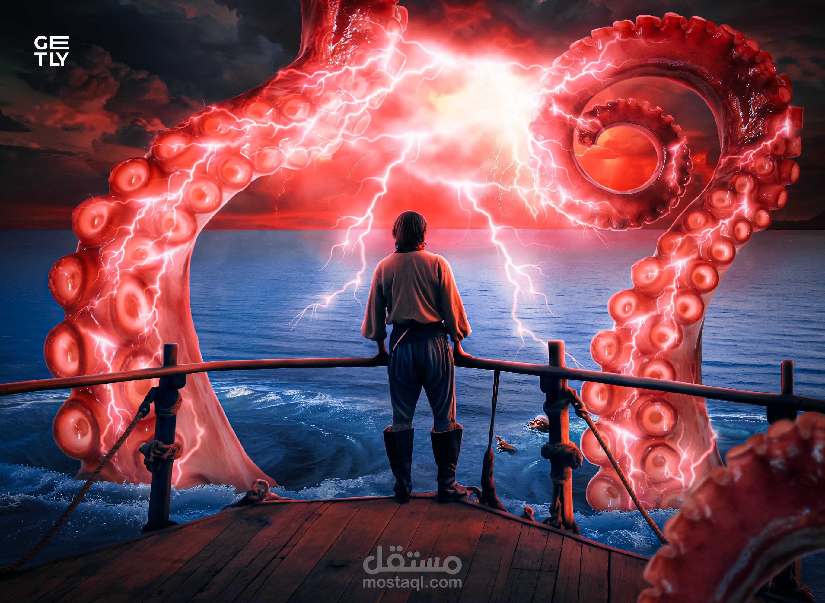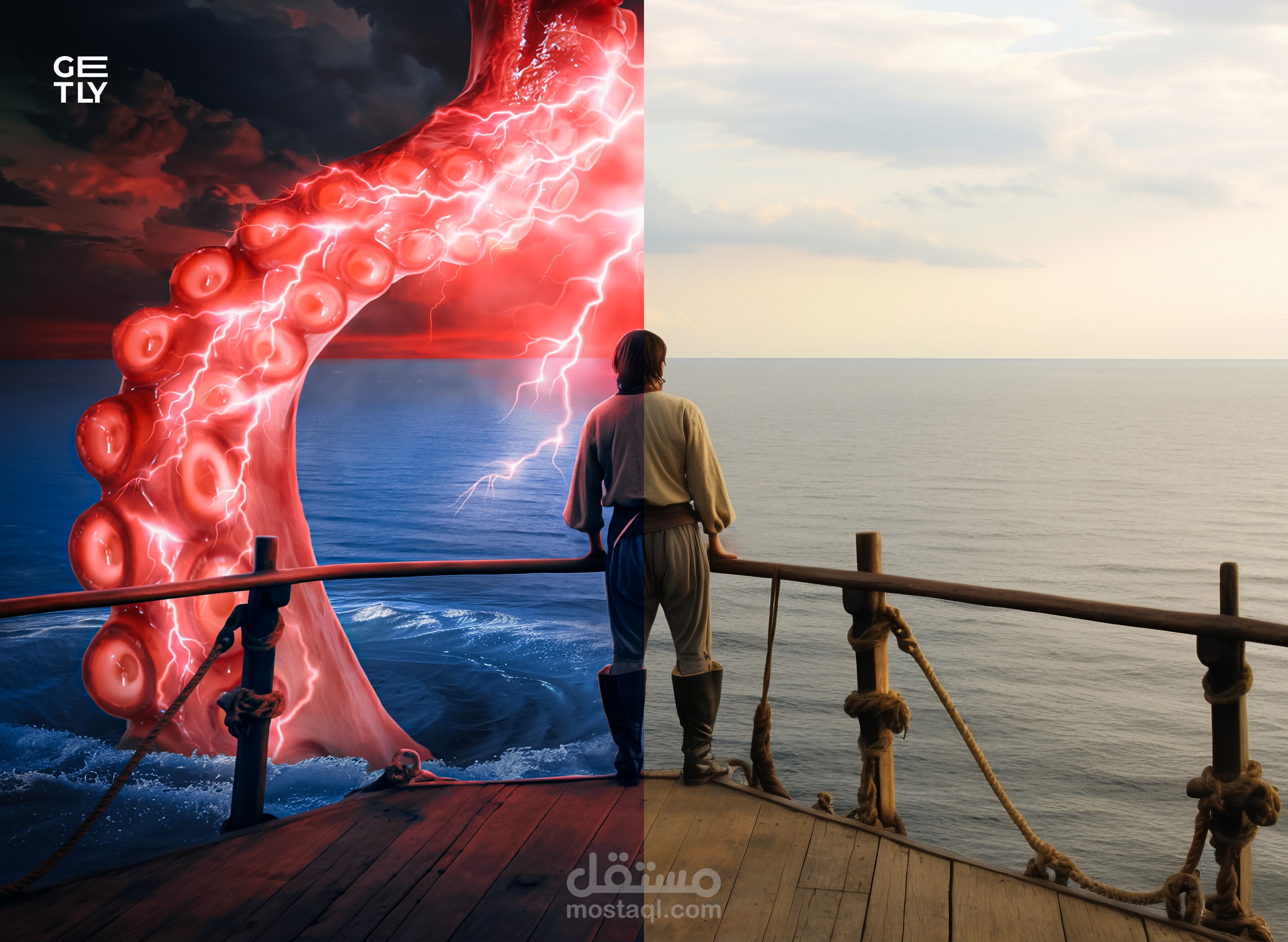 A giant octopus attacks a boat at sea. A man watches the scene and does not understand what is happening now. He watches his friend asking for help, but he is unable to help him.