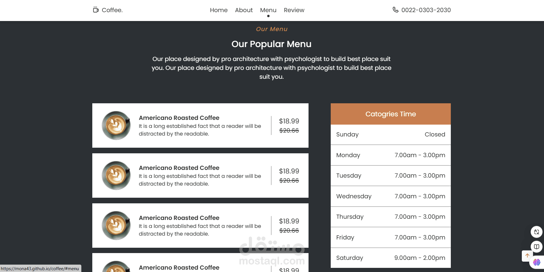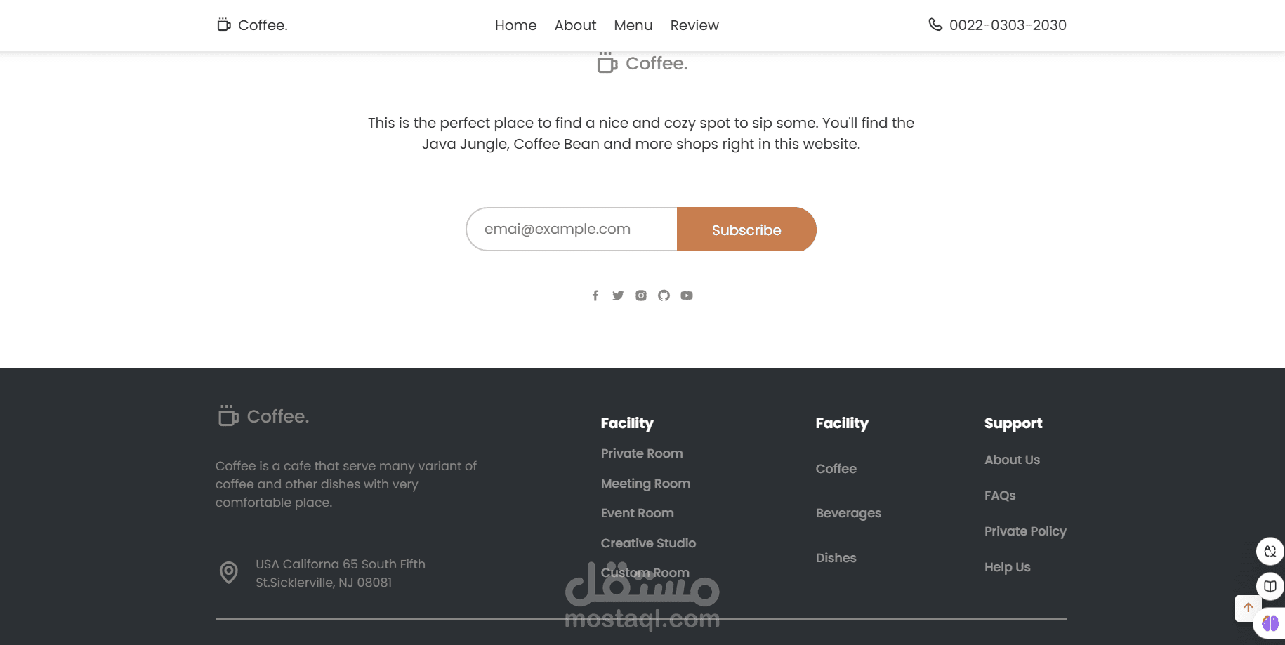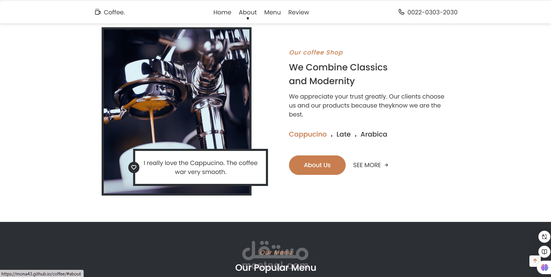 Coffee Website هو موقع إلكتروني مخصص لعشاق القهوة، يهدف إلى تقديم تجربة فريدة تجمع بين التصميم الجذاب والمميزات العملية. الموقع مصمم ليكون الوجهة المثالية لعرض أنواع القهوة المختلفة، وصفات تحضيرها، أو حتى بيع منتجات القهوة أونلاين.