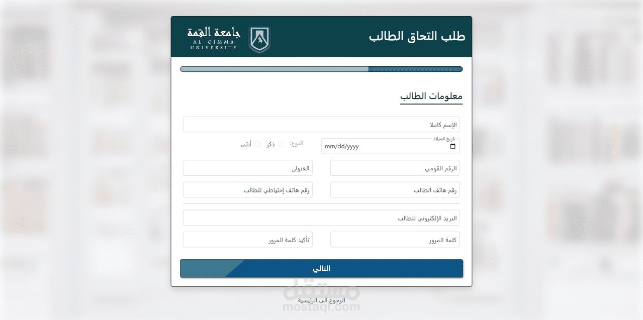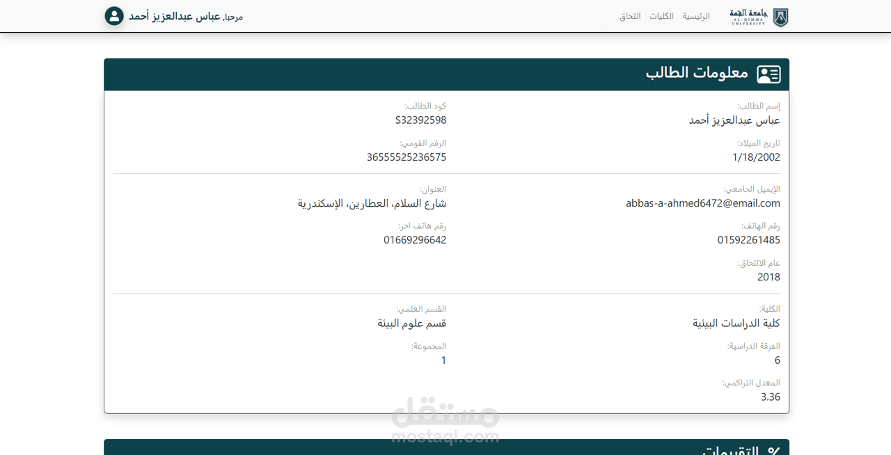 - تسجيل الالتحاق كطالب و عرض معلومات الطالب و التقييمات السابقة و المجموع الكلي.