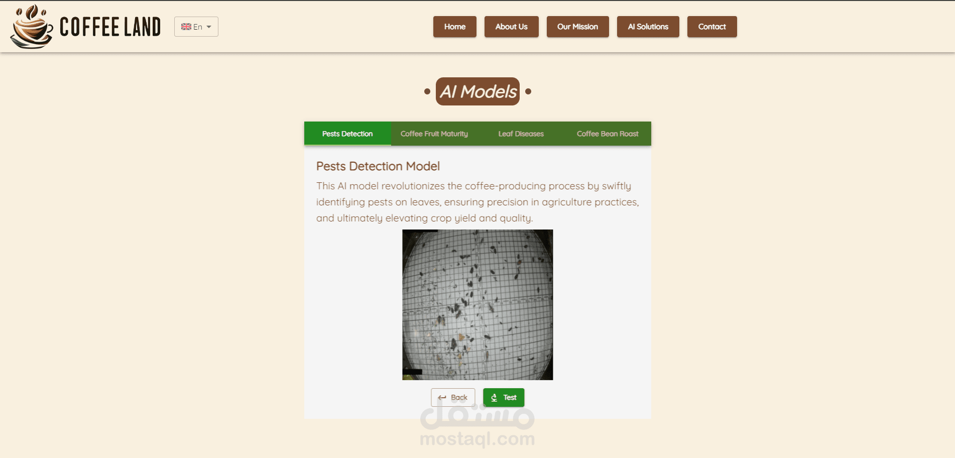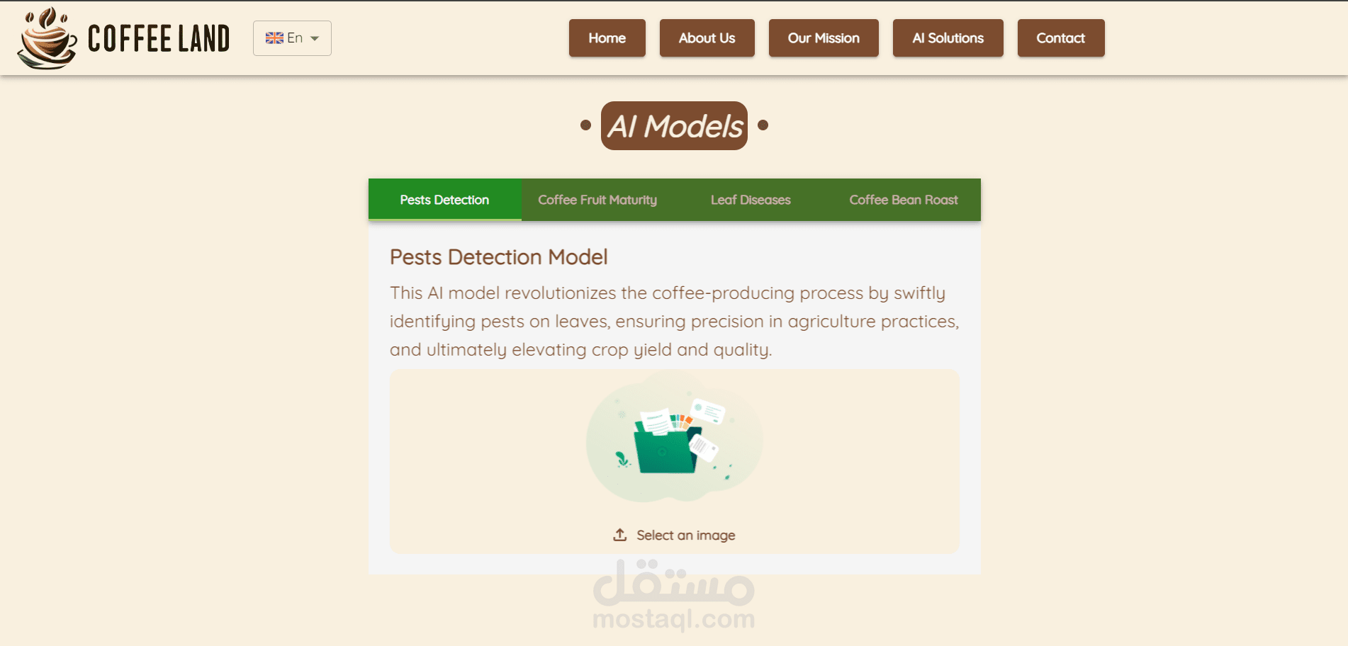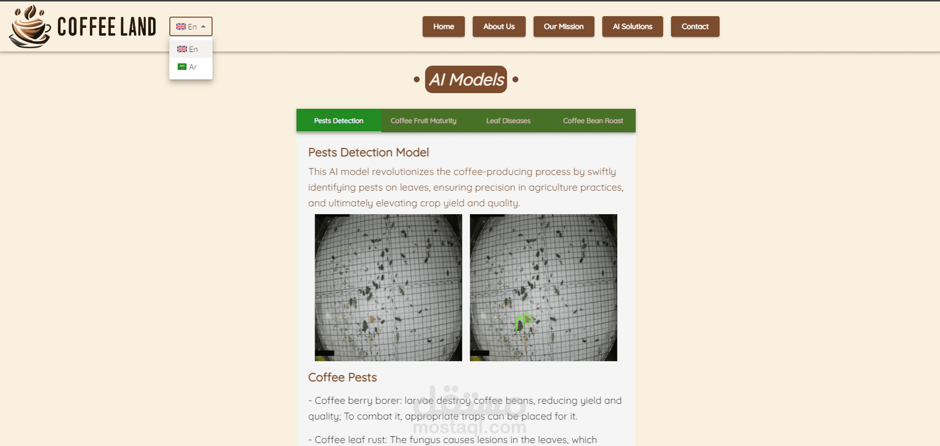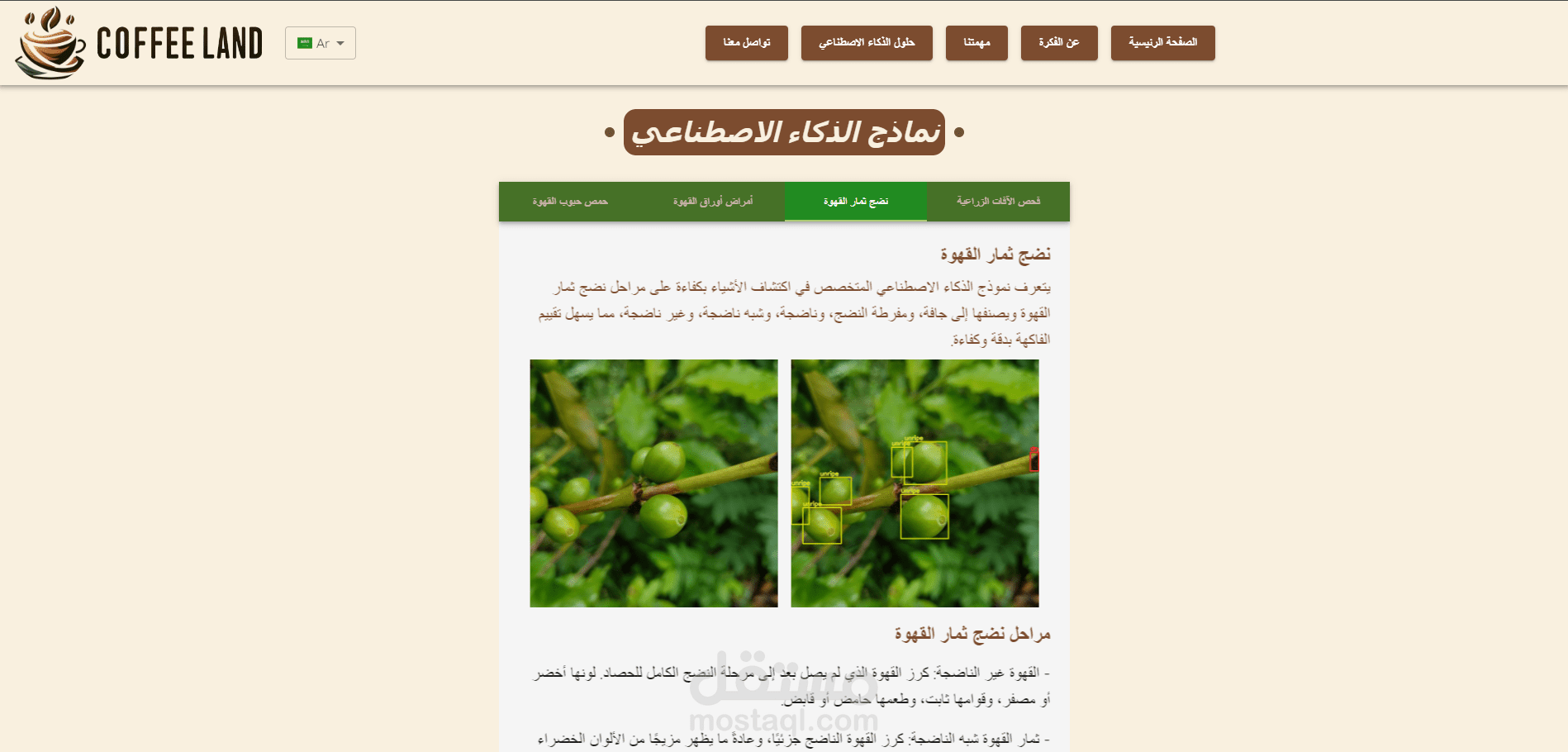 تم تطوير تطبيق ويب لإدارة جودة القهوة مدعوم بالذكاء الاصطناعي، يهدف إلى تحسين عملية إنتاج القهوة. يتضمن التطبيق عدة نماذج متقدمة: نموذج لكشف الآفات يحدد الآفات بسرعة على أوراق القهوة لتحسين صحة المحاصيل وزيادة الإنتاجية، ونموذج لتصنيف نضج ثمار القهوة يحدد بدقة مراحل نضج الثمار من غير ناضجة إلى جافة لضمان حصاد مثالي، ونموذج لكشف أمراض الأوراق يحدد الأمراض بسرعة للتدخل في الوقت المناسب، ونموذج لتصنيف مستويات تحميص حبوب القهوة يقيّم بدقة مستويات التحميص لضمان جودة متسقة وعالية للقهوة. معًا، تعمل هذه النماذج على تبسيط عمليات التقييم وتحسين جودة القهوة بشكل عام.