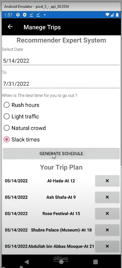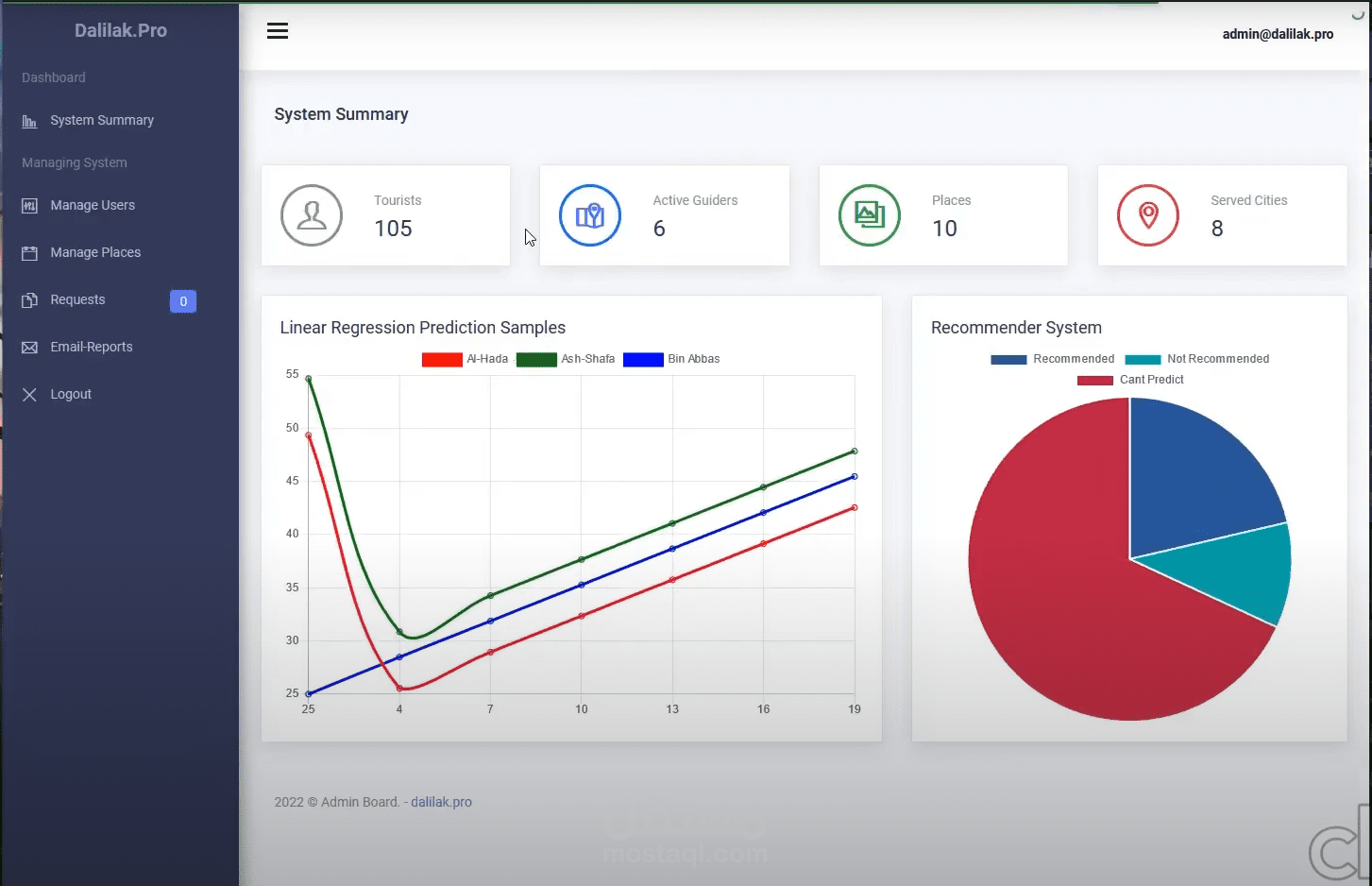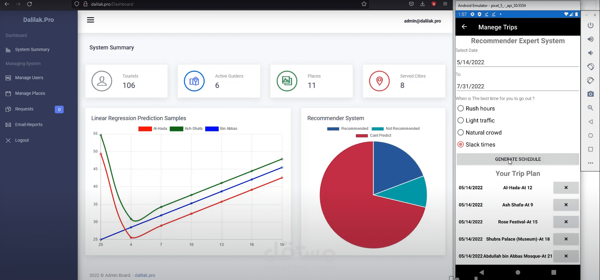 استخدم المشروع خوارزميات الانحدار الخطي وتحليل المصفوفات لانشاء جدول سياحي دقيق للزوار، وقد أثبتت كلتا الخوارزميتين فعاليتها الكبيرة في تحسين نتائج التنبوء. بعد ذلك، تمت مقارنة خوارزميات الشبكات العصبية بالانحدار الخطي لتحديد الطريقة الأكثر دقة وكفاءة. أكدت هذه المقارنة التزام المشروع بتحقيق دقة تنبؤية عالية وأداء نظام متفوق.