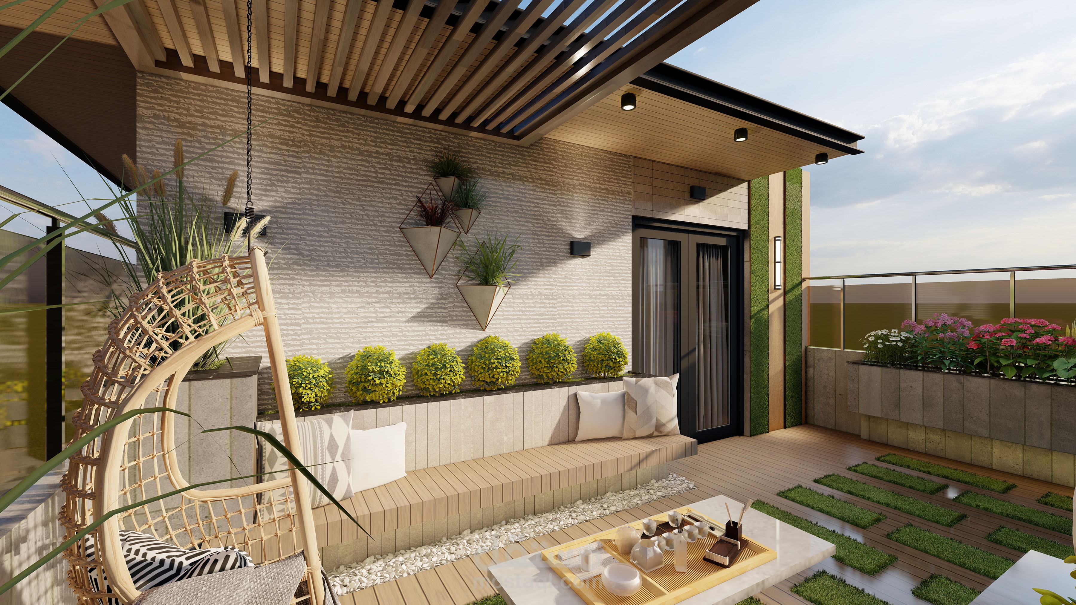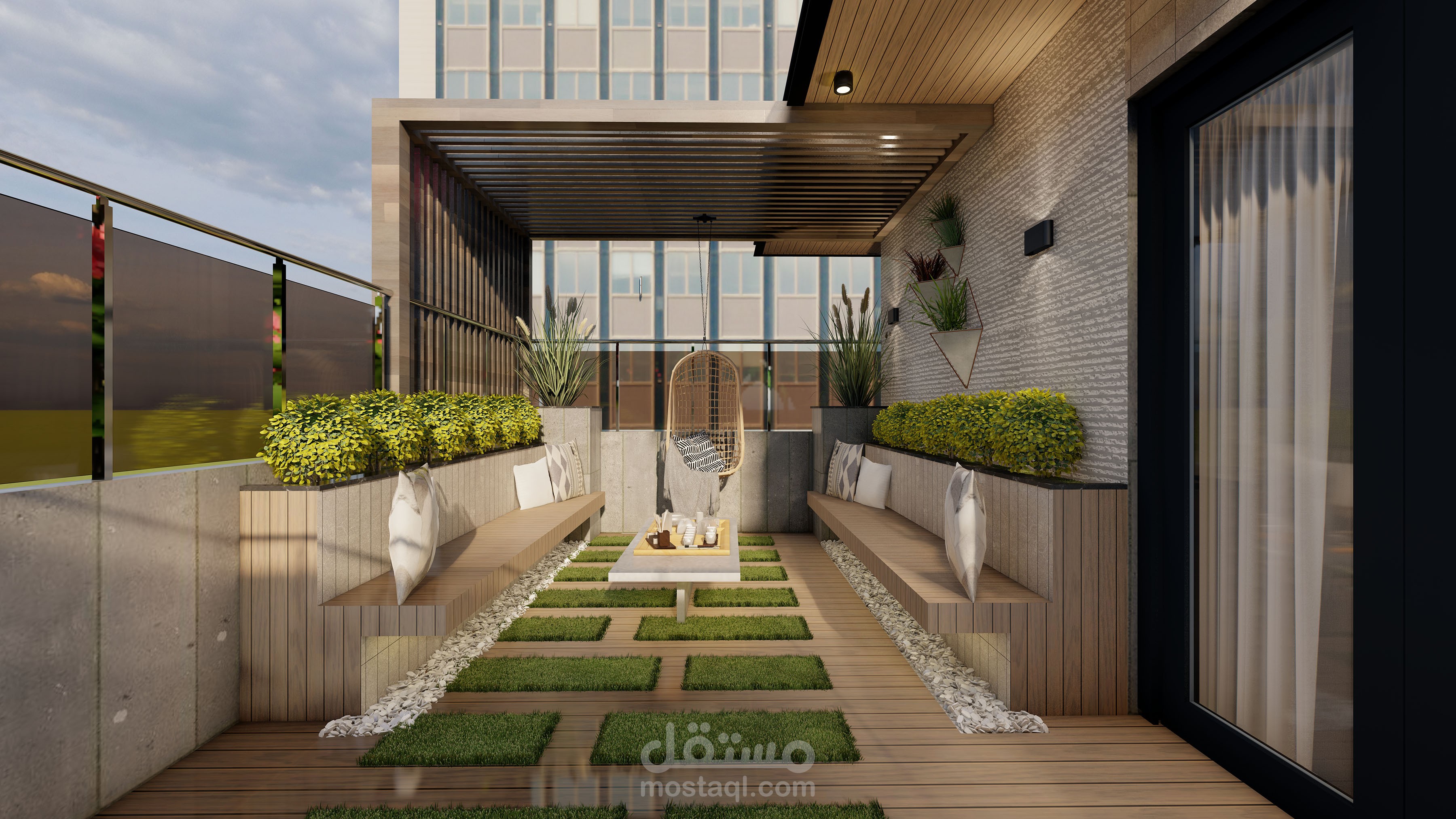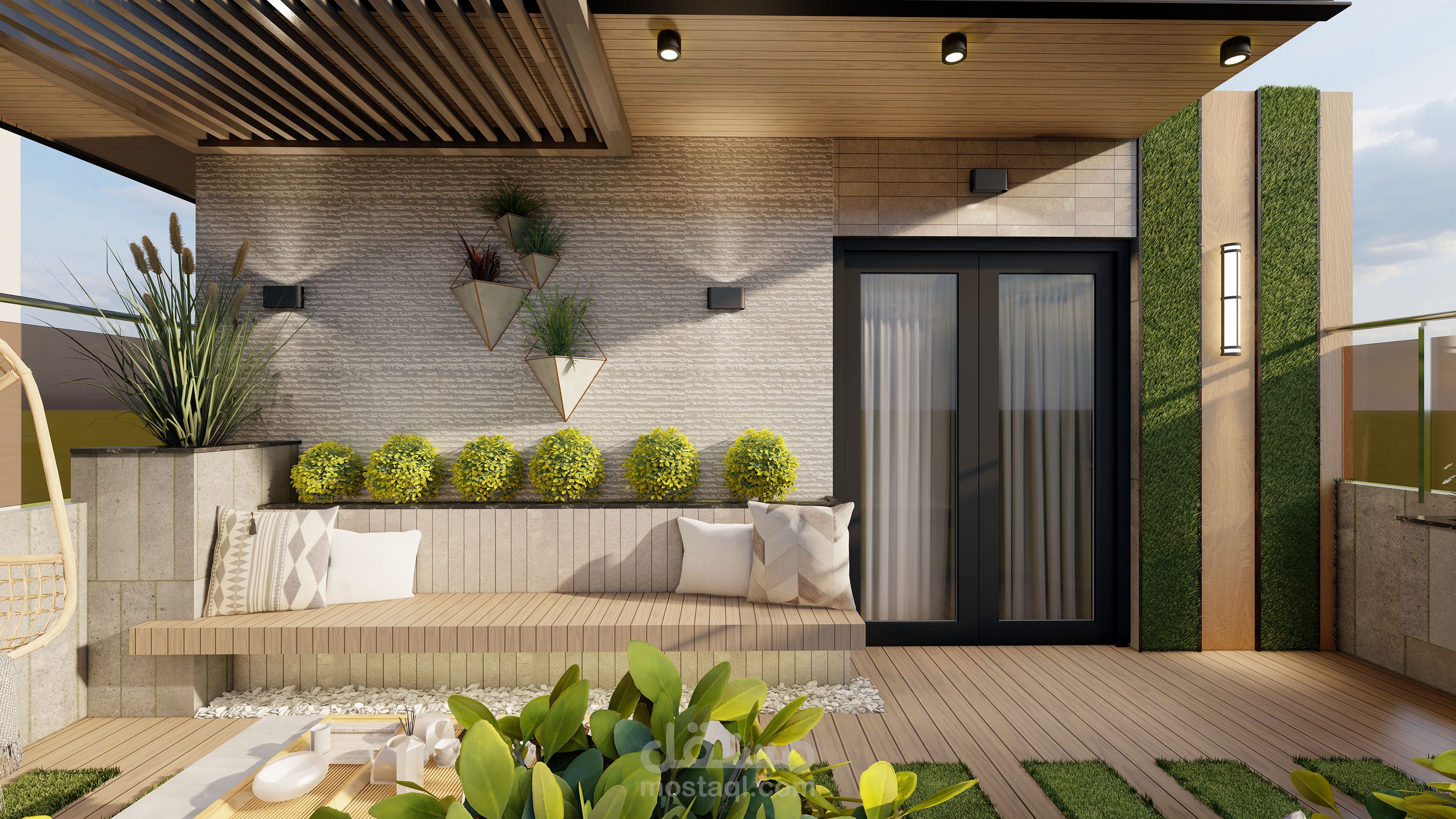 تم تصميم روف على الطراز الحيث وليعبر في الراحة والاسترخاء وتم استخرام مواد حديثة وموفرة وقابلة لتغير بعد عمر من التصميم لتجديد وتغير المواد دون معاناه وتم استحدام ديكور هادئ وبسيط ويكون جميل والزي يعبر على الحداثة وتم استخرام الخشب الطبيعي على الجدران والشجر الطبيعي على الجدران وتم عمل حلسة هادئة والتي تخنوي على الكنب المريخ والناعم وتم عمل في الوسط مكان لوضع الااحتياجات اللازمة .