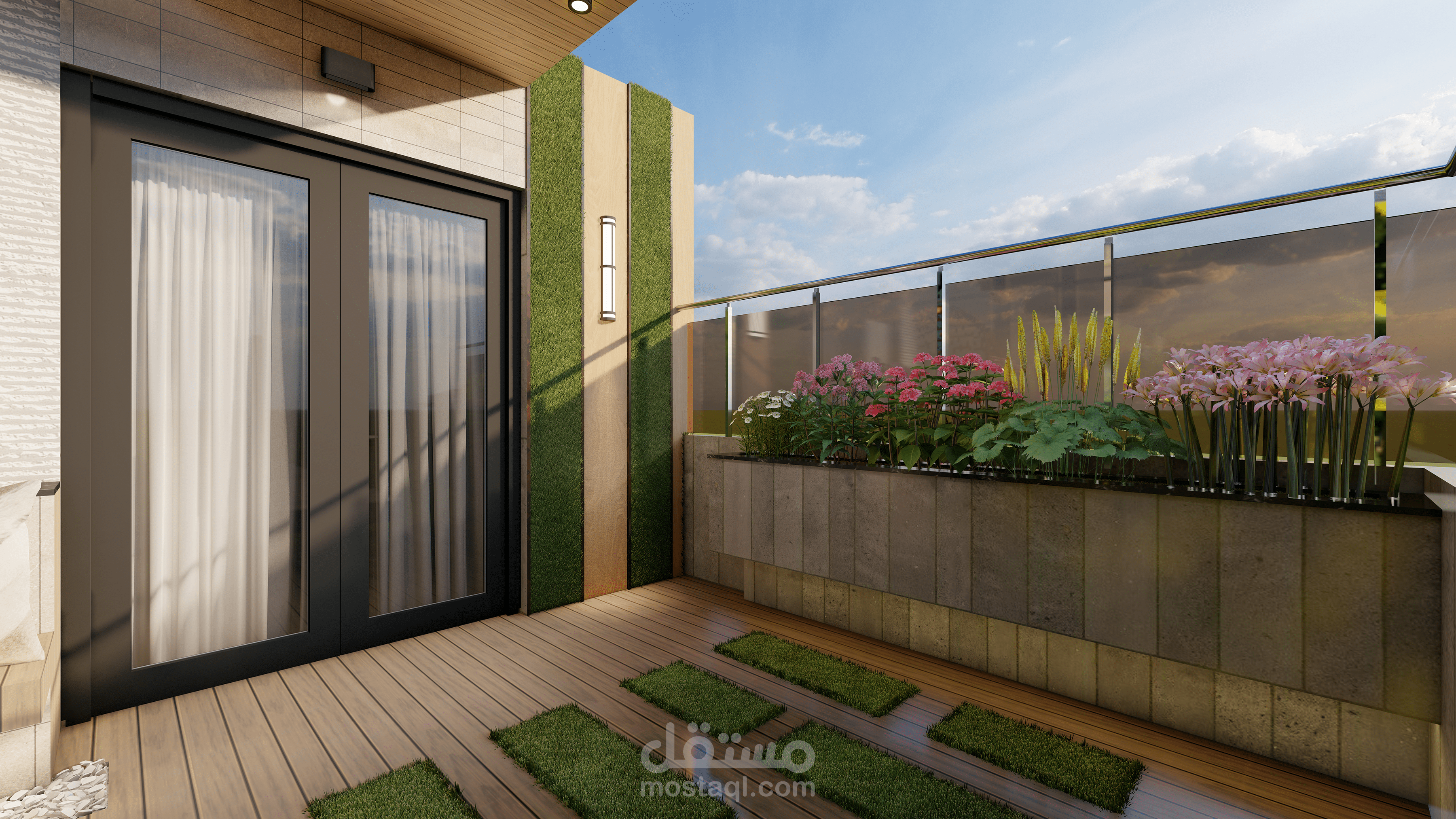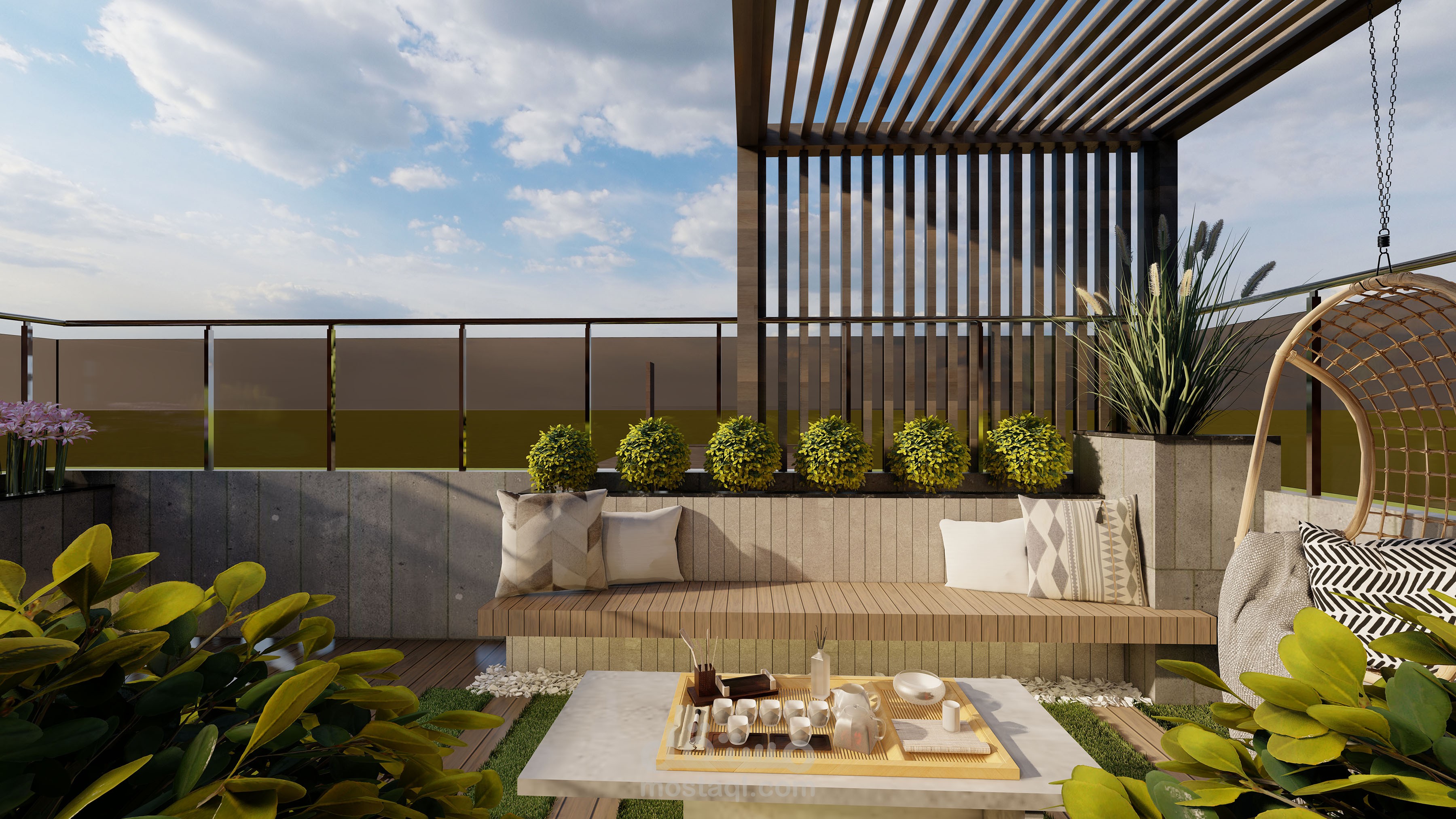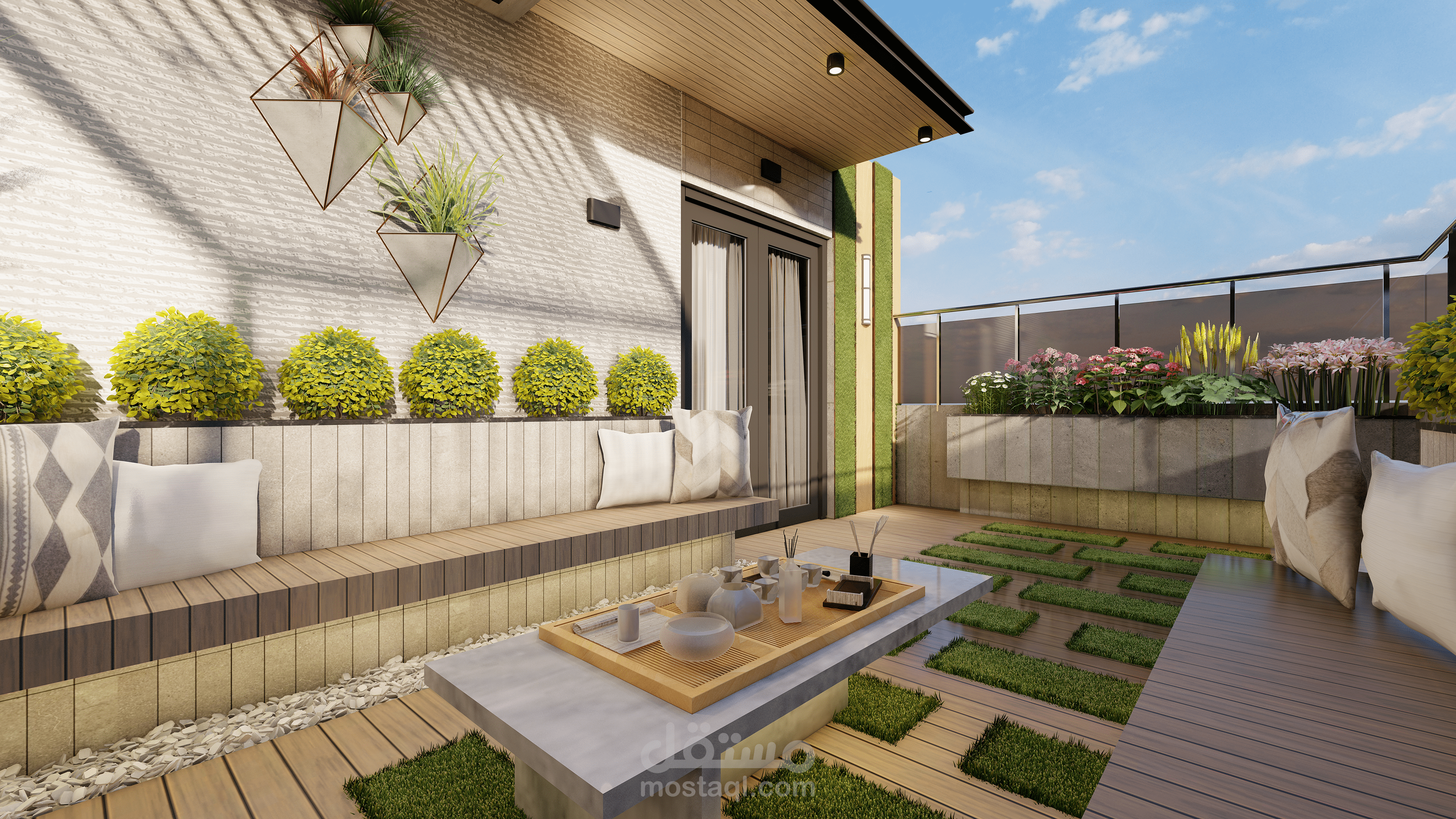 تم تصميم روف على الطراز الحيث وليعبر في الراحة والاسترخاء وتم استخرام مواد حديثة وموفرة وقابلة لتغير بعد عمر من التصميم لتجديد وتغير المواد دون معاناه وتم استحدام ديكور هادئ وبسيط ويكون جميل والزي يعبر على الحداثة وتم استخرام الخشب الطبيعي على الجدران والشجر الطبيعي على الجدران وتم عمل حلسة هادئة والتي تخنوي على الكنب المريخ والناعم وتم عمل في الوسط مكان لوضع الااحتياجات اللازمة .