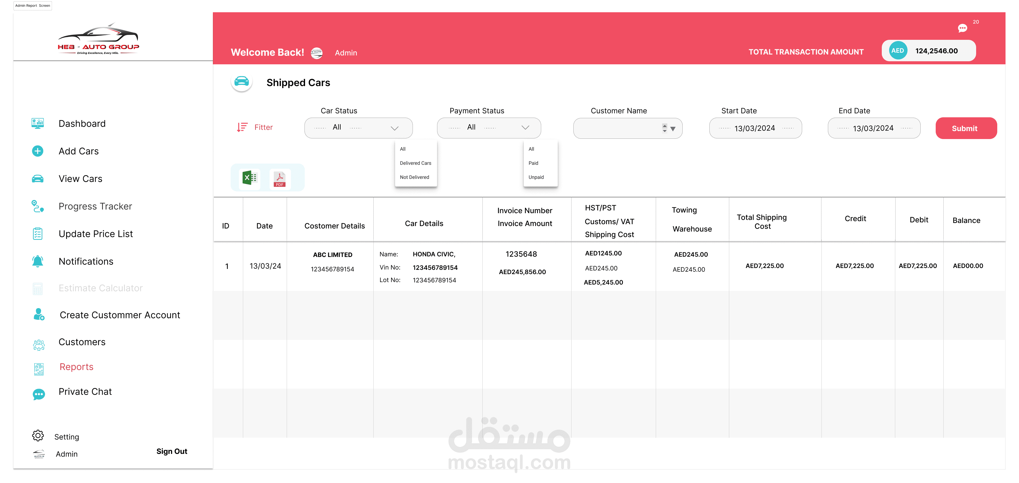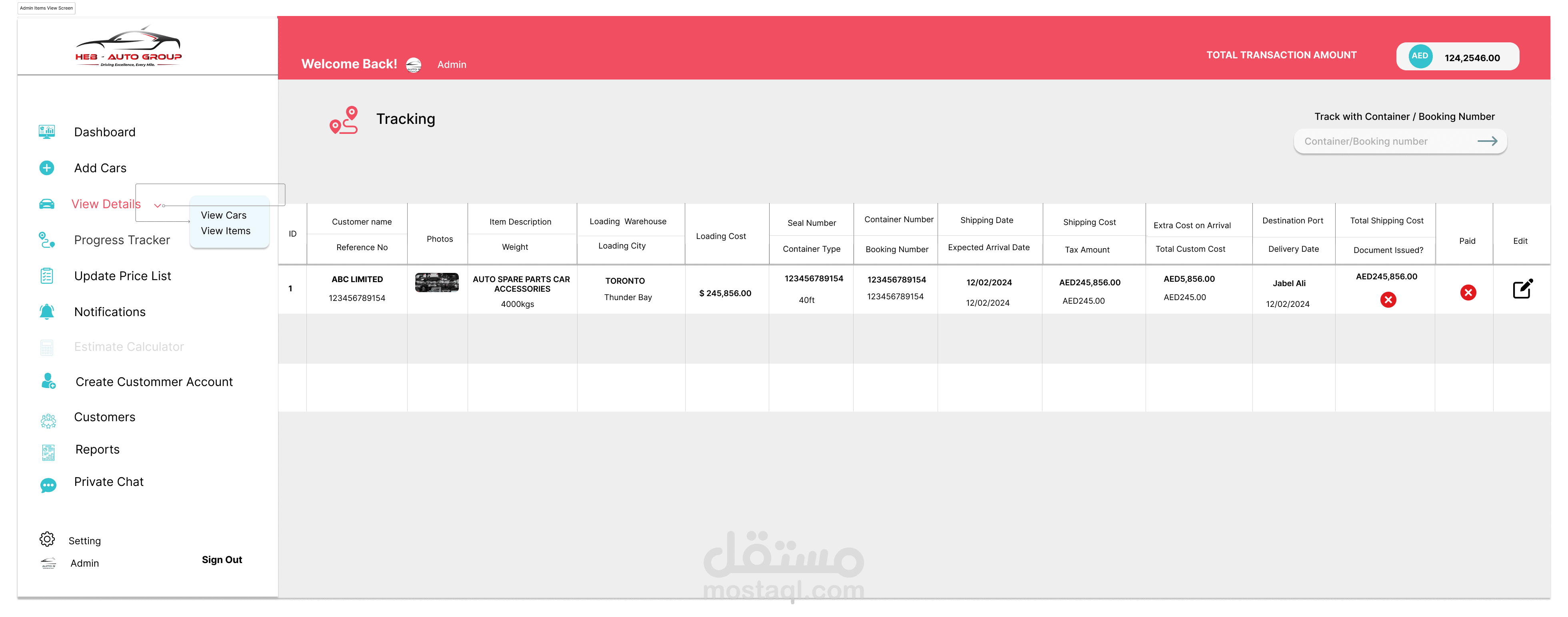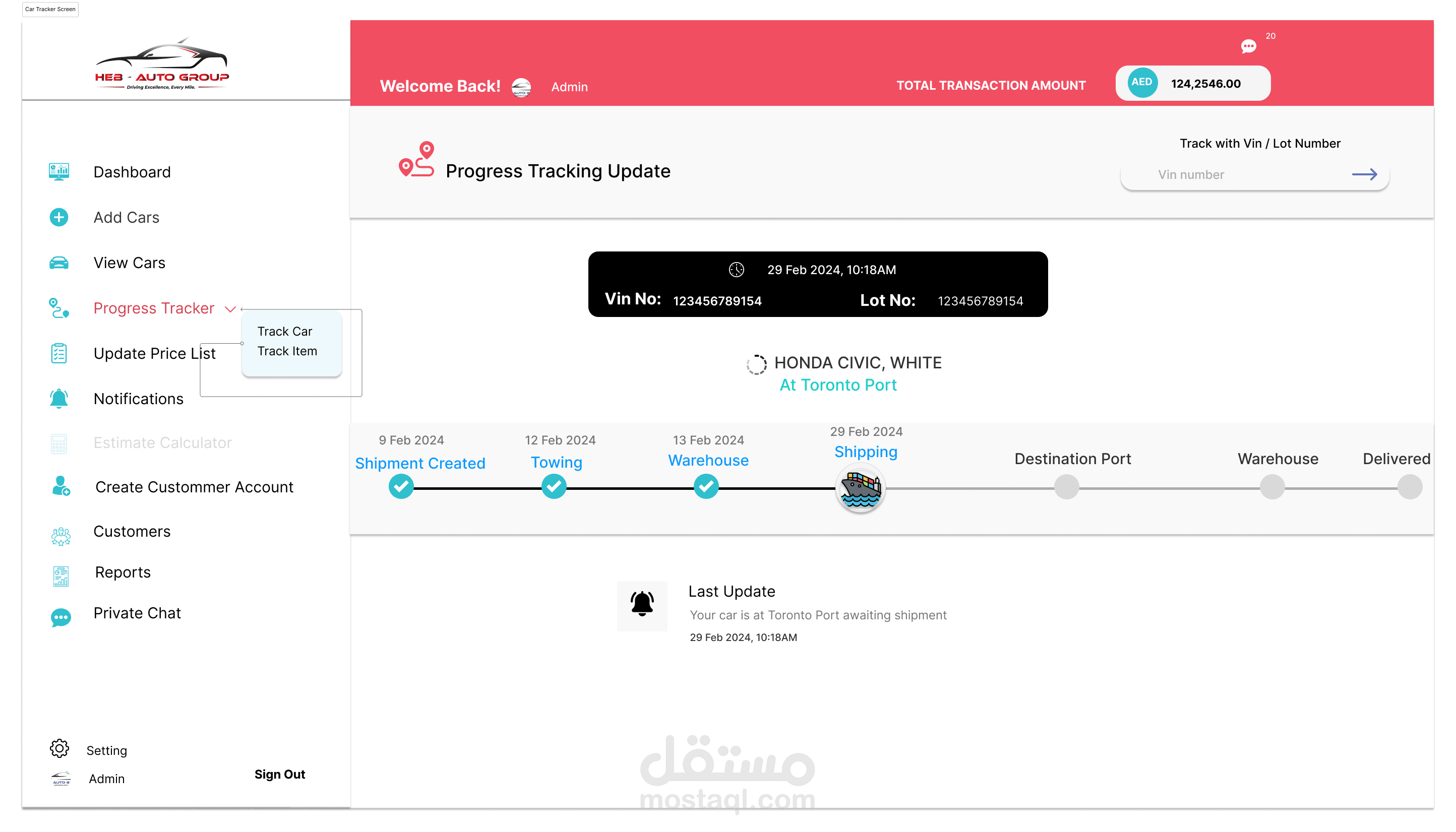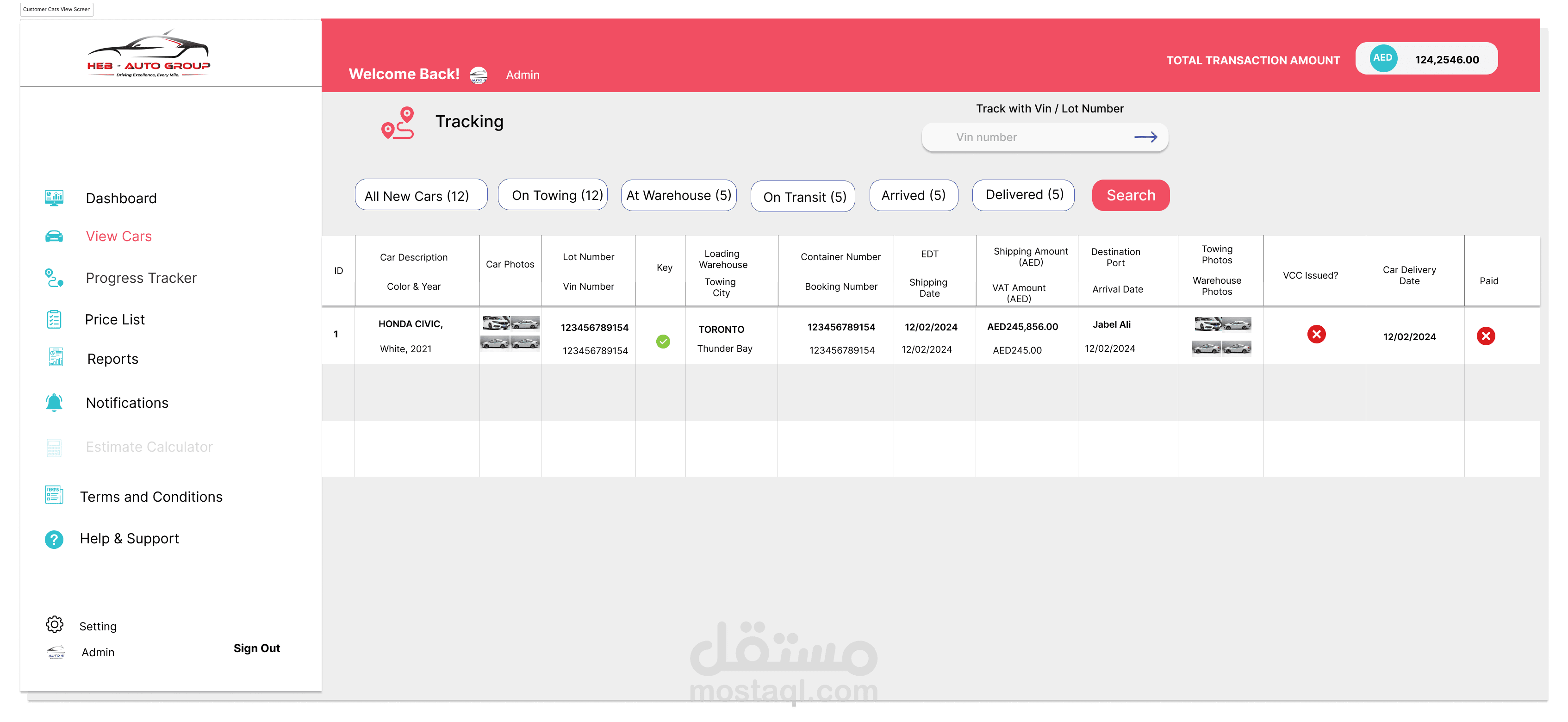 إدارة المخزون: يتابع السيارات التي تنتظر الشحن، بما في ذلك تفاصيل مثل العلامة التجارية، والطراز، والحالة.