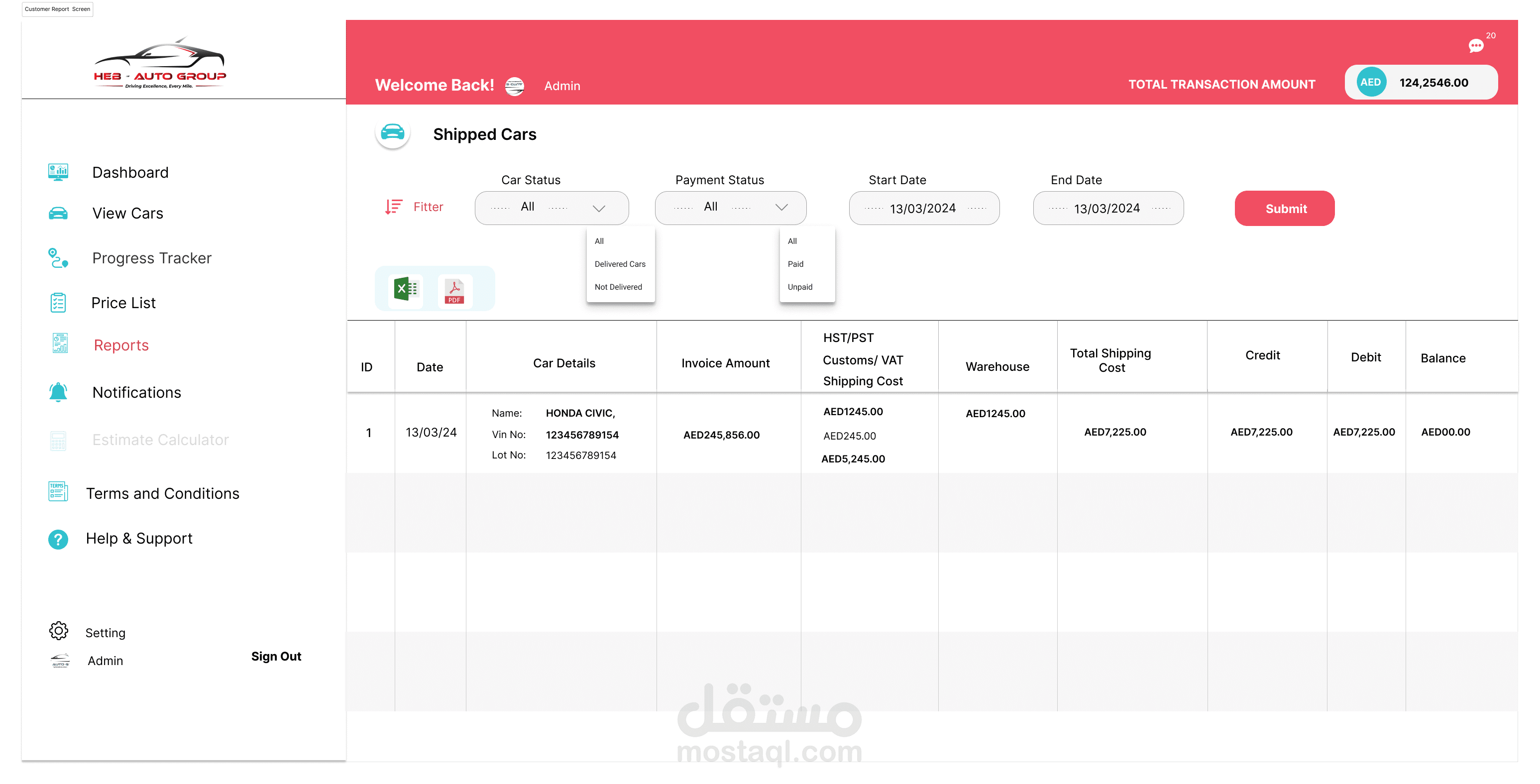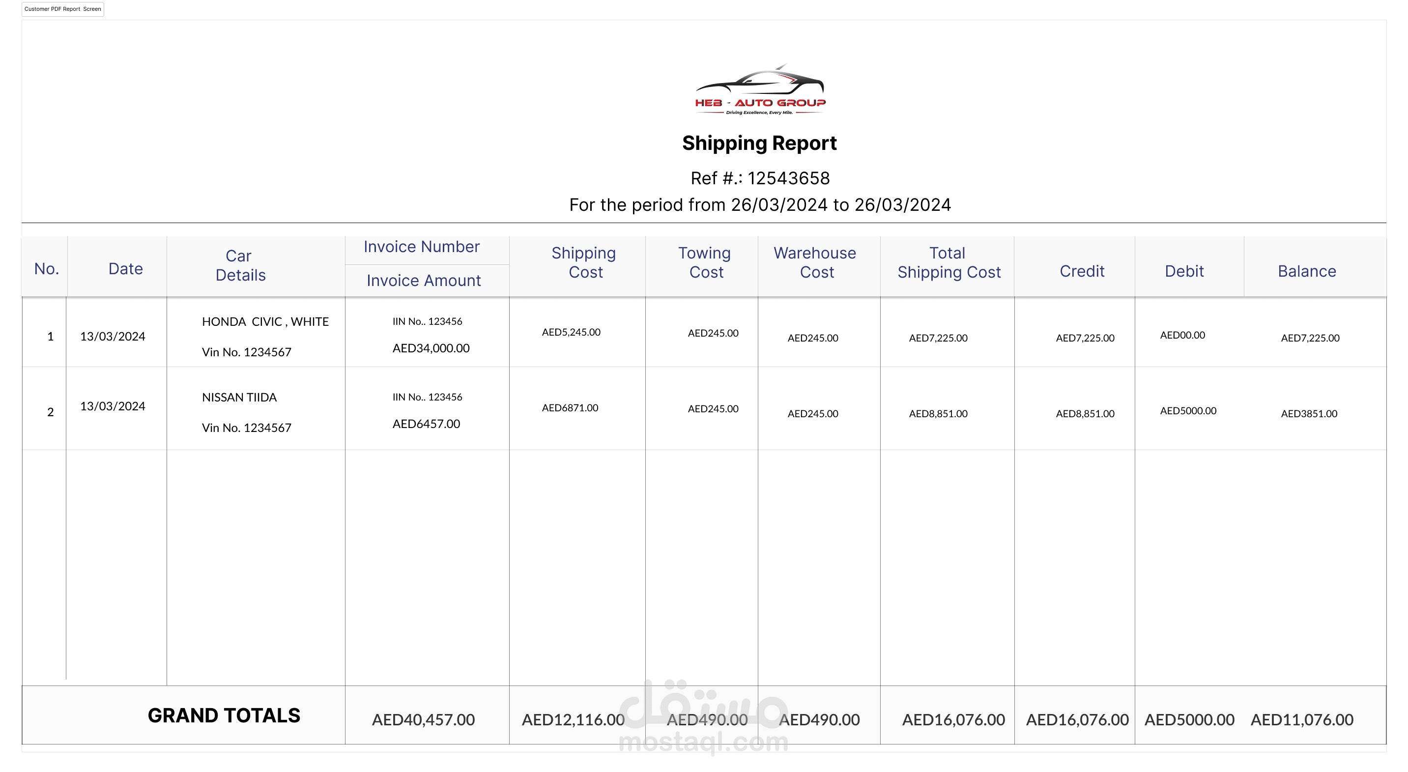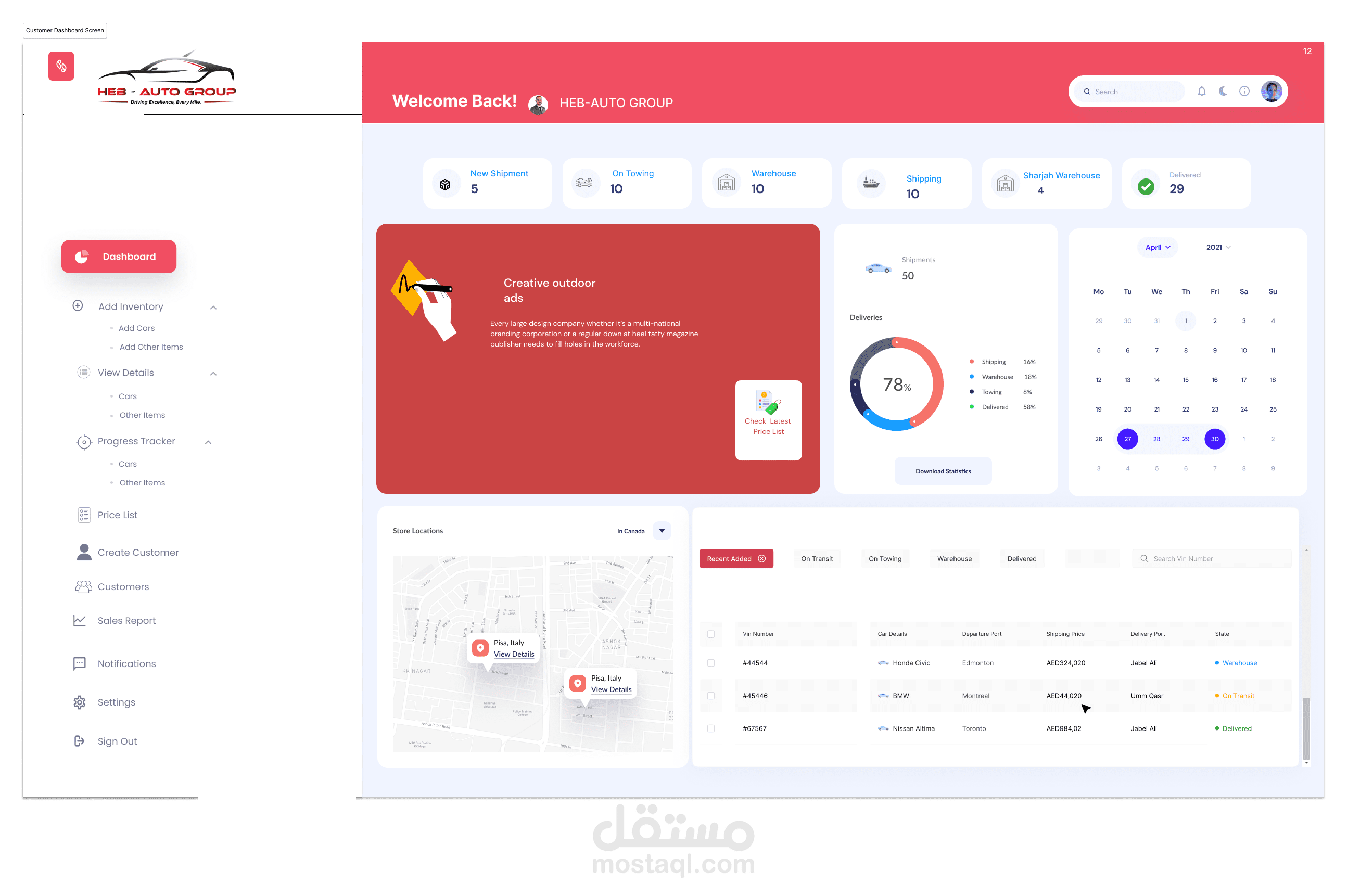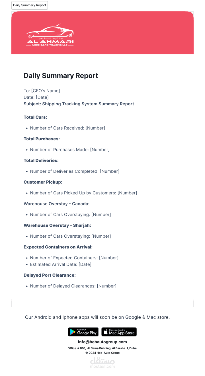 إدارة المخزون: يتابع السيارات التي تنتظر الشحن، بما في ذلك تفاصيل مثل العلامة التجارية، والطراز، والحالة.