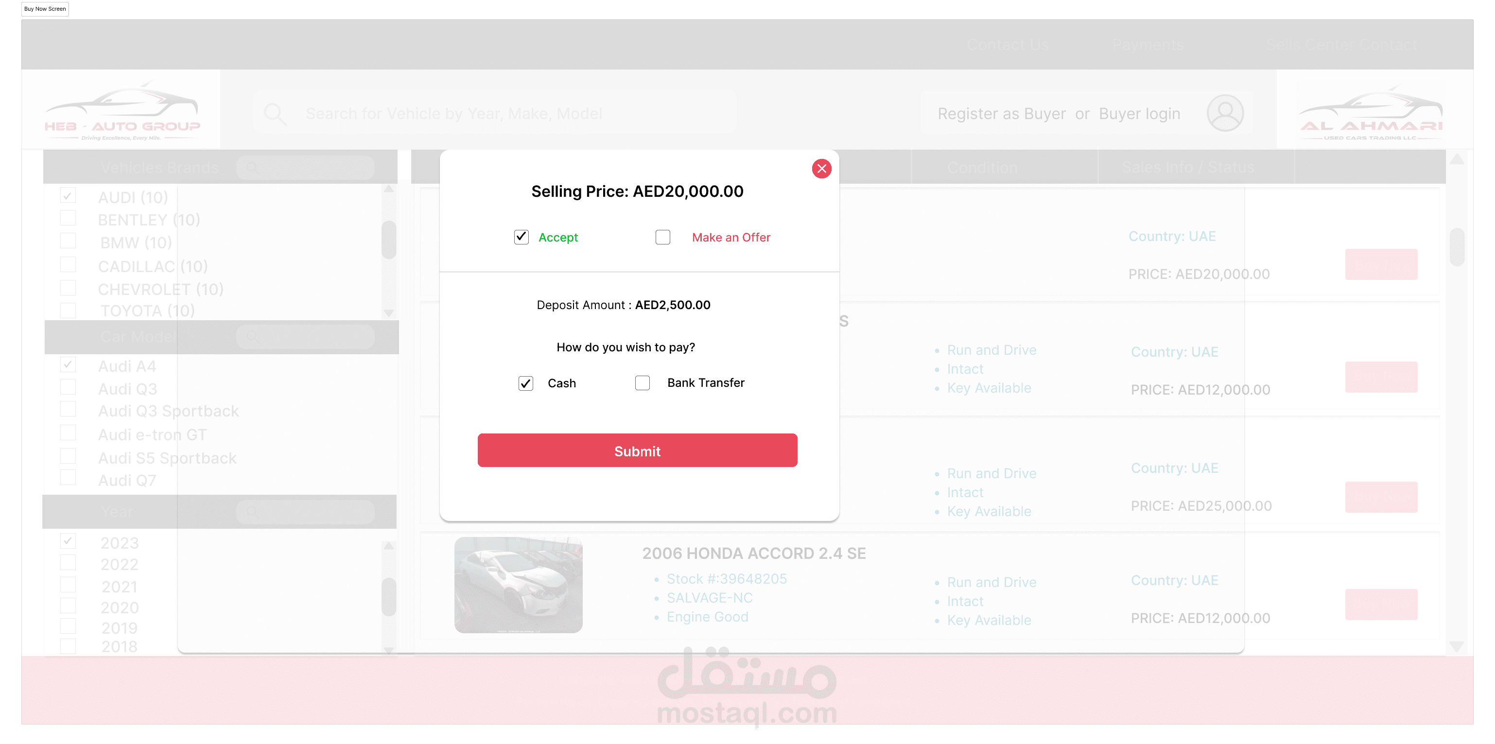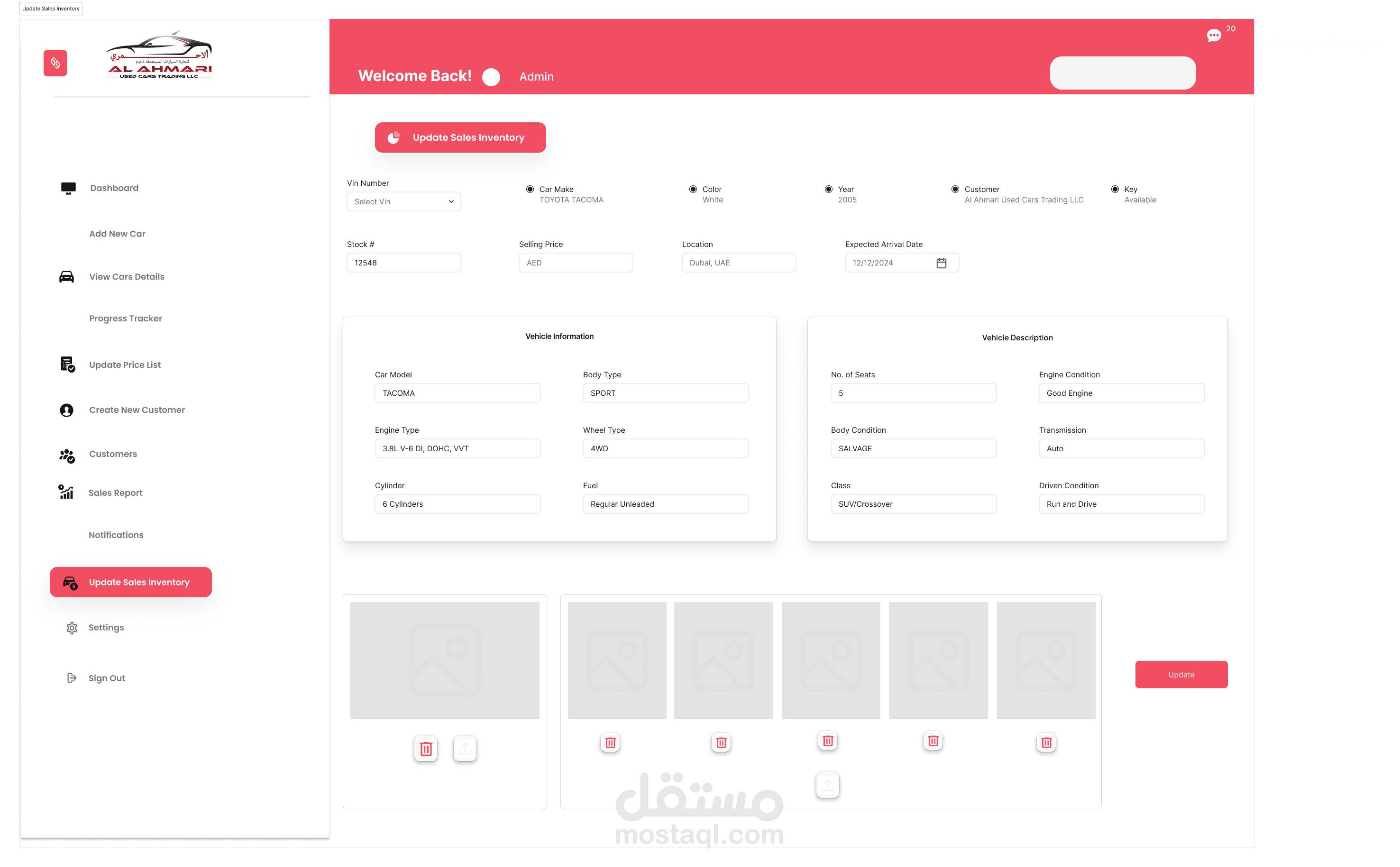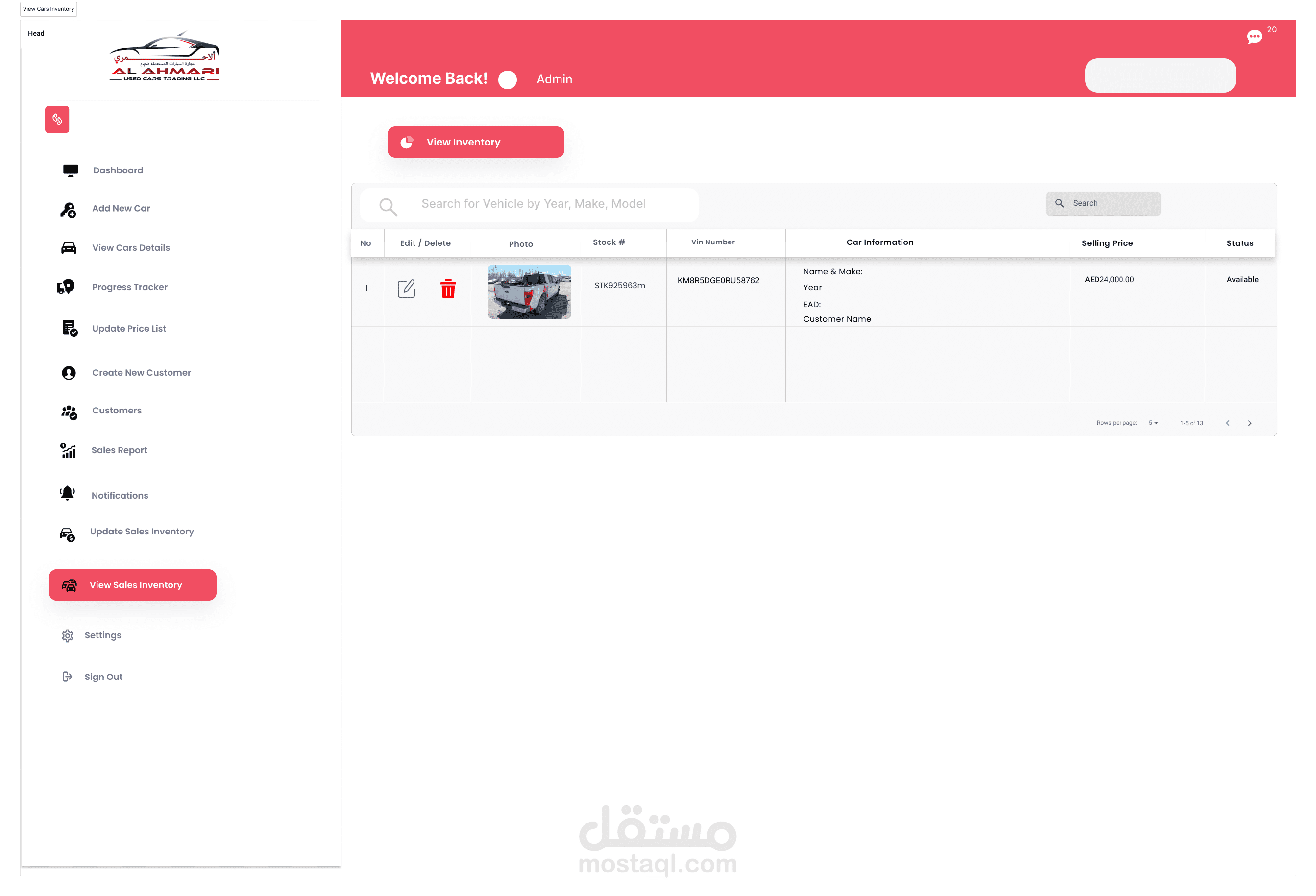 إدارة المخزون: يتتبع ويدير تفاصيل السيارات المتاحة للبيع، بما في ذلك العلامة التجارية، والطراز، وسنة الصنع، والمسافة المقطوعة، والتسعير.