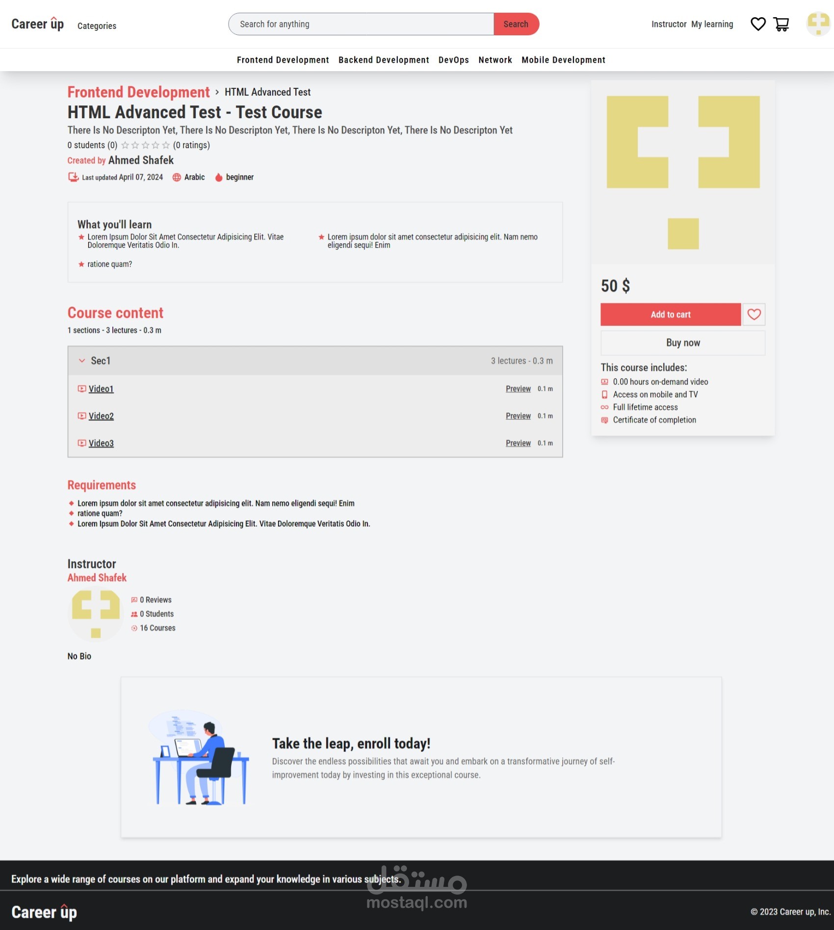 "Career Up هو منصة شبيهة بـ Udemy، تقدم مجموعة واسعة من الدورات لتطوير المهارات المهنية. تستخدم المنصة تقنيات مثل React، RTK Query، TypeScript، وTailwind لتقديم تجربة مستخدم سهلة وسلسة. يمكن للمستخدمين الوصول إلى دورات يقودها خبراء لتعزيز مهاراتهم والبقاء في طليعة سوق العمل.