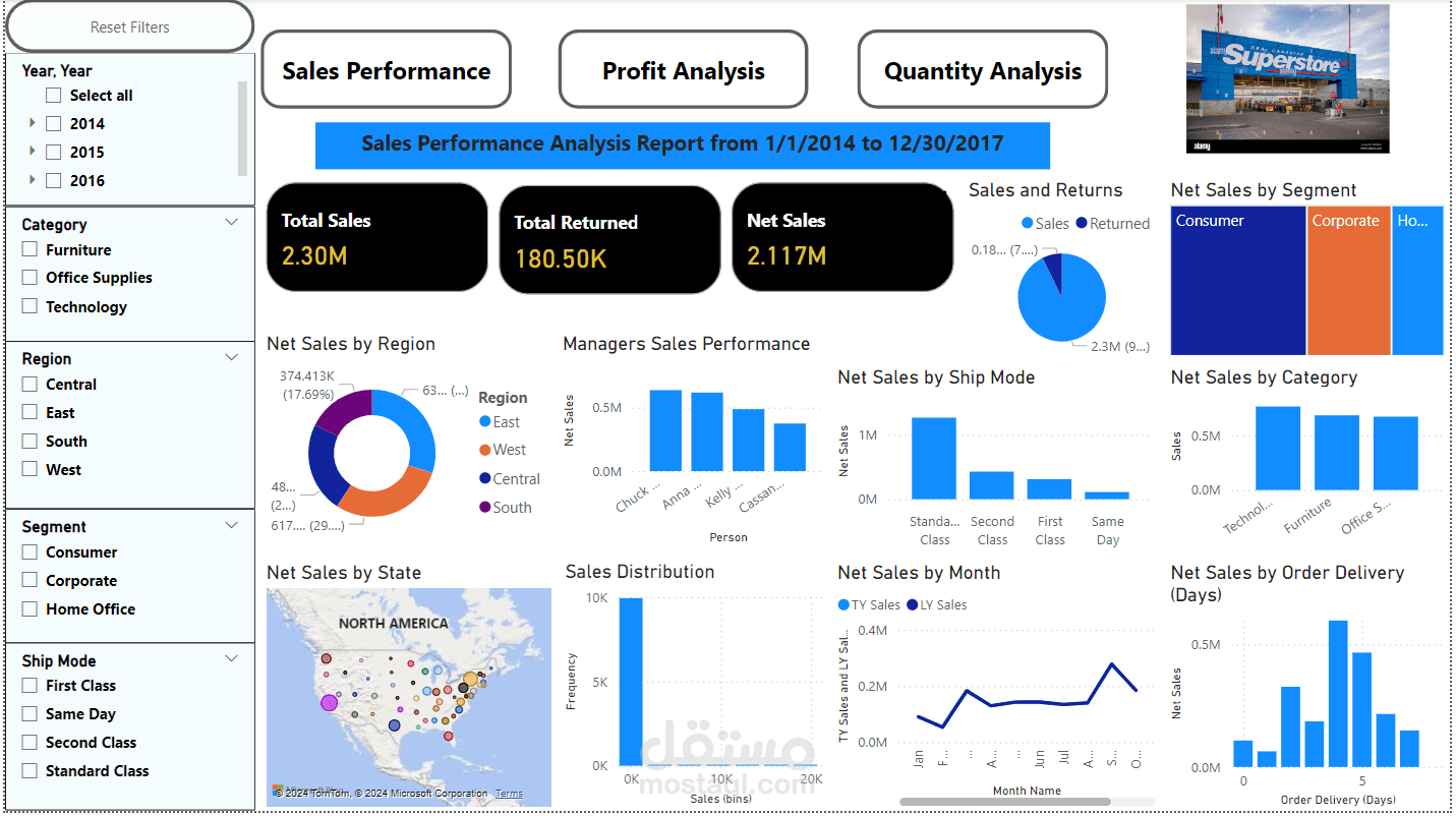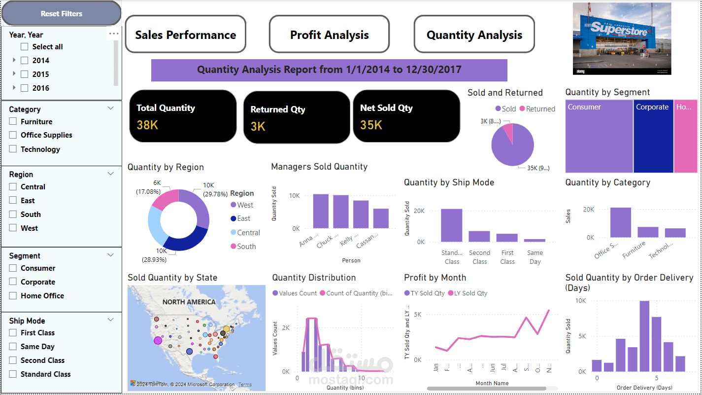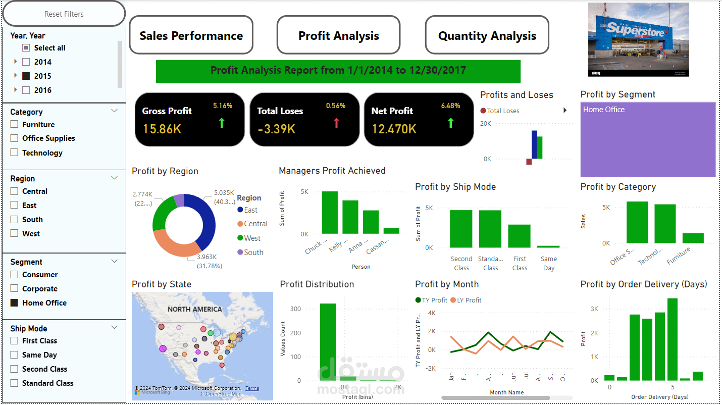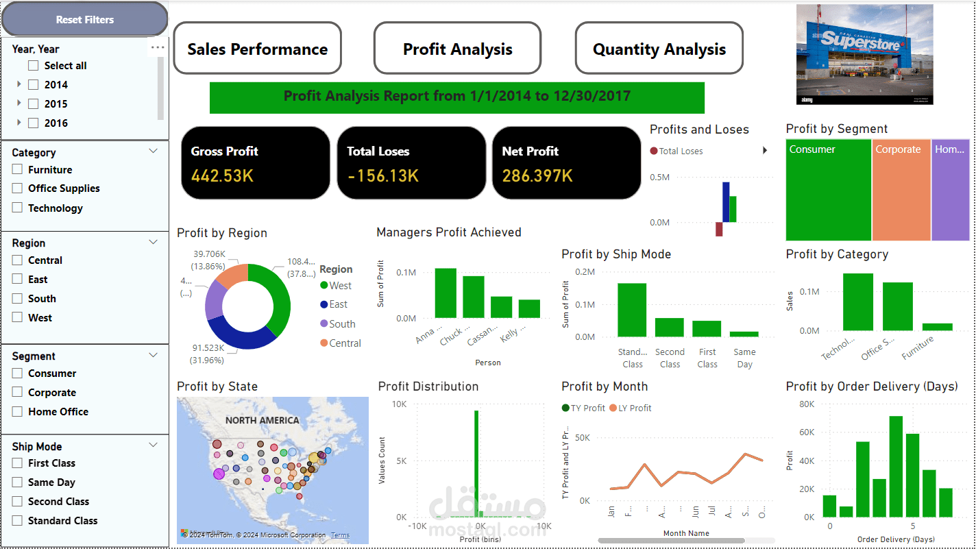 تصور تحليل مرئي لمجموعة بيانات المتجر الفائق باستخدام Microsoft Power BI.