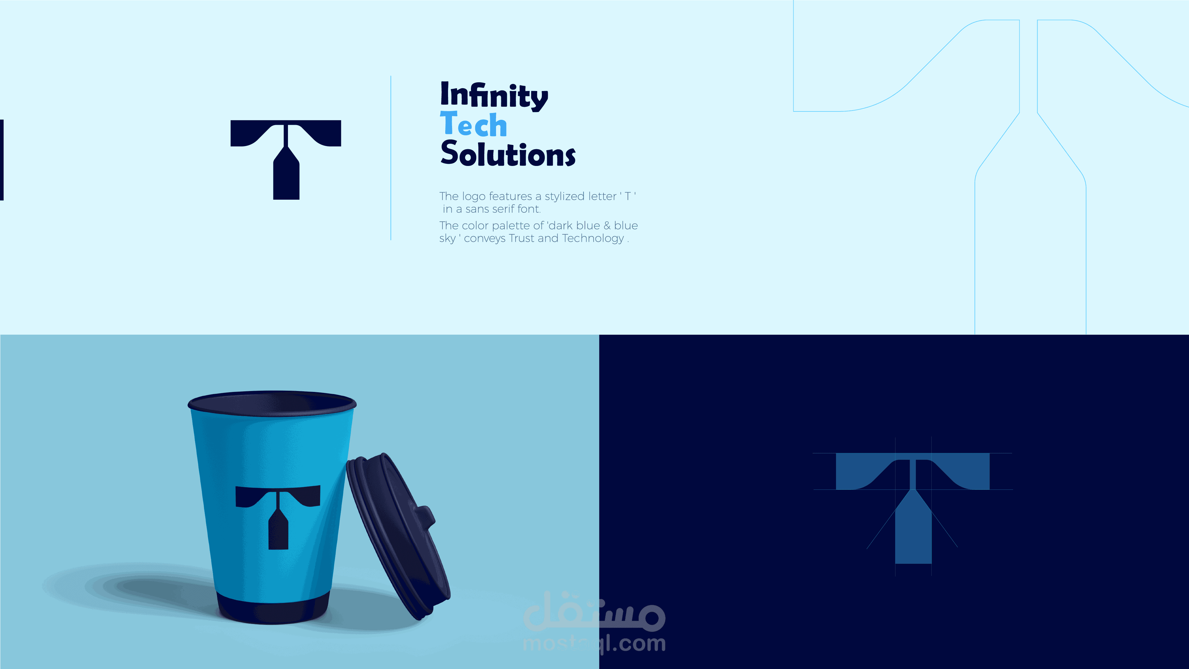 تم الإعماد بشكل كامل على خط وحروف لاتينية لتشكيل الشعار بالإضافة إلى شكل بسيط يجسد حرف "T" , وذلك لإعطاء لمسة إبداعية بالإضافة إلى الحصول على" التميز " .