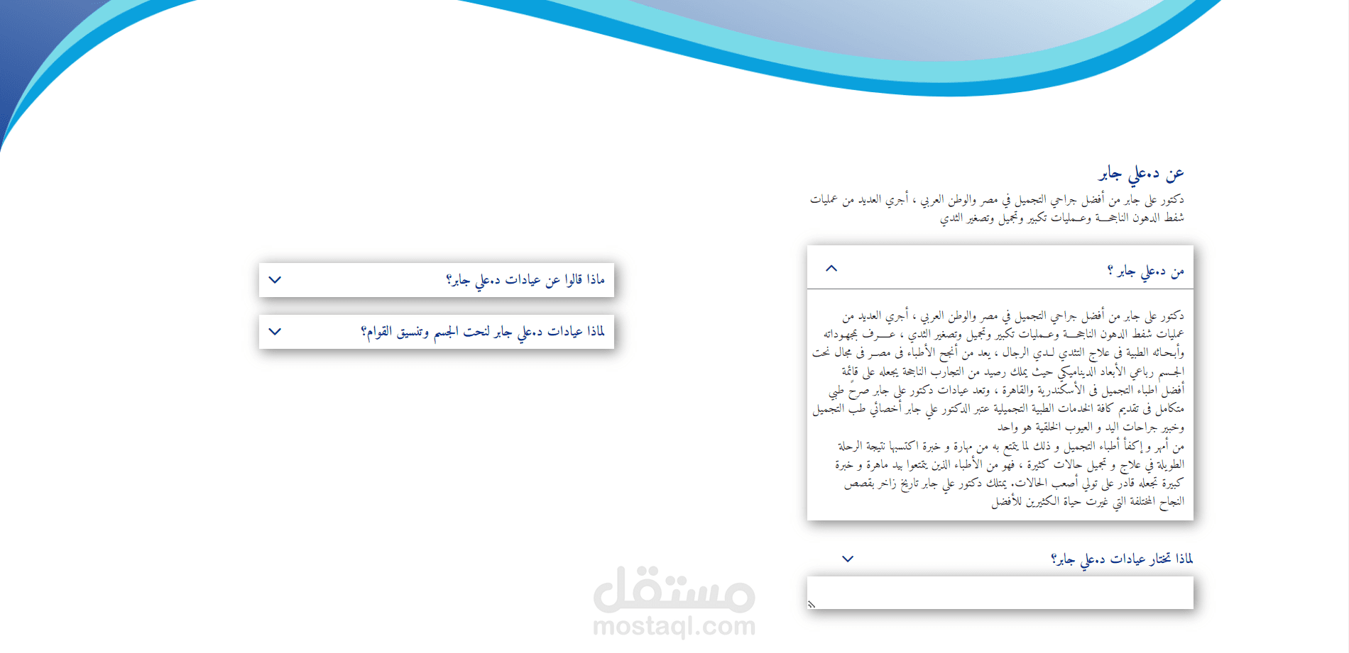 -الميزات: يصف إنجازات الدكتور جابر وخبراته في جراحة التجميل، مع أقسام قابلة للتوسع للحصول على تفاصيل إضافية.