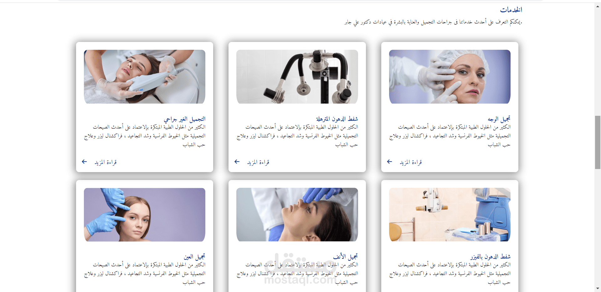 - الميزات: يسرد الخدمات مثل تجميل الوجه، شفط الدهون، التجميل غير الجراحي، وغيرها، مع وصف موجز وروابط لمعرفة المزيد.