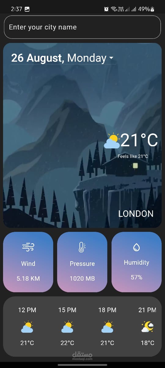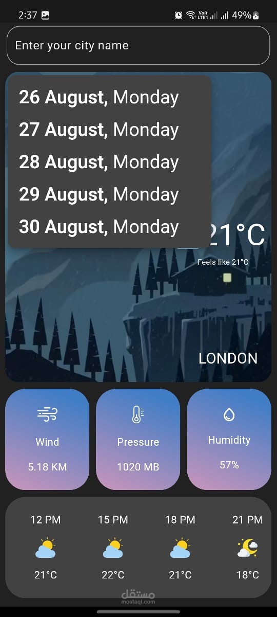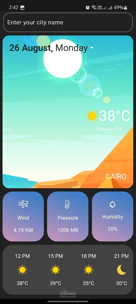لقد قمت بتطوير تطبيق موبايل لمعرفة حالة الطقس عن طريق flutter & Dart وعن طريق استخدام التطبيق الخاص بي يمكنك أن تعرف درجات الحرارة فى أي بلد حول العالم عن طريق كتابة اسم البلد فقط ،عند كتابة اسم البلد بأي لغة ثم البحث عنها سوف تظهر لك جميع البيانات عن درجات الحرارة فى هذه البلد لمدة ست أيام قادمة من اليوم