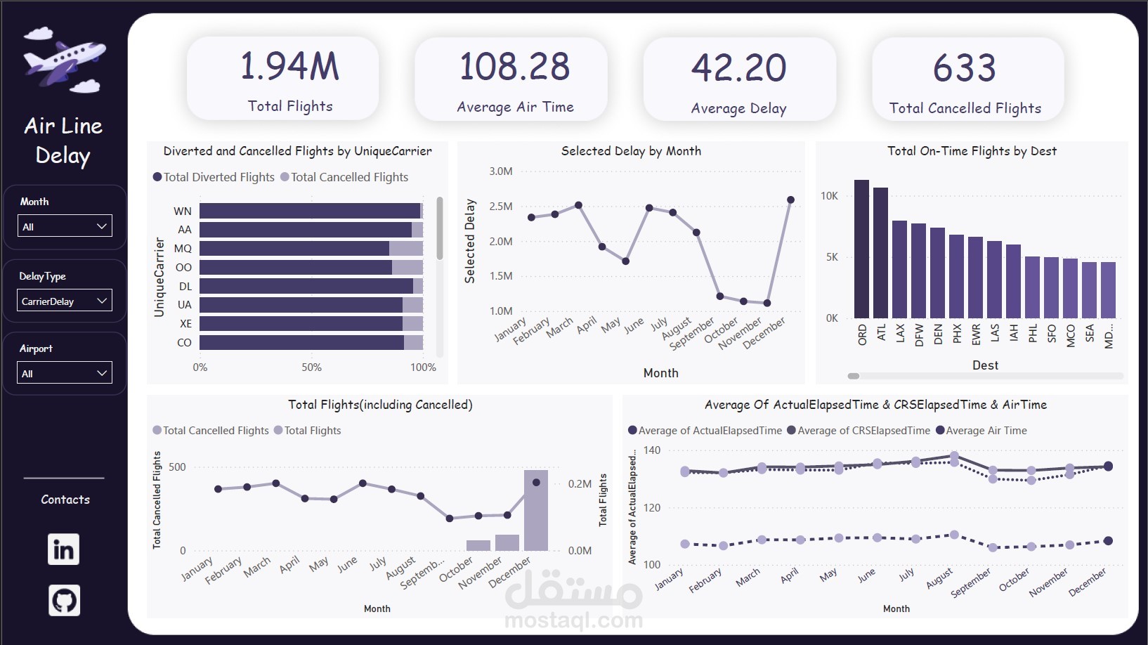 This line chart compares the average of actual elapsed time, scheduled elapsed time, and air time, offering an understanding of how these metrics relate to each other across different months. Filters: Month: Allows users to filter the data based on specific months. Delay Type: Filters data based on the type of delay (e.g., Carrier Delay). Airport: Filters data for specific airports. Contacts: For further information or queries, please reach out via LinkedIn or GitHub, accessible through the links provided in the dashboard.
