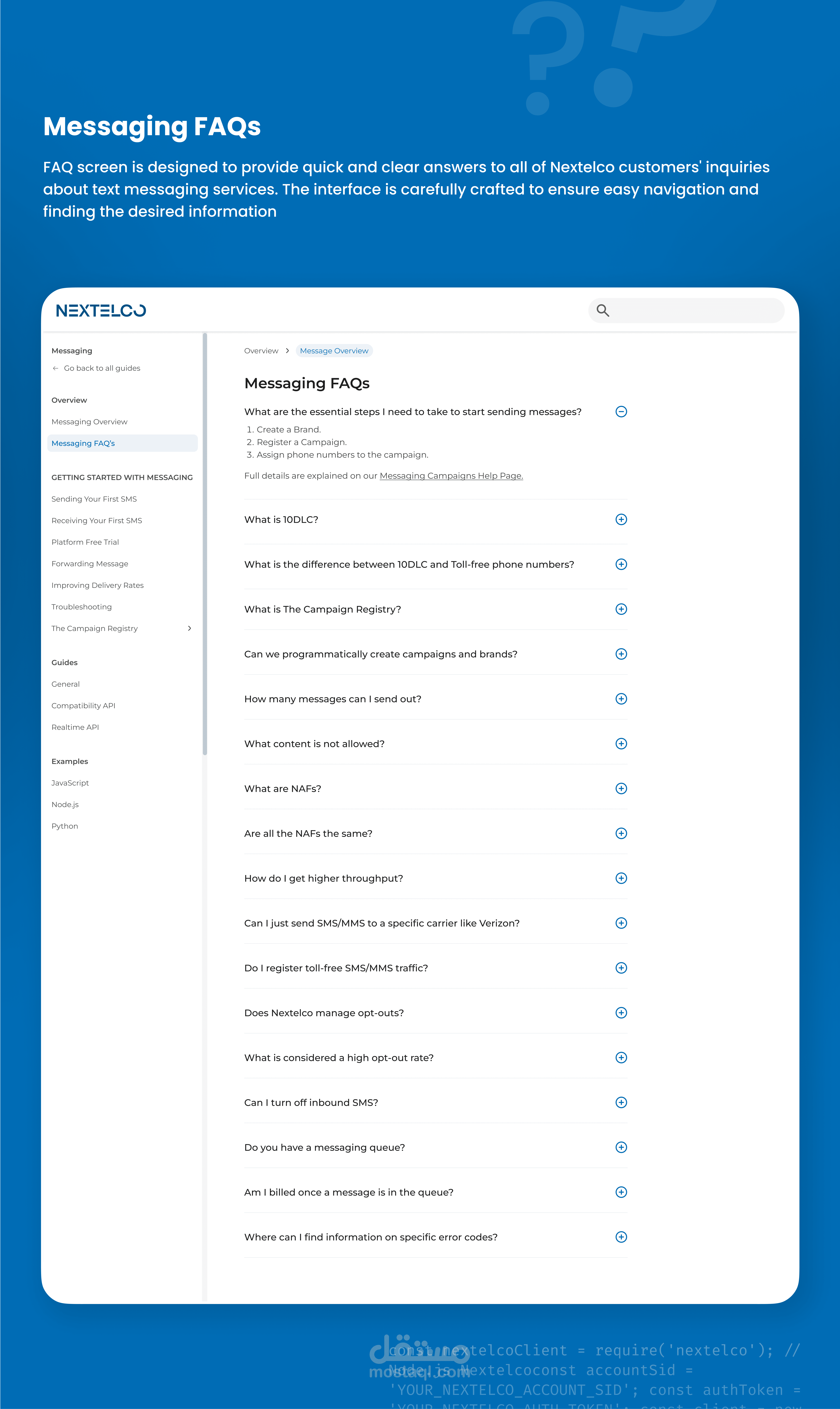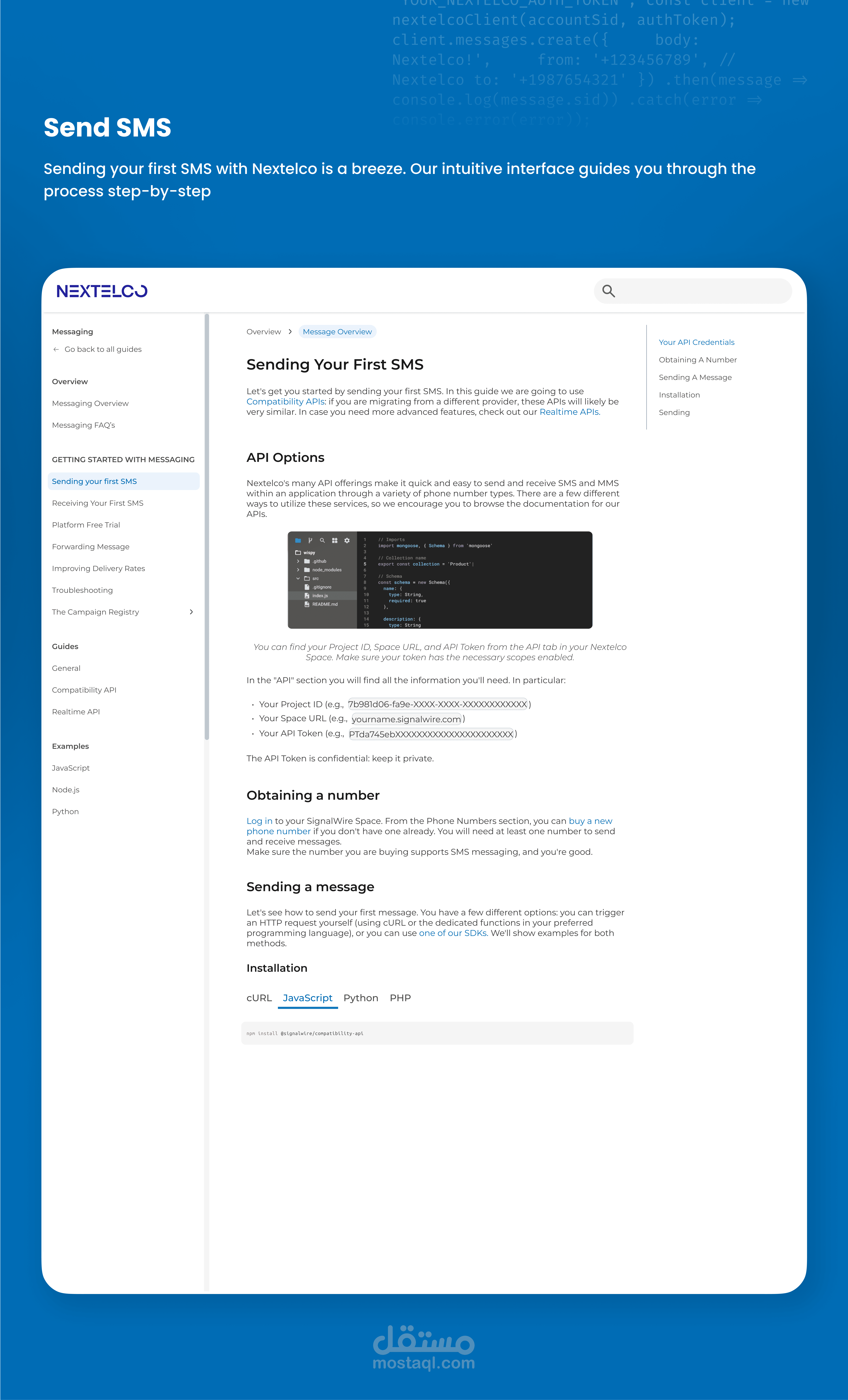 تم تصميم هذه الواجهة لتمكين المطورين من التفاعل بسهولة مع خدمات Nextelco المتنوعة. وانصب التركيز على البساطة والعناصر البصرية الواضحة لتيسير اكتشاف السمات والوثائق.
