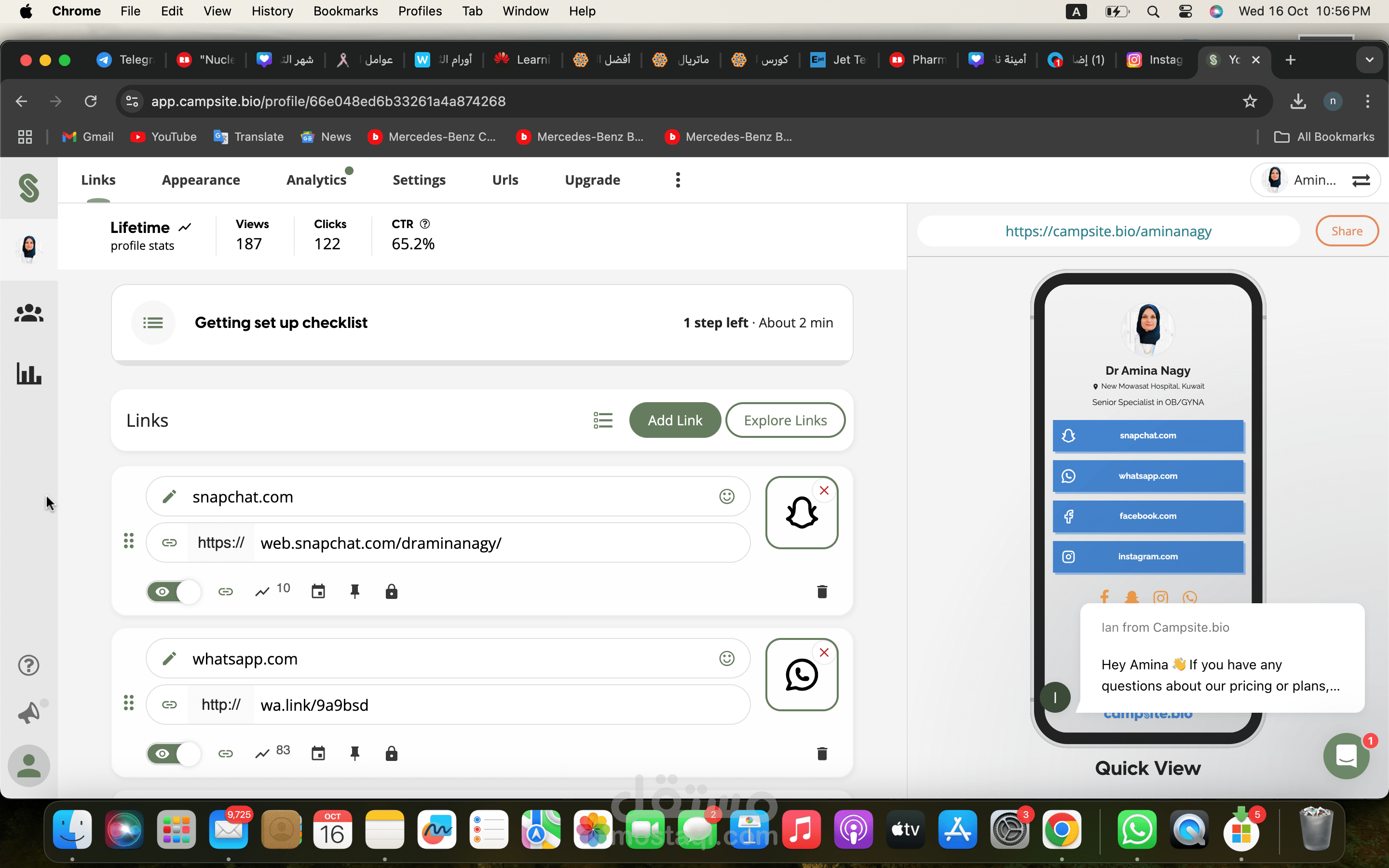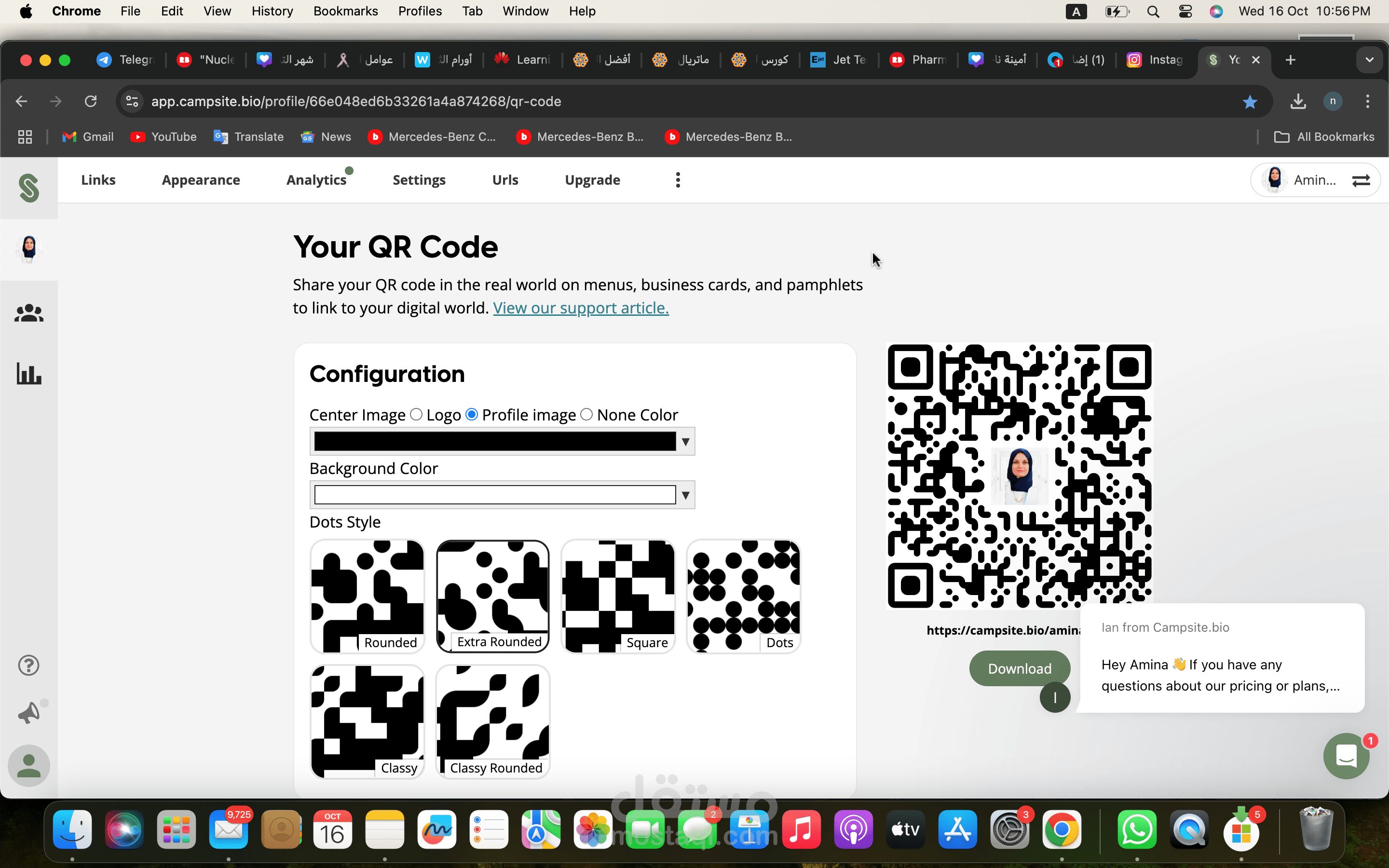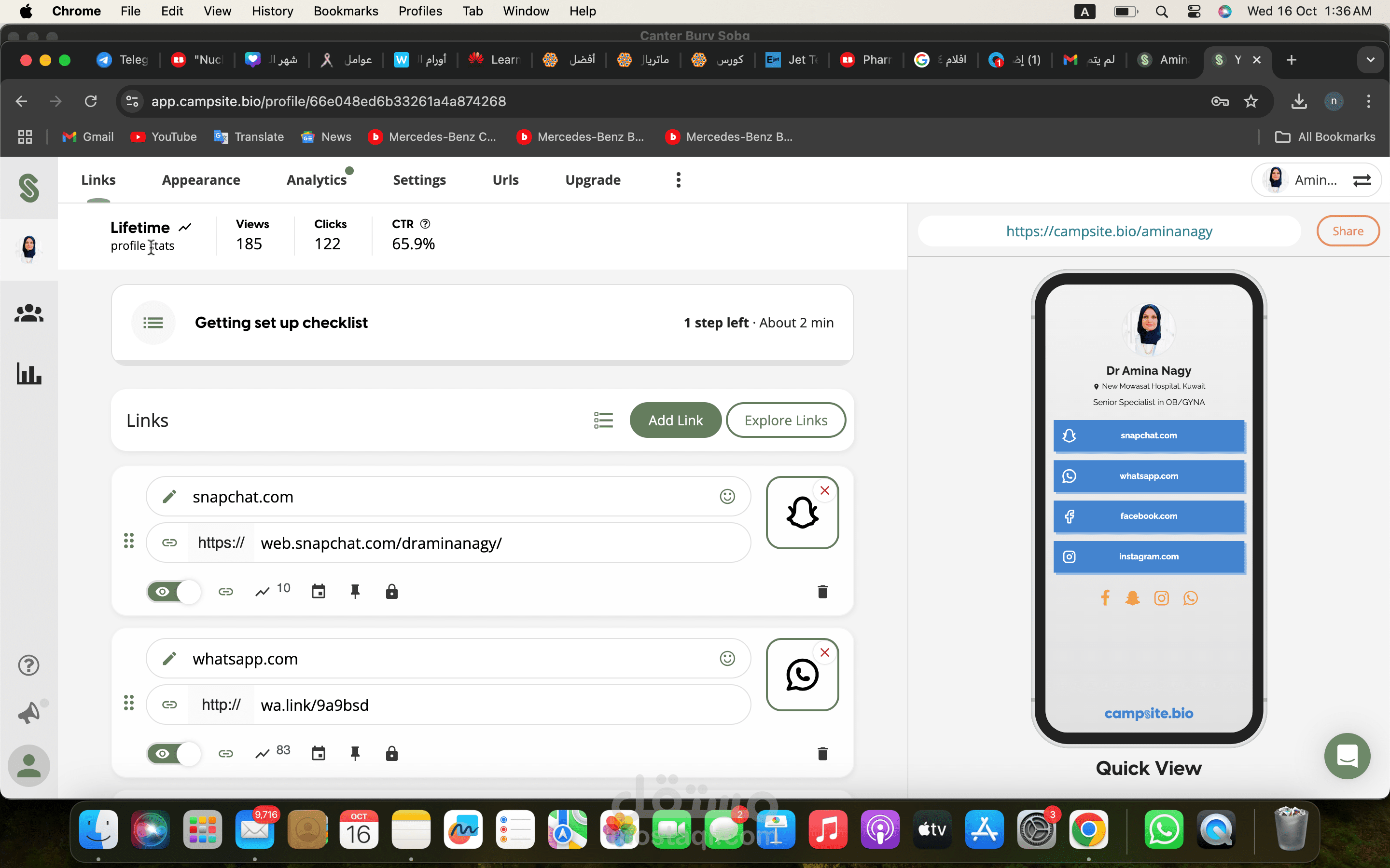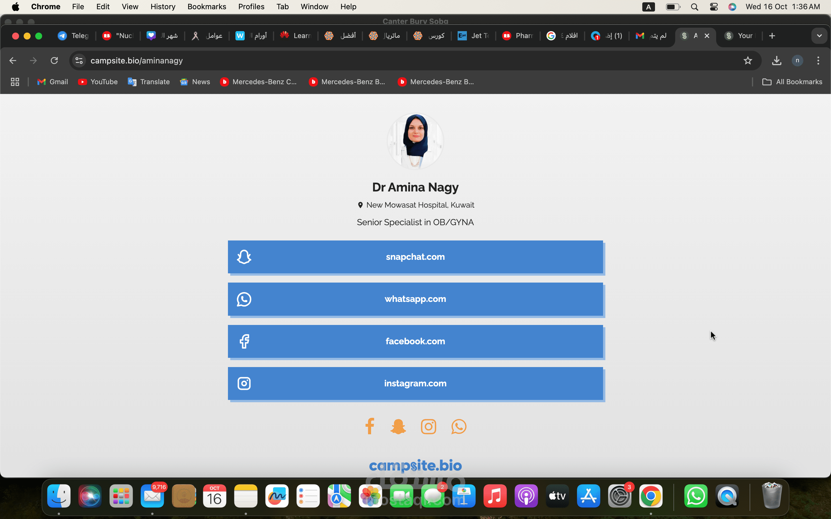 تم عمل qr code لطبيبة يشمل جميع مواق التواصل الاجتماعي مثل الفيس بوك و الواتساب و الانستجرام و سناب شات. استخدمت موقع campsite.bio . تم عمل اكونت خاص للطبيبه باستخدام جميع بيانتها مثل الايميل الشخصي و رقم الهاتف و الوظيفة و مكان العمل و صوره لها ليظهر في ملف التعريف. تم ربط صفحات التواصل الاجتماعي الخاص بالطبيبة مثل الفيس بوك و انستجرام و سناب شات و الواتس اب ايضا ليظهرو في ملف. التعريف، ثم تحويل كل هذا الي qr code . بشكل خاص باللون الاسود و يتوسطه صوره للطبيبه ليكون خاص بها مع امكانية توافر رابط ليظهر من خلاله كل ما يضر من الكود لاستخدام الاثنين عند الحاجه.