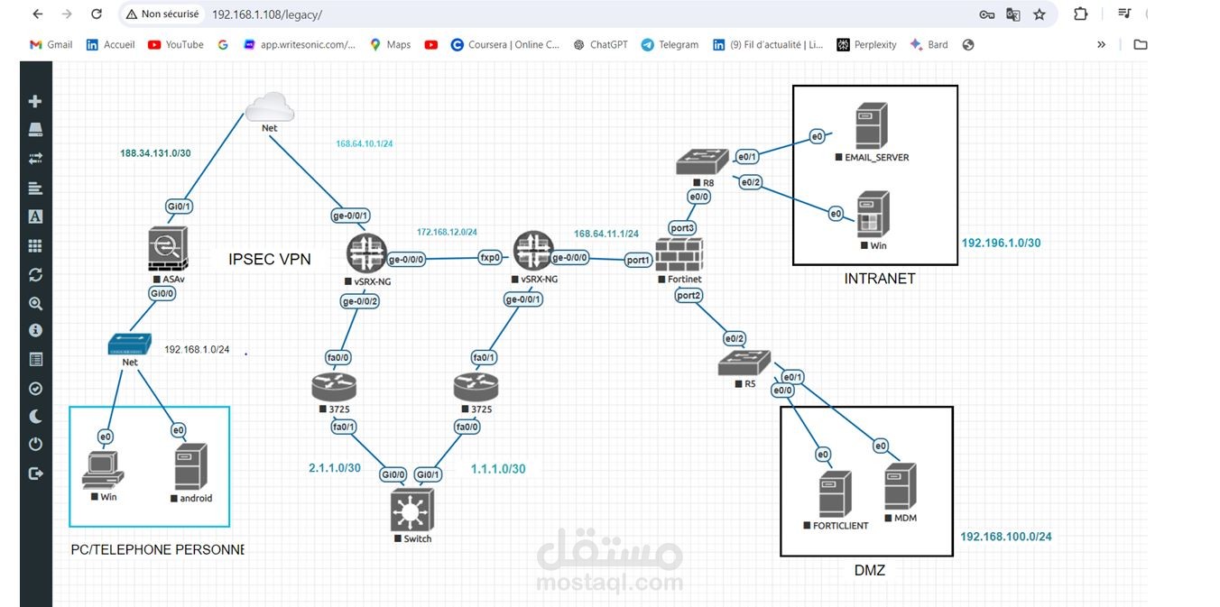 الحل المقترح لنظام BYOD (احضر جهازك الخاص) يستفيد من بنية تحتية آمنة ومُجَرَّدَة لإدارة أجهزة الموظفين الشخصية بكفاءة، مما يضمن اتصالاً مستقراً وأمنًا قويًا. يستخدم الحل بنية تحتية مُجَرَّدَة تجمع بين بيئات EVE-NG وVMware لاختبار الاتصال والأمن وقدرات إدارة الأجهزة: