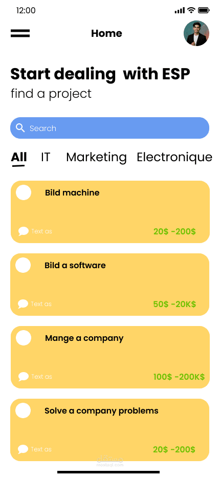 نظرة عامة: تطبيق EspApp هو تطبيق متعدد الاستخدامات مصمم لربط المستخدمين بمجموعة واسعة من فرص المشاريع في مجالات مثل تكنولوجيا المعلومات والتسويق والإلكترونيات. يتيح التطبيق للمستخدمين تصفح واختيار المشاريع التي تتنوع من بناء البرمجيات إلى إدارة الشركات. الهدف الرئيسي للتطبيق هو مساعدة الأفراد أو الفرق على "الاستفادة القصوى من الوقت" من خلال تزويدهم بمشاريع تناسب مهاراتهم واهتماماتهم.