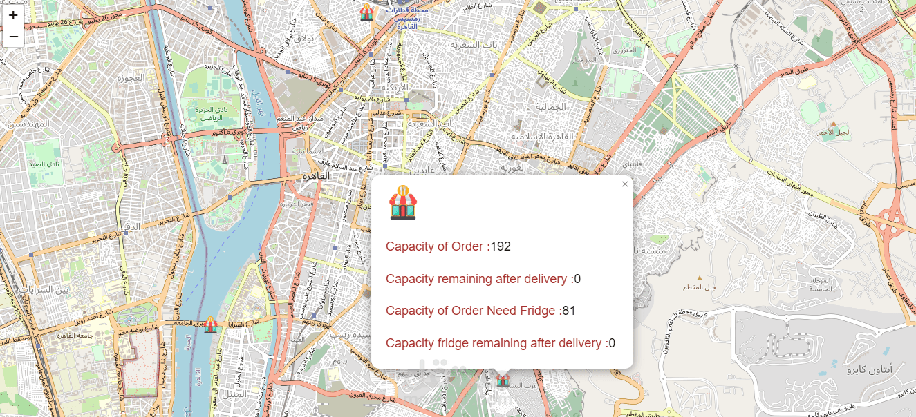 يتم عرض المتاجر والمركبات بشكل عشوائي على خريطة تفاعلية باستخدام Google Maps، حيث يمكن للمستخدمين تمرير المؤشر على العناصر للحصول على معلومات فورية عن المتاجر أو المركبات. بالإضافة إلى ذلك، يتابع النظام سعة المركبات ويقوم بتحديثها أثناء استلام الطلبات، مع تتبع الطلبات التي تحتاج إلى تبريد. كما يدير المحاكاة السعة الإجمالية للطلبات المتبقية حتى بعد عملية التوصيل.